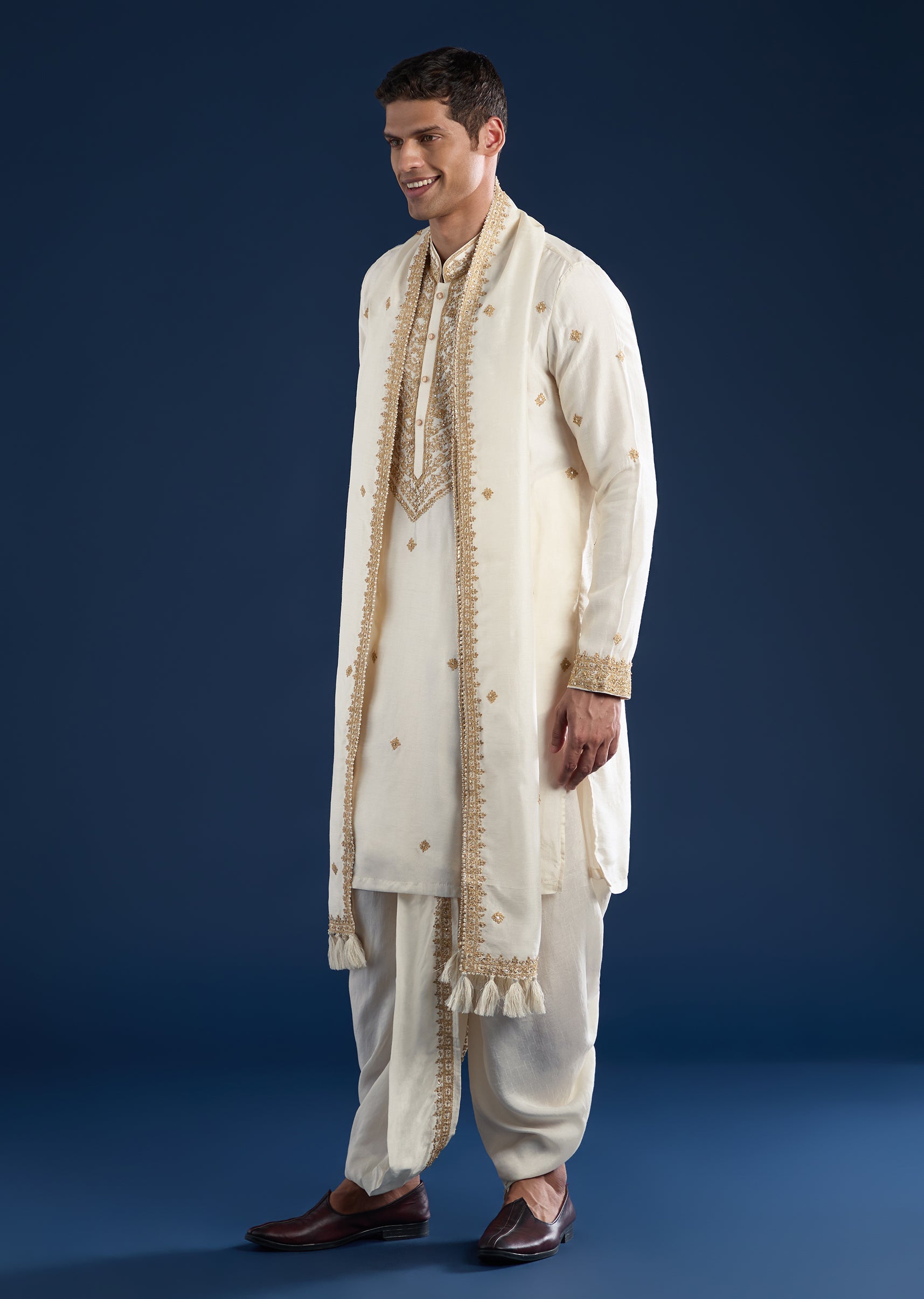 Cream Embellished Kurta with Dhoti & Dupatta Set