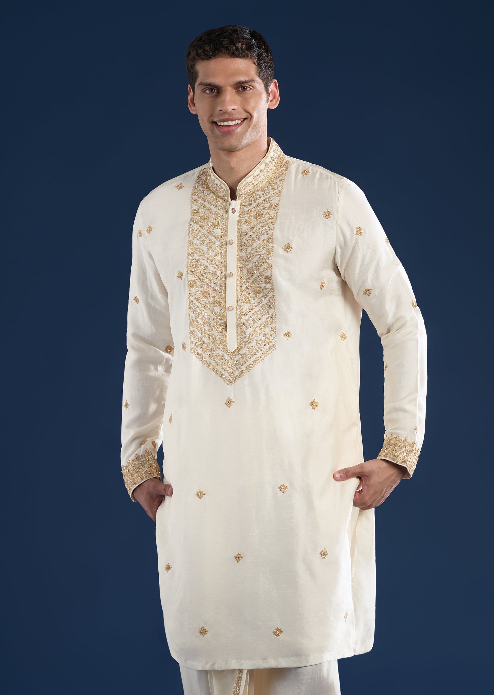 Elegant and ceremonial, this cream kurta set is designed for wedding occasions. Crafted in rich silk, it features intricate dori work, resham thread, and zari detailing for a regal finish.... More Product Details