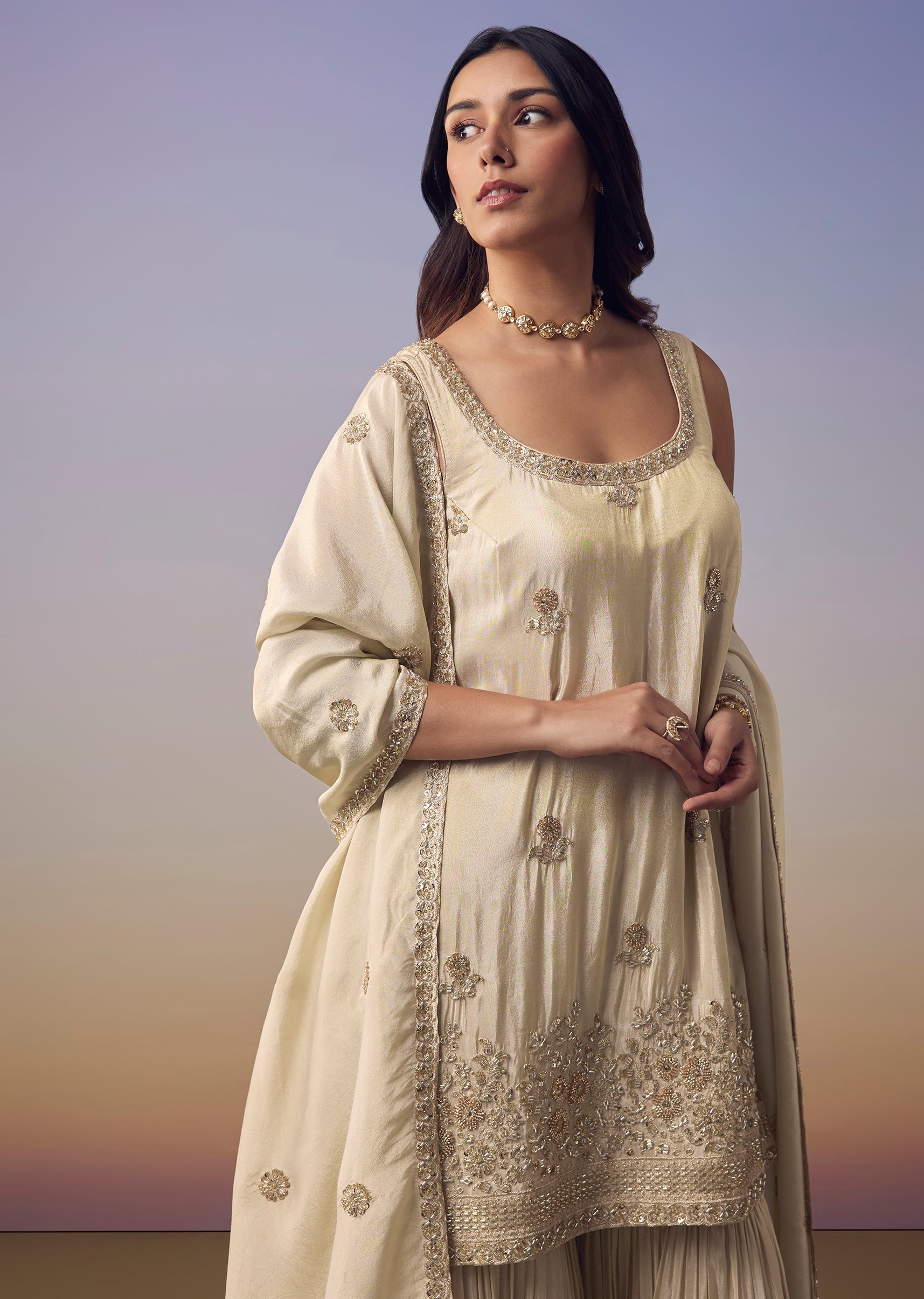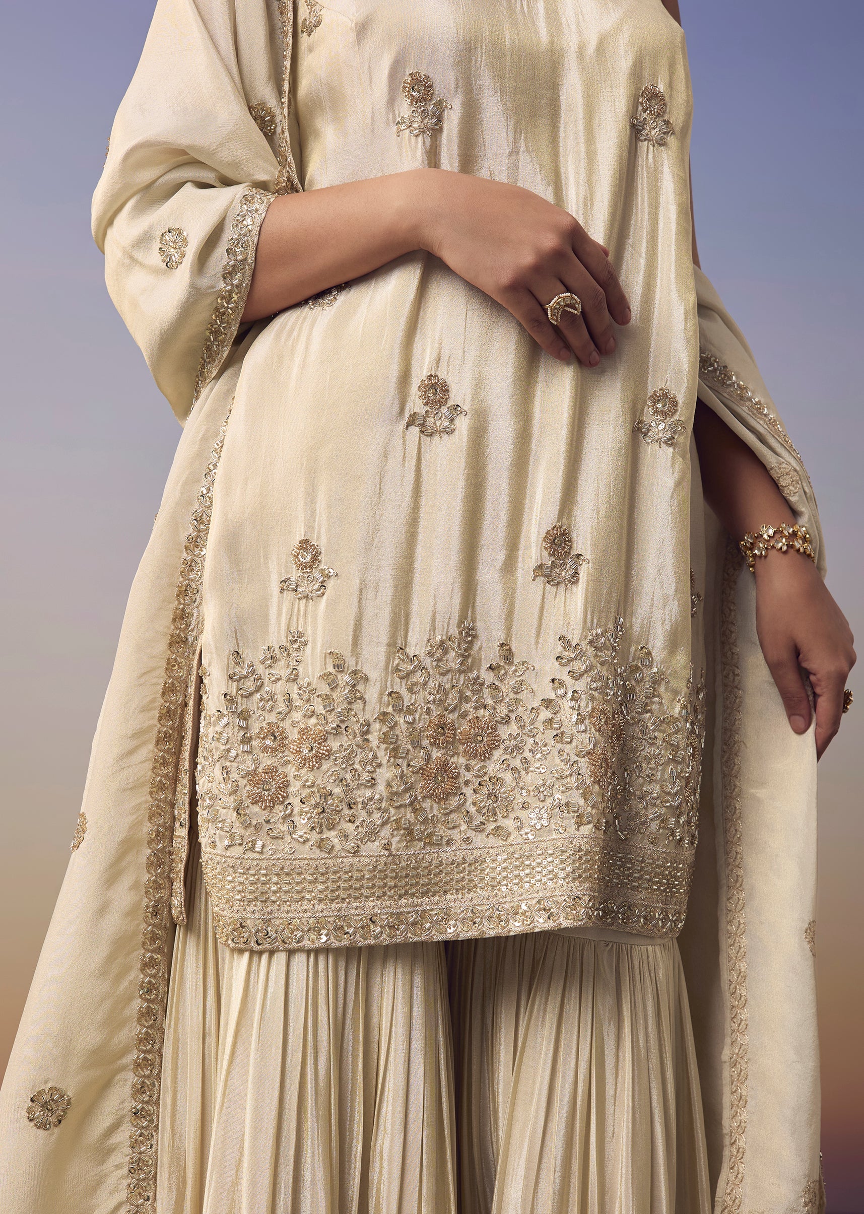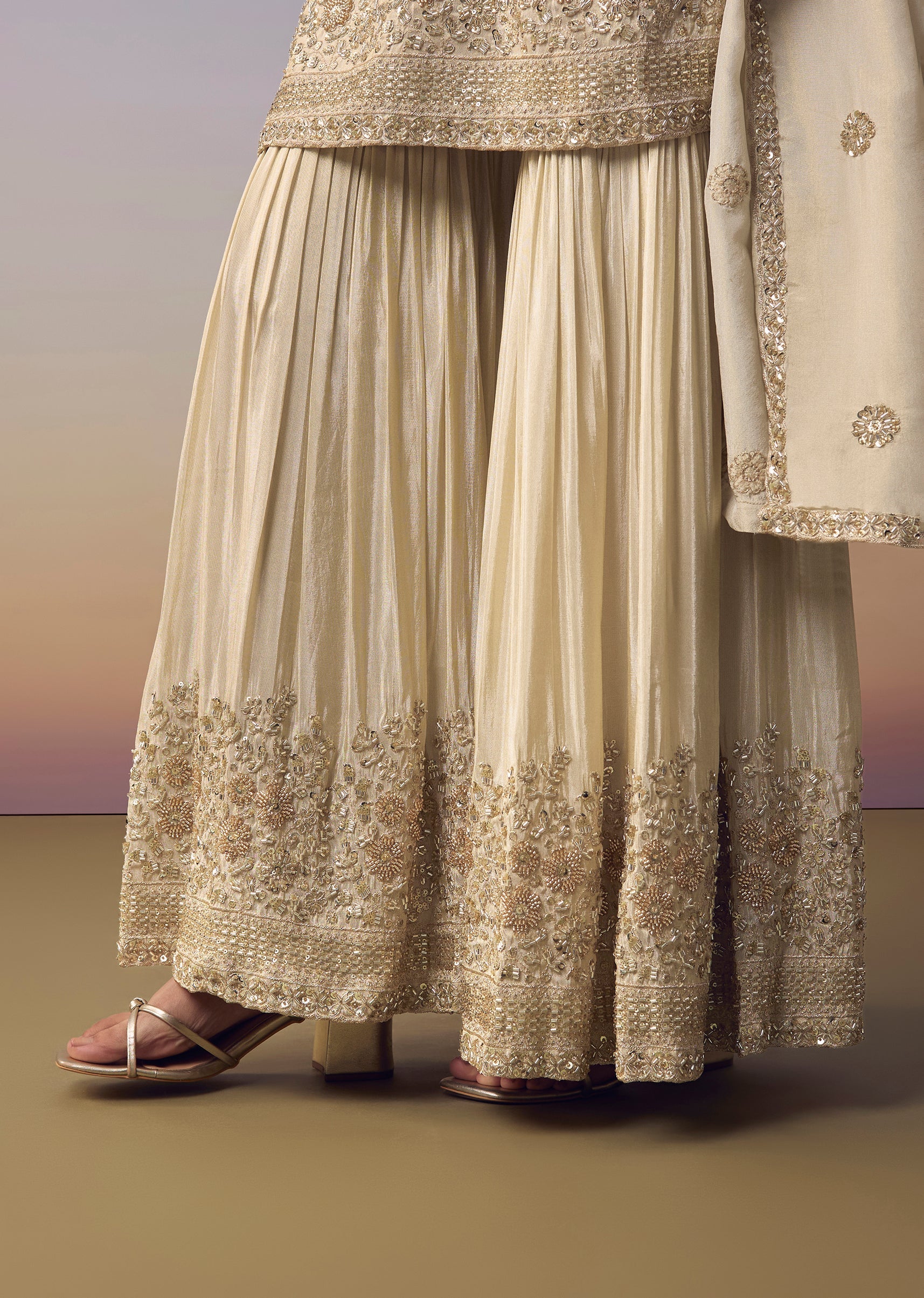Celebrate in effortless elegance with this tissue kurta and sharara set embellished with delicate bead work, shimmering sequins, and fine embroidery that add a refined festive glow. The sleeveless round... More Product Details