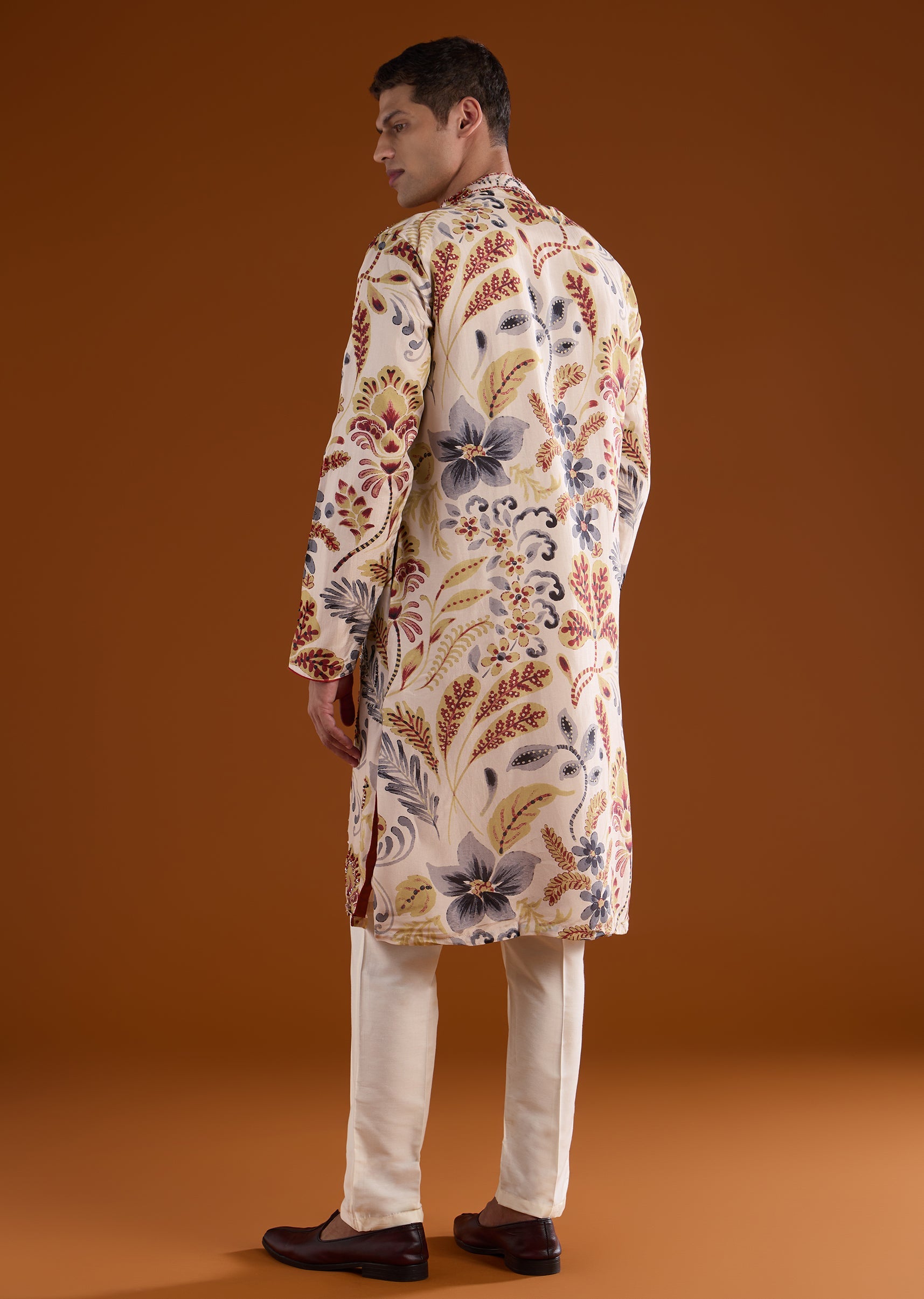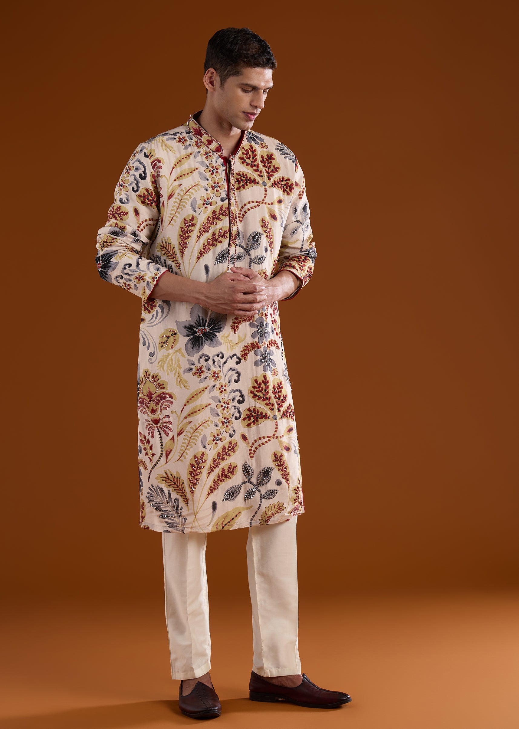 Gracefully festive with delicate detailing, this cream kurta set is crafted in rich rawsilk for an elevated traditional look. The kurta features a mandarin collar, full sleeves, and side slits,... More Product Details