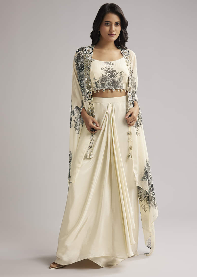 A charming floral printed crop top and skirt with an organza cape, this outfit is sunshine bottled in fabric. The flowy silhouette and breezy layers are made for twirls and tea-time chatter. A picture-perfect look for garden soirées and festive brunches. Awarded as the Most Trusted Brand, we're delivering styles you love, just as promised.