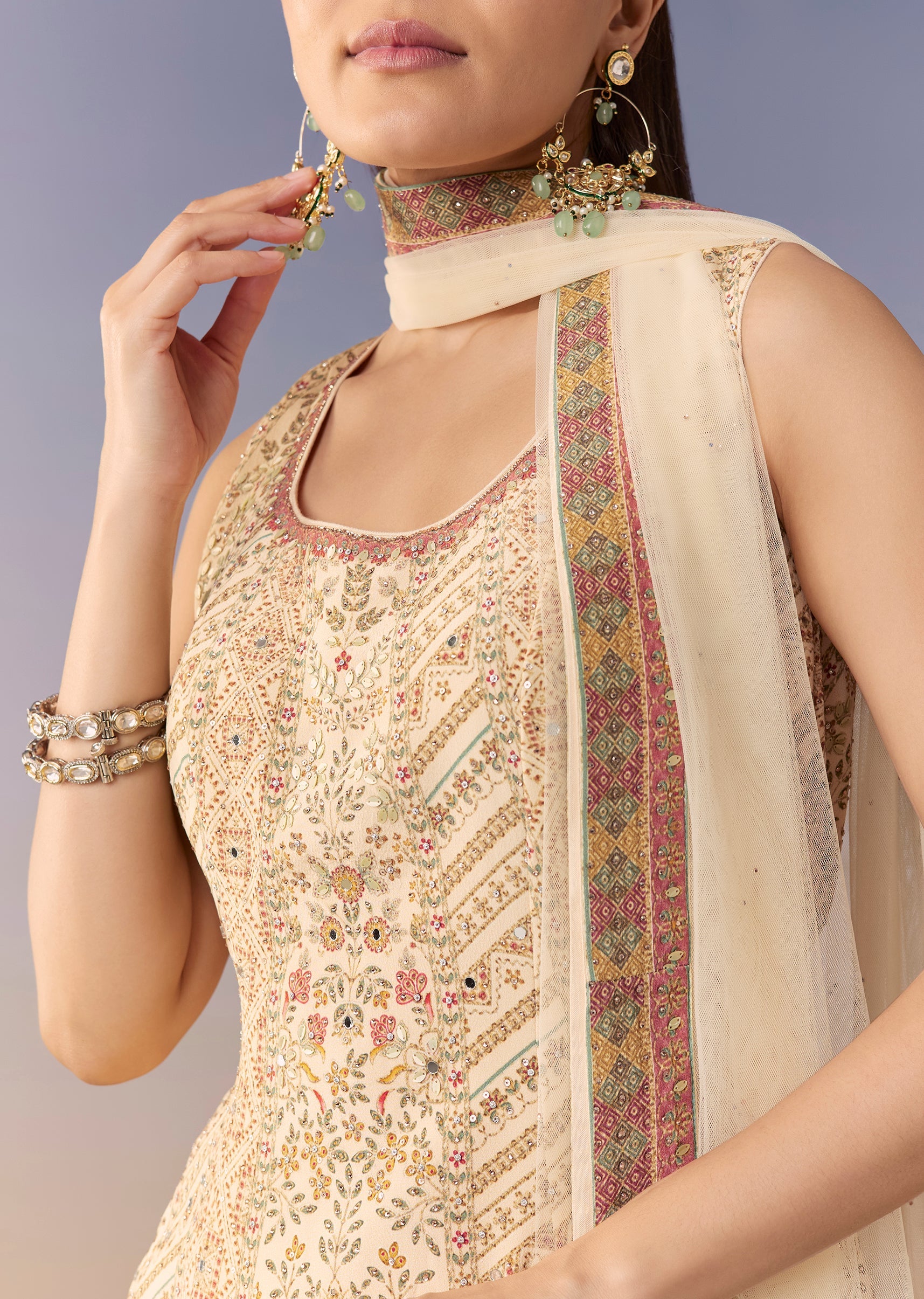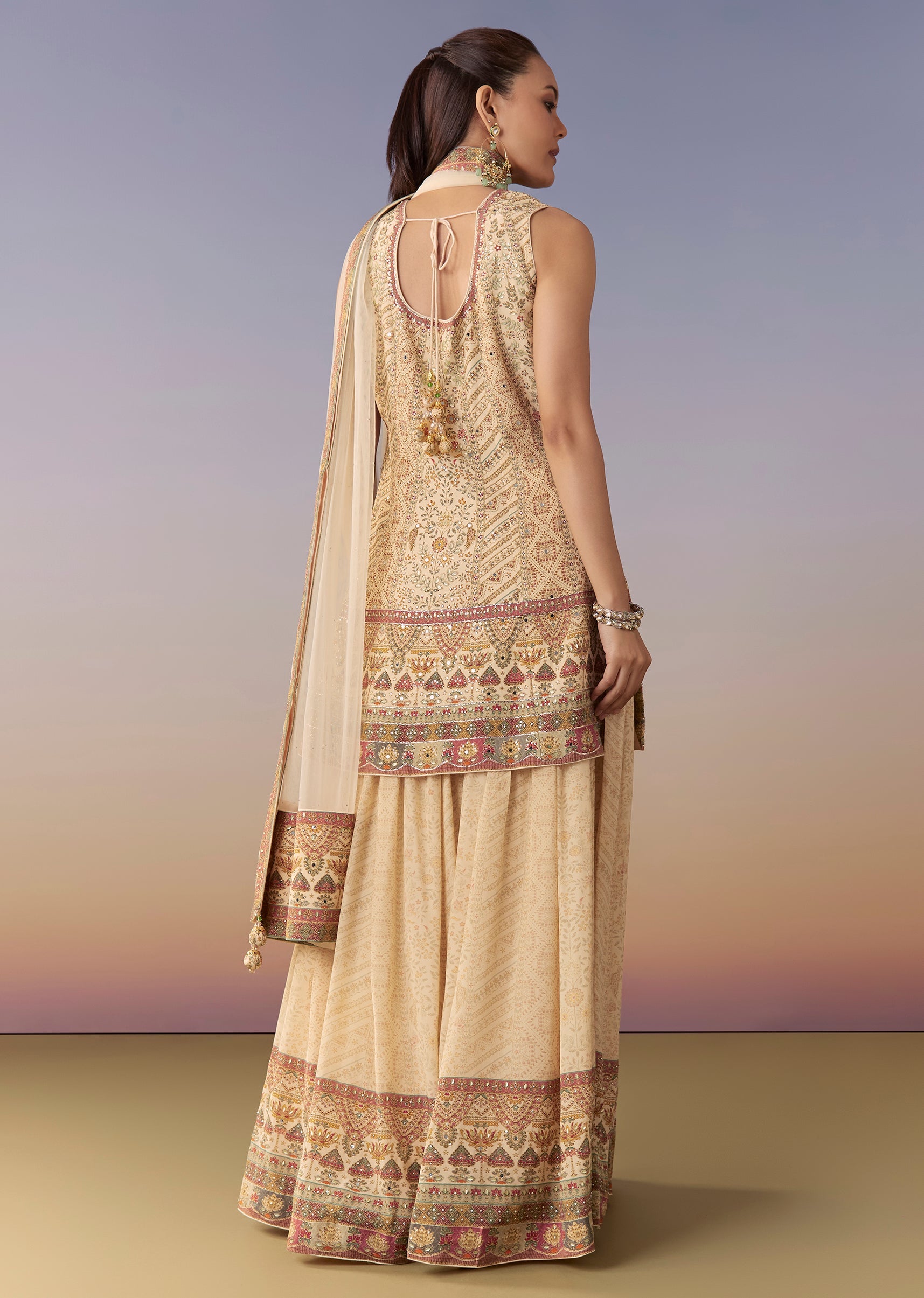 Crafted in crepe, this sleeveless straight kurta features floral prints finished with subtle sequin work. Designed with a round neckline and side zip closure, it comes with a mid-waist palazzo... More Product Details
