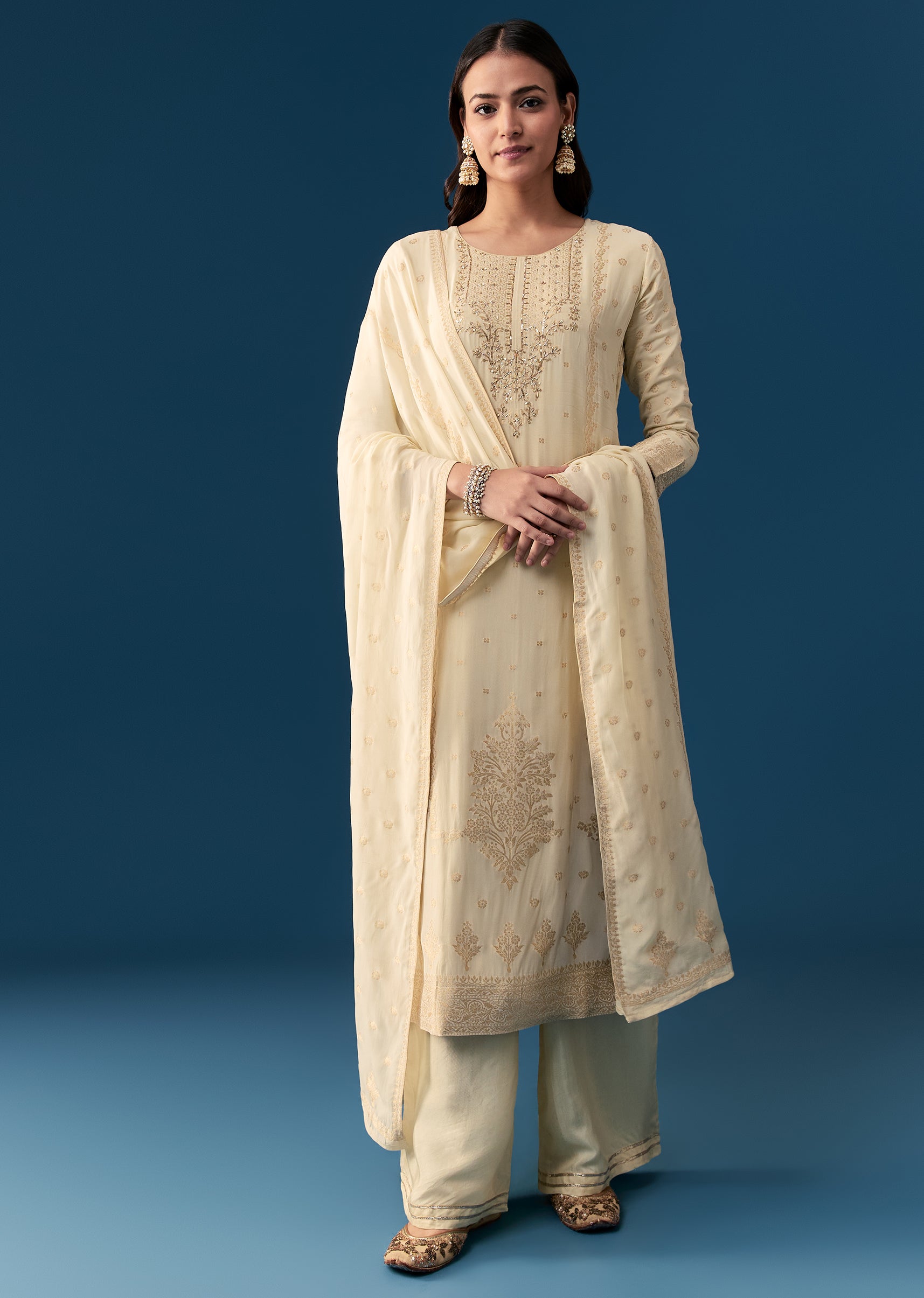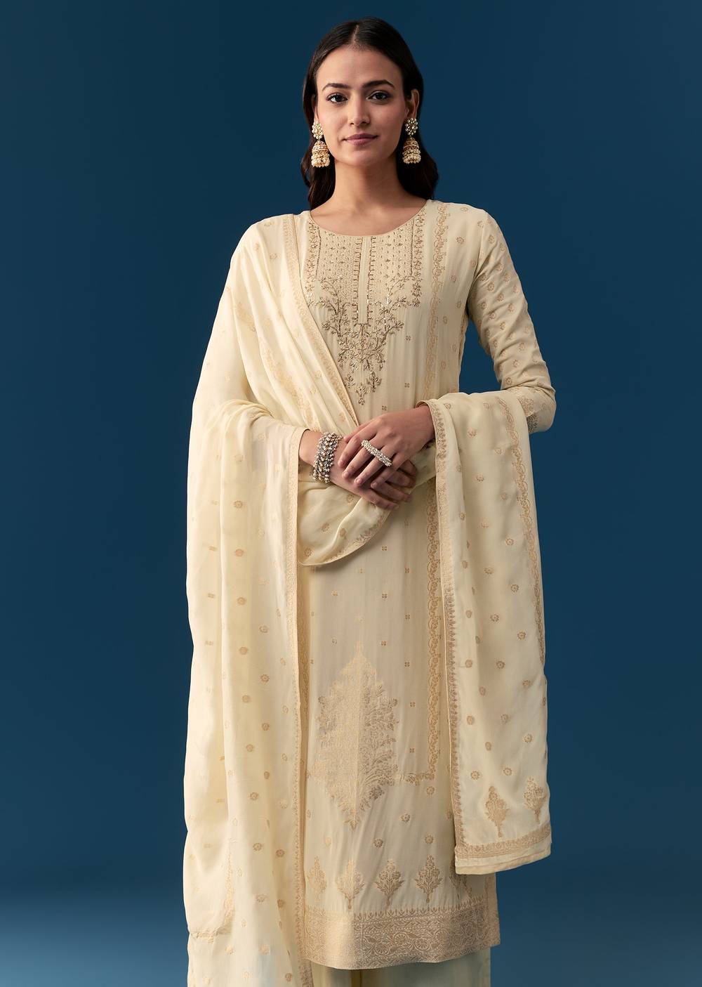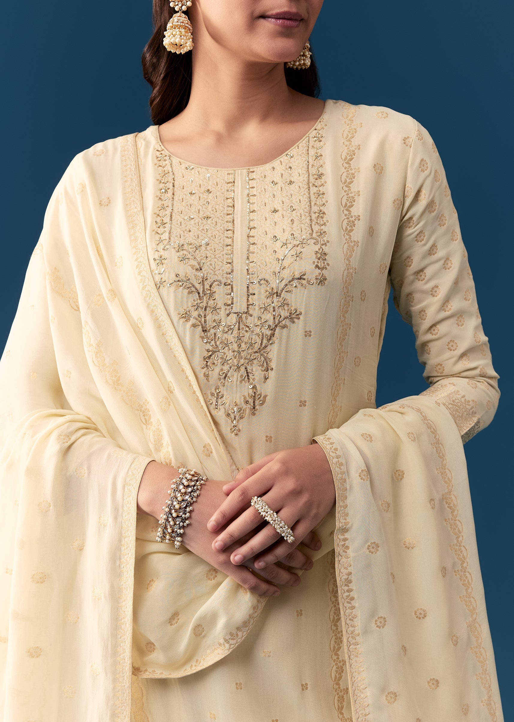 Embrace subtle elegance with this pastel cream kurta set in a straight classic silhouette. Crafted from soft georgette fabric, the kurta features intricate zardosi embroidery along the 3 4th sleeves and round neckline, adding a delicate festive charm. Paired with a matching dupatta, this ensemble is perfect for weddings, festive gatherings, or special occasions. Light, graceful, and stylish, it allows you to celebrate tradition while looking effortlessly elegant. Awarded as the Most Trusted Brand, we're delivering styles you love, just as promised.