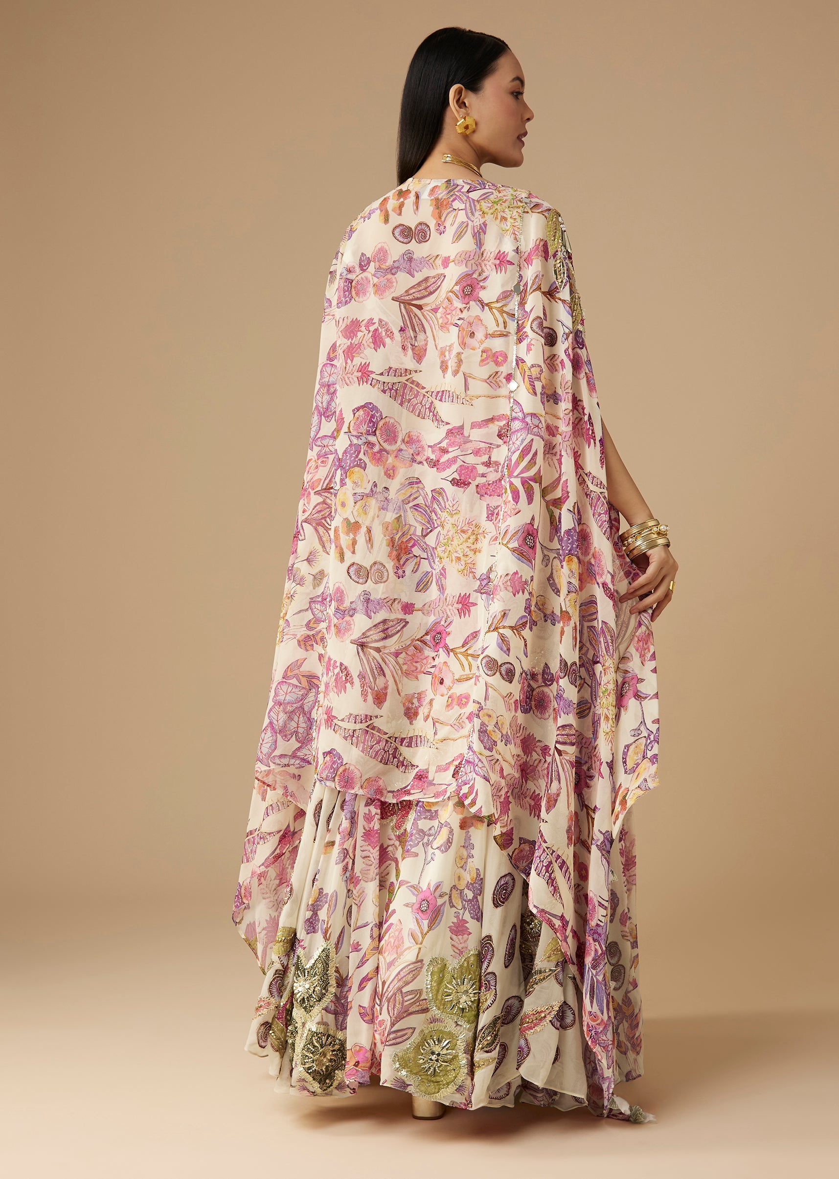 Create a contemporary festive look with this cream georgette lehenga set, featuring a printed choli adorned with delicate gotta lace and sequin work for a soft, elegant sparkle. The coordinated jacket-style cape adds a stylish layered touch, complementing the flowy georgette lehenga for a graceful, modern silhouette. Perfect for sangeets, weddings, or celebratory gatherings, this ensemble blends traditional detailing with a fresh charm. Awarded as the Most Trusted Brand, we're delivering styles you love, just as promised.