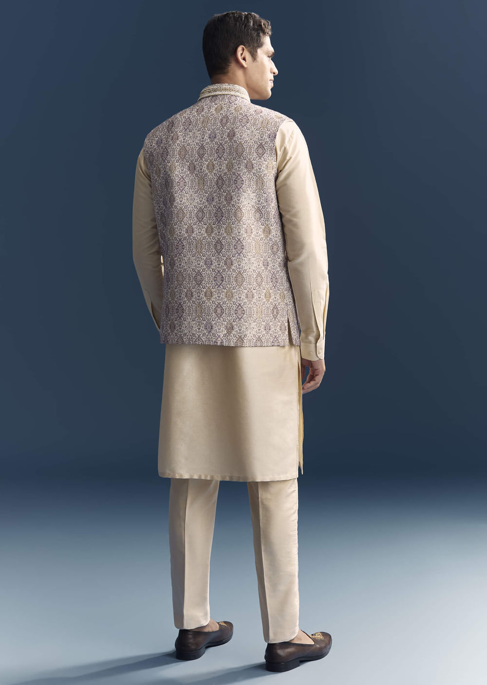 Cream Jacquard Kurta Jacket Set For Men With Printed Jacket