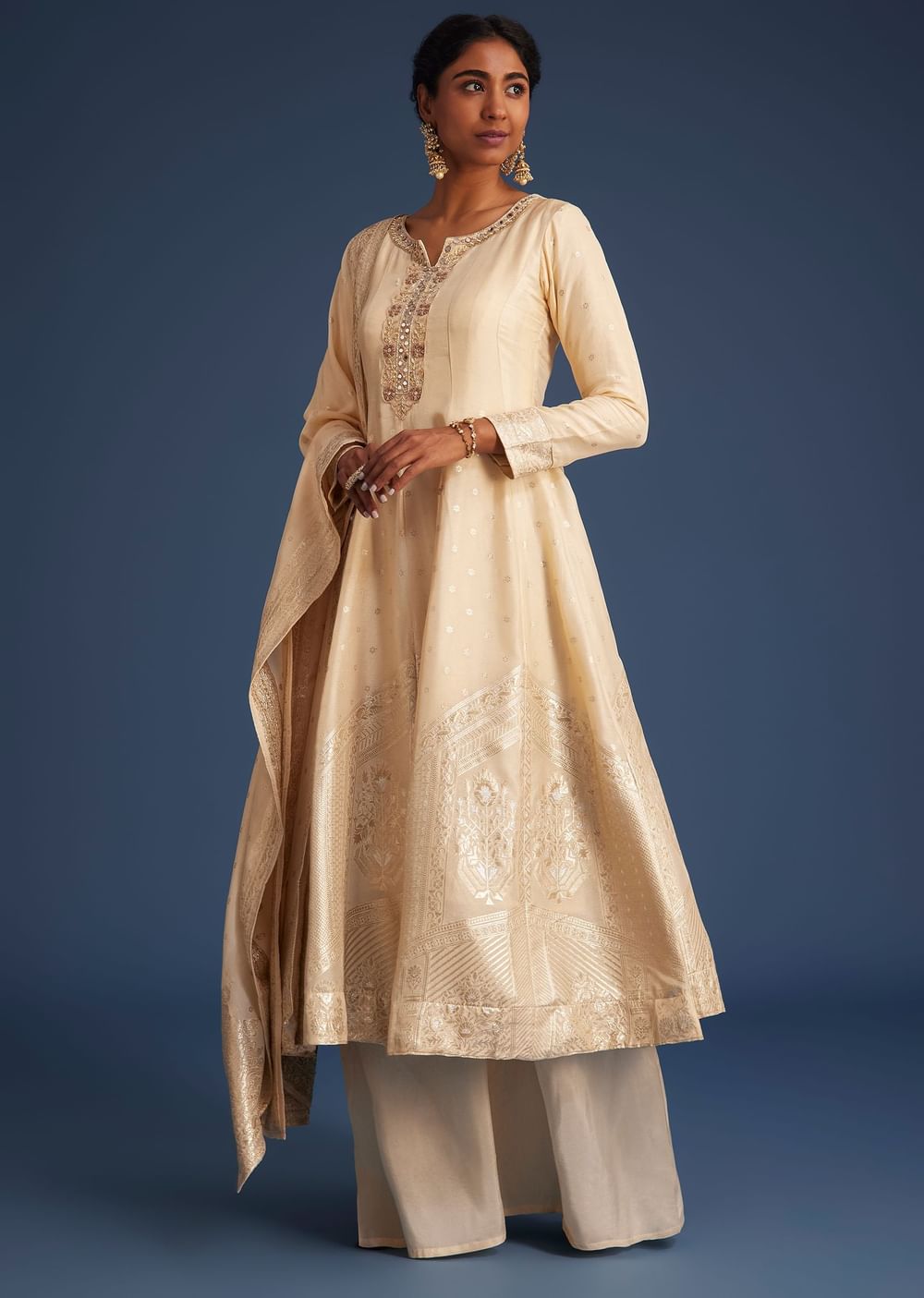 Cream Jacquard Kurta Set With Banarasi Silk Dupatta