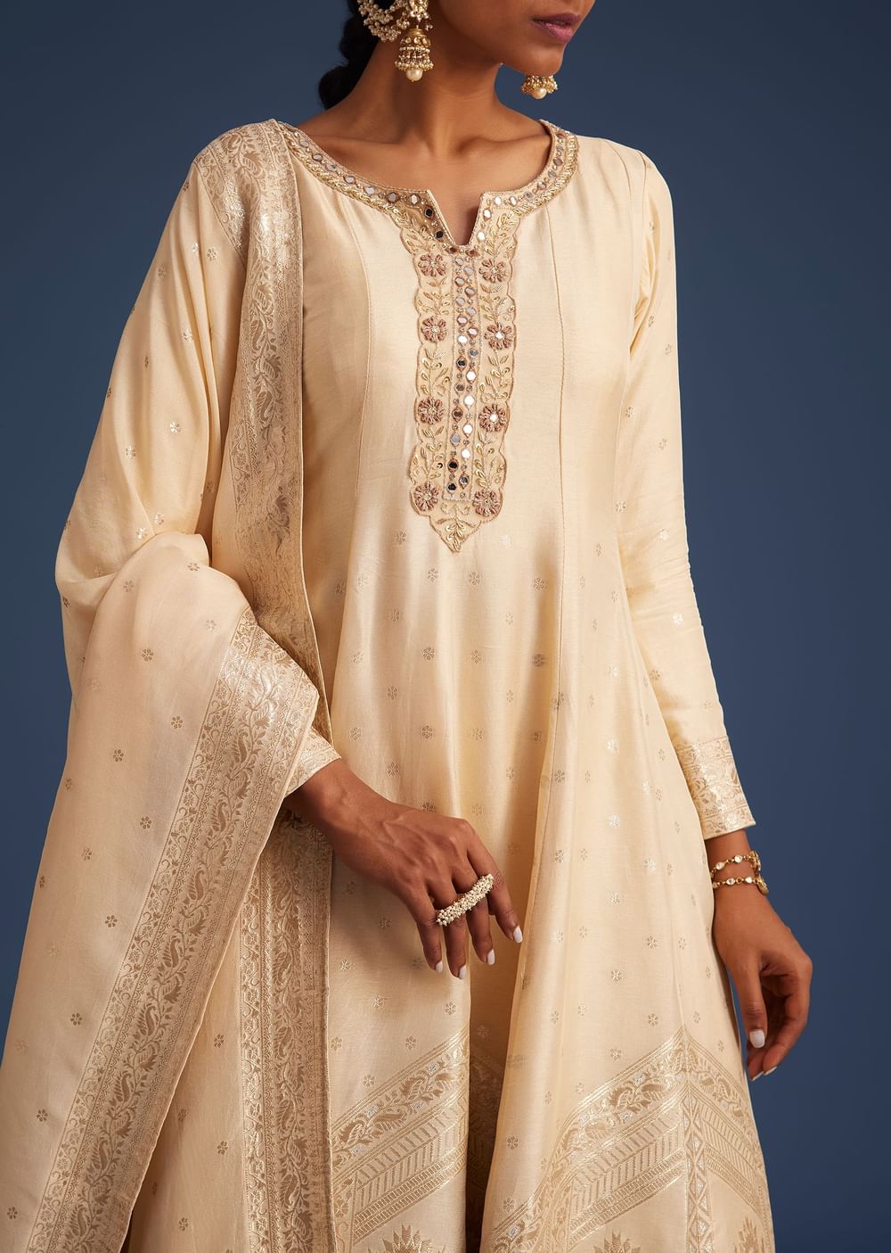 • Embrace Timeless Elegance With This Cream Jacquard Kurta Enriched With Intricate Mirror Zardosi Sequins And Thread Work.