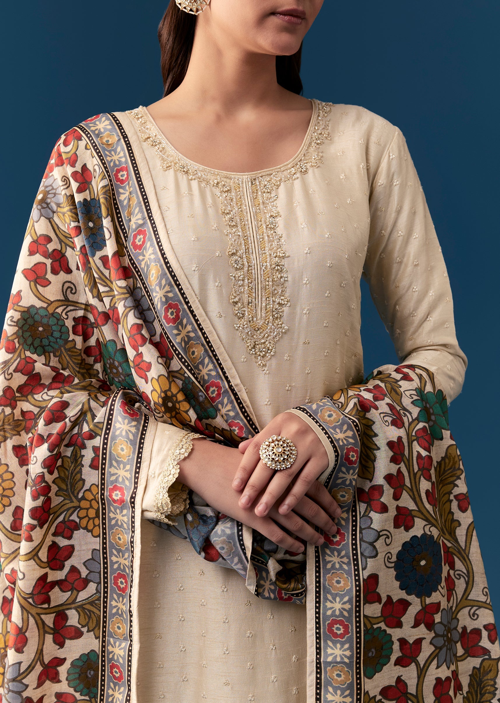 Cream Kurta Set With Resham And Moti Work