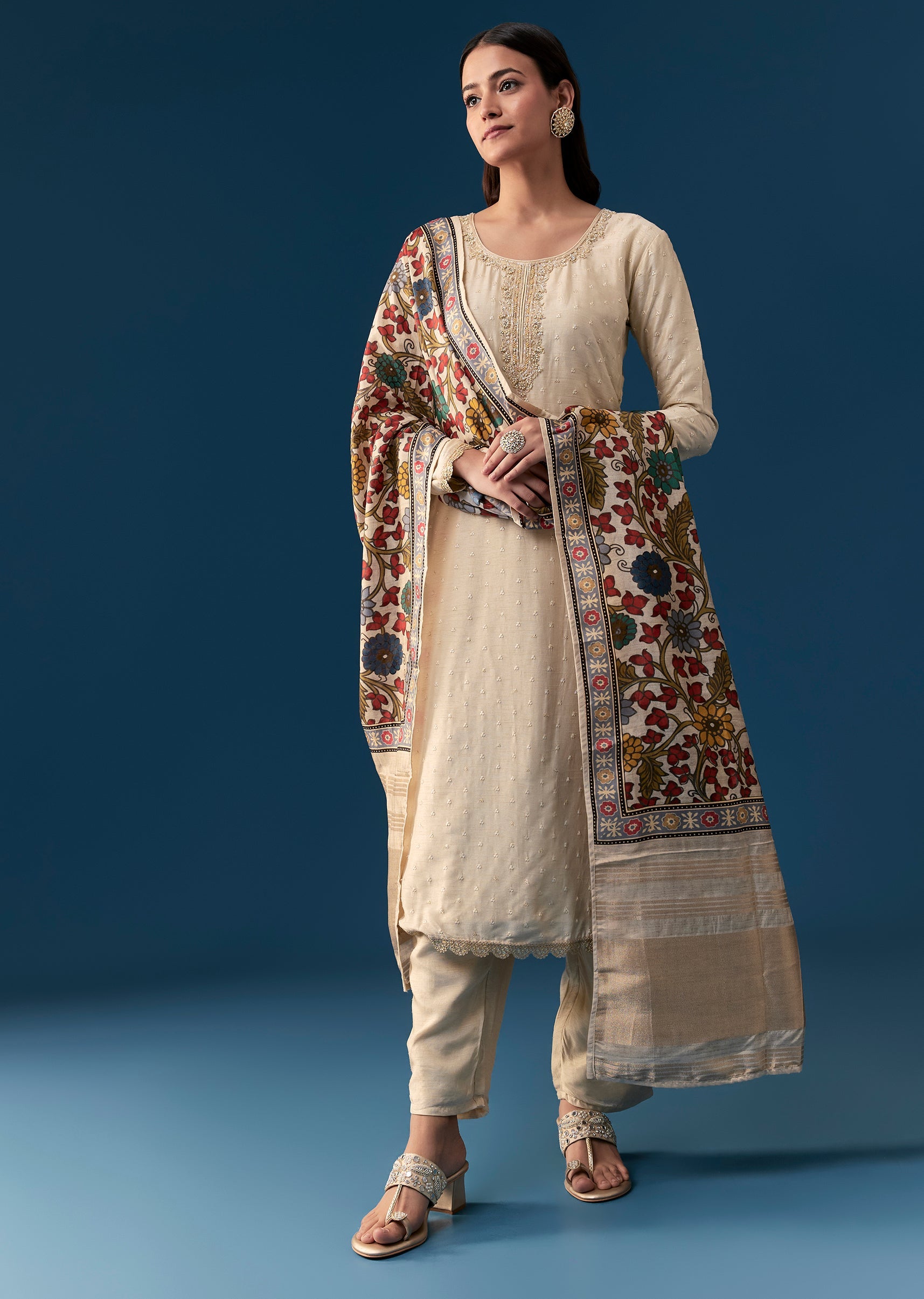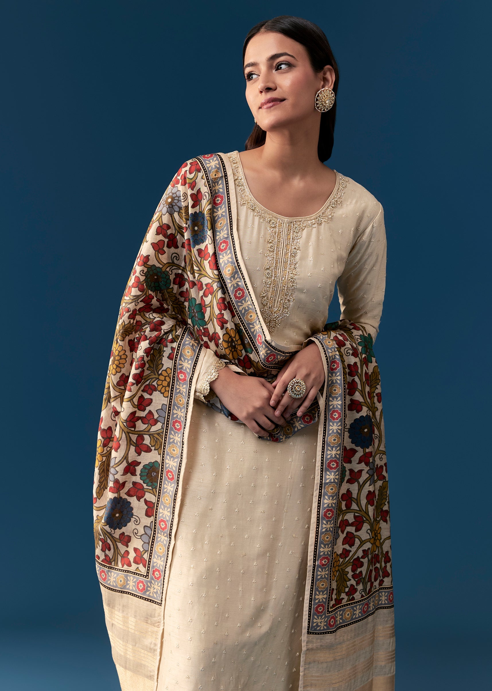 Exude timeless elegance with this cream kurta set adorned with intricate resham embroidery all over the kurta. The neckline is enhanced with delicate cut dana and moti work, adding a subtle festive charm. Featuring full sleeves and a round neckline, this set comes with a matching dupatta, making it perfect for weddings, festive gatherings, or special occasions. Light, graceful, and stylish, it allows you to celebrate tradition while looking effortlessly elegant.