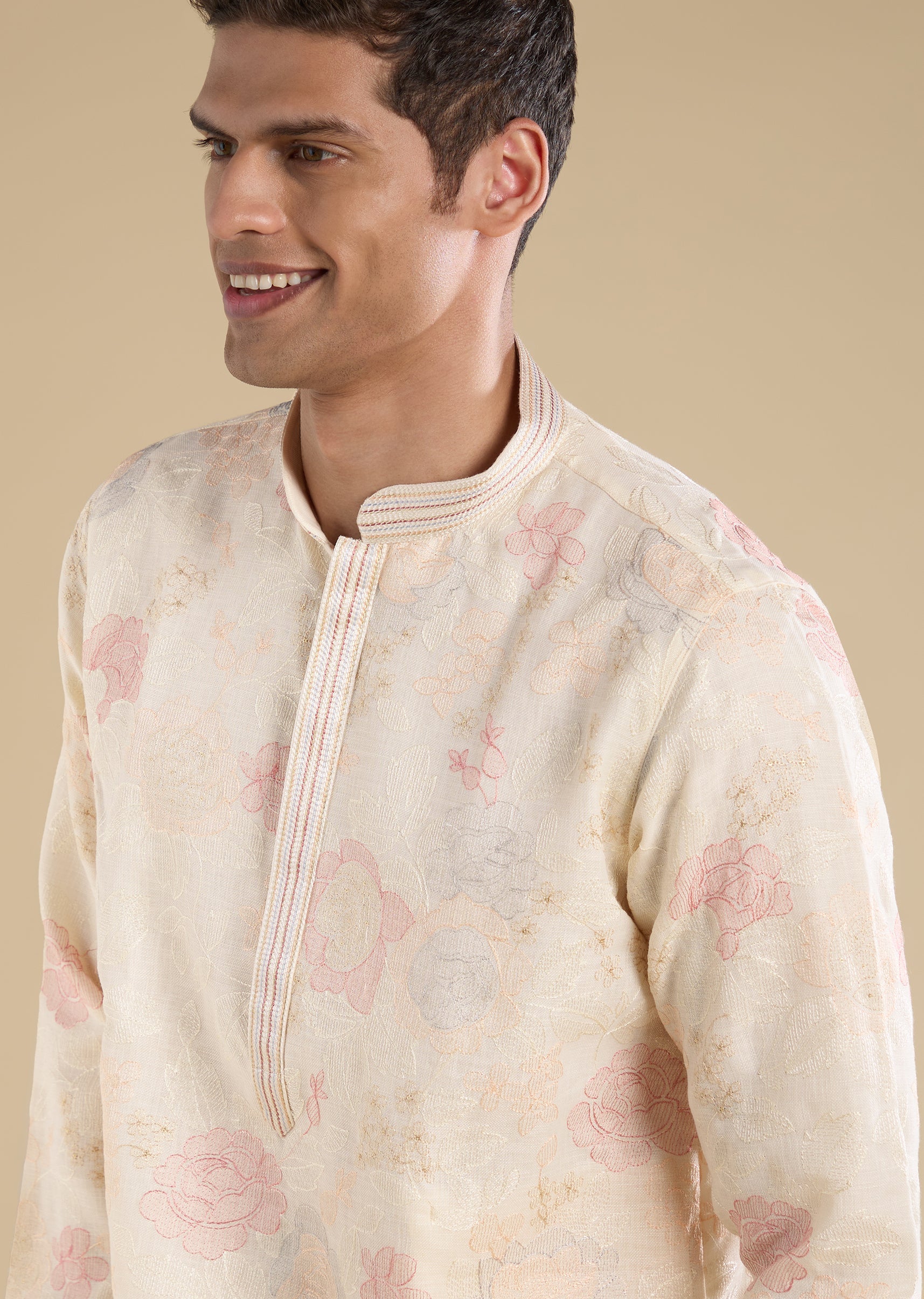 Clean and understated, this cream kurta set is ideal for casual and everyday traditional wear. Designed with a mandarin collar, full sleeves, and side slits, it features minimal resham thread... More Product Details