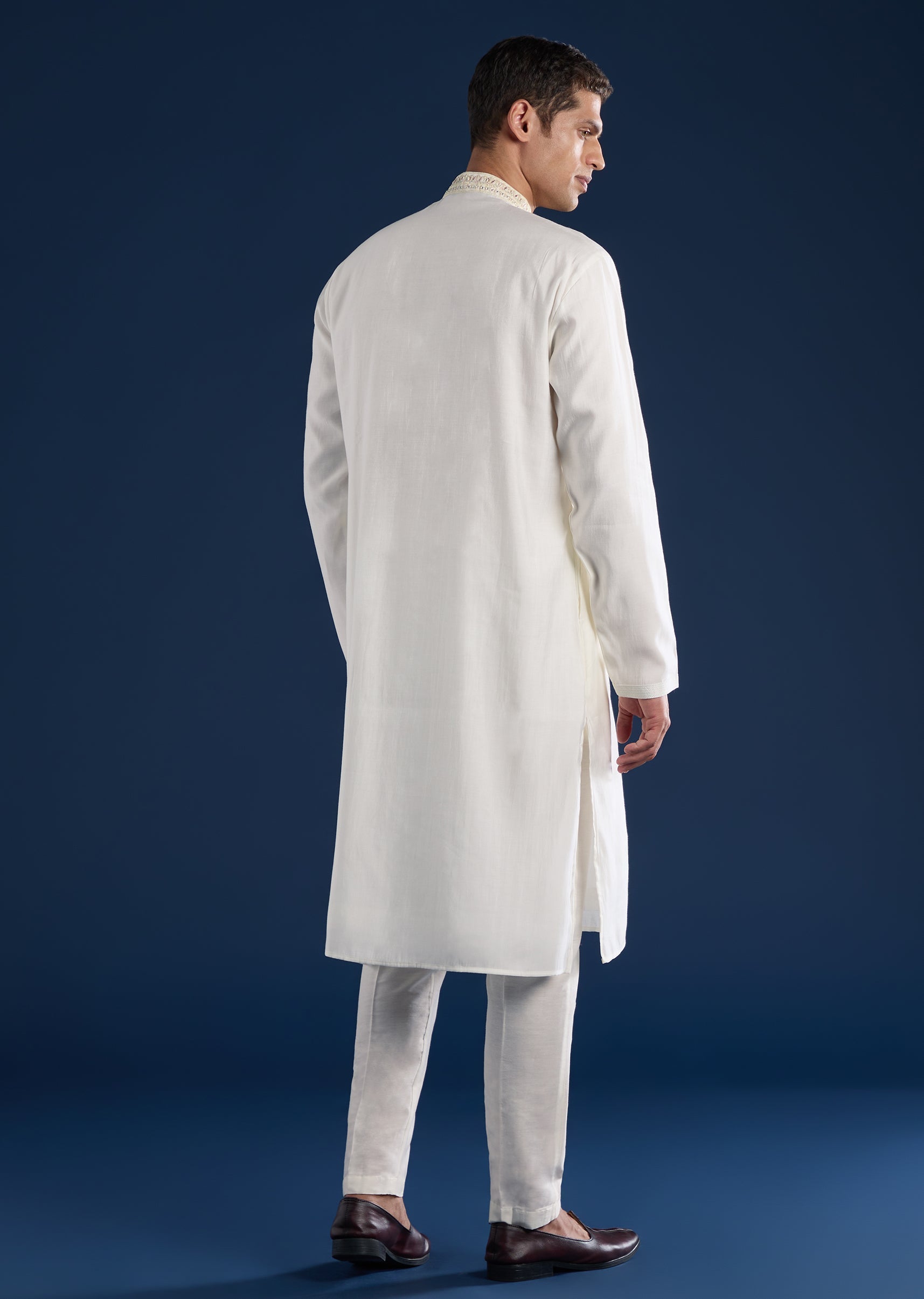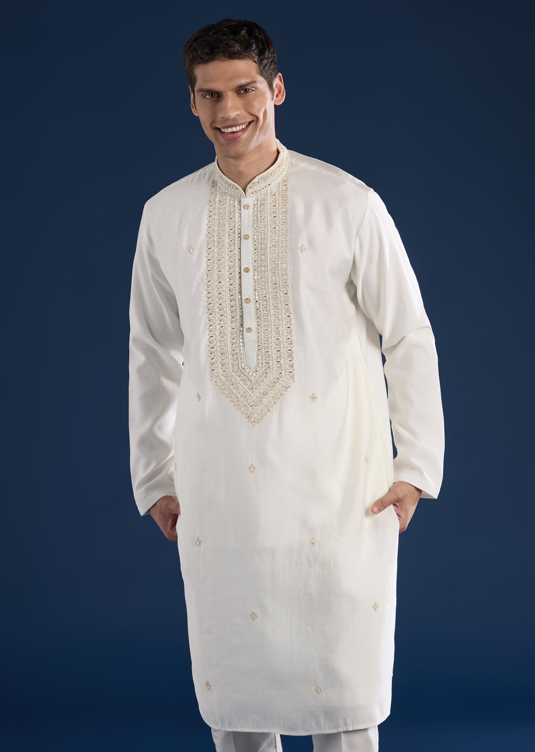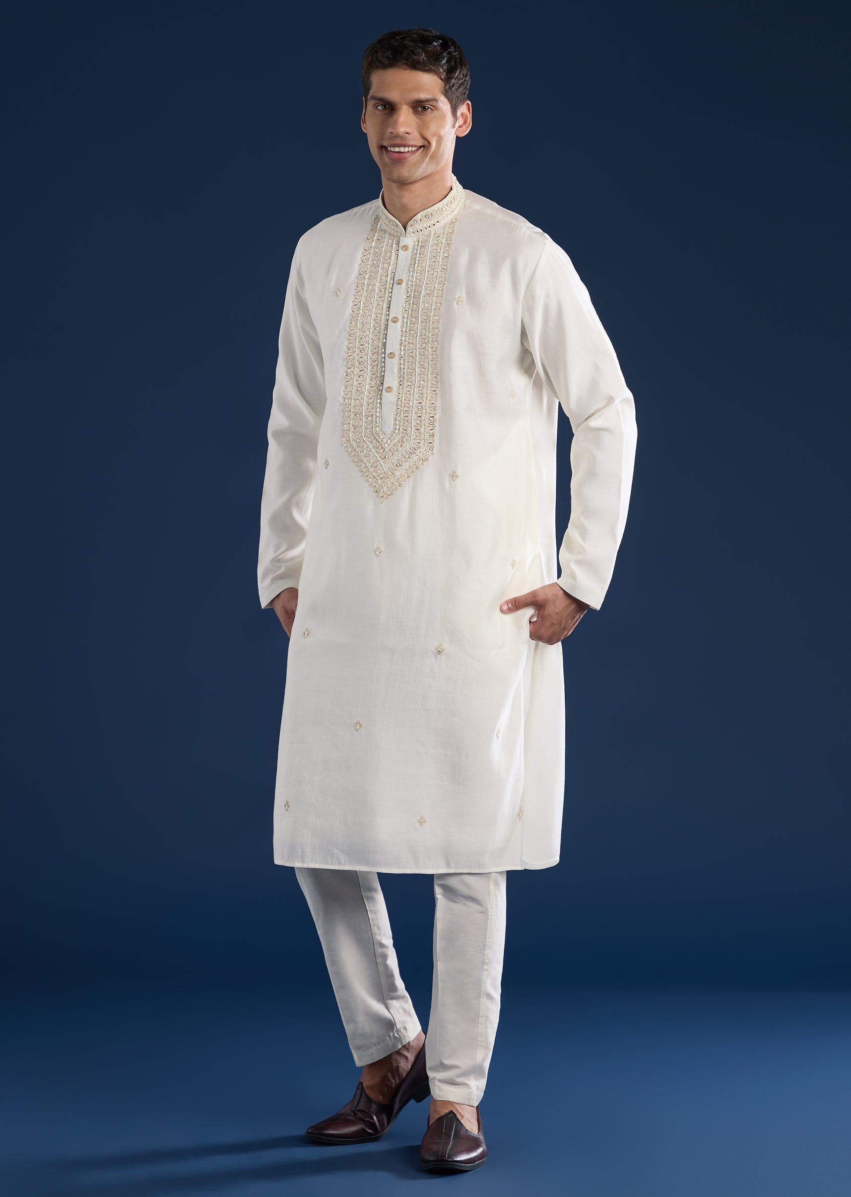 This cream kurta set is crafted in art silk and finished with resham thread and mirror accents for understated festive appeal. Designed with a mandarin collar, full sleeves, and side... More Product Details
