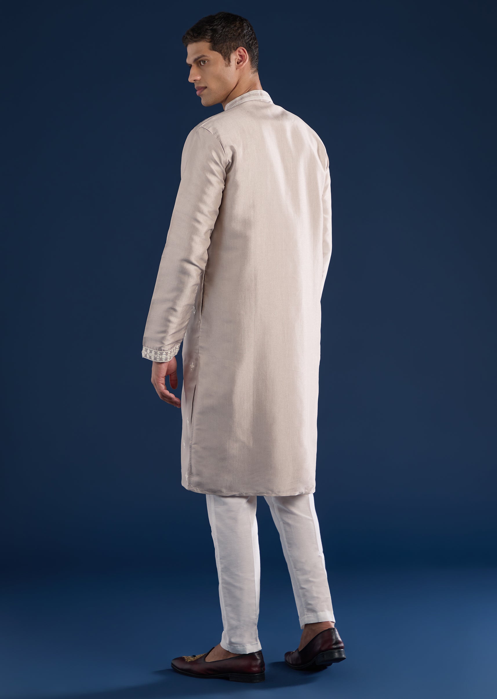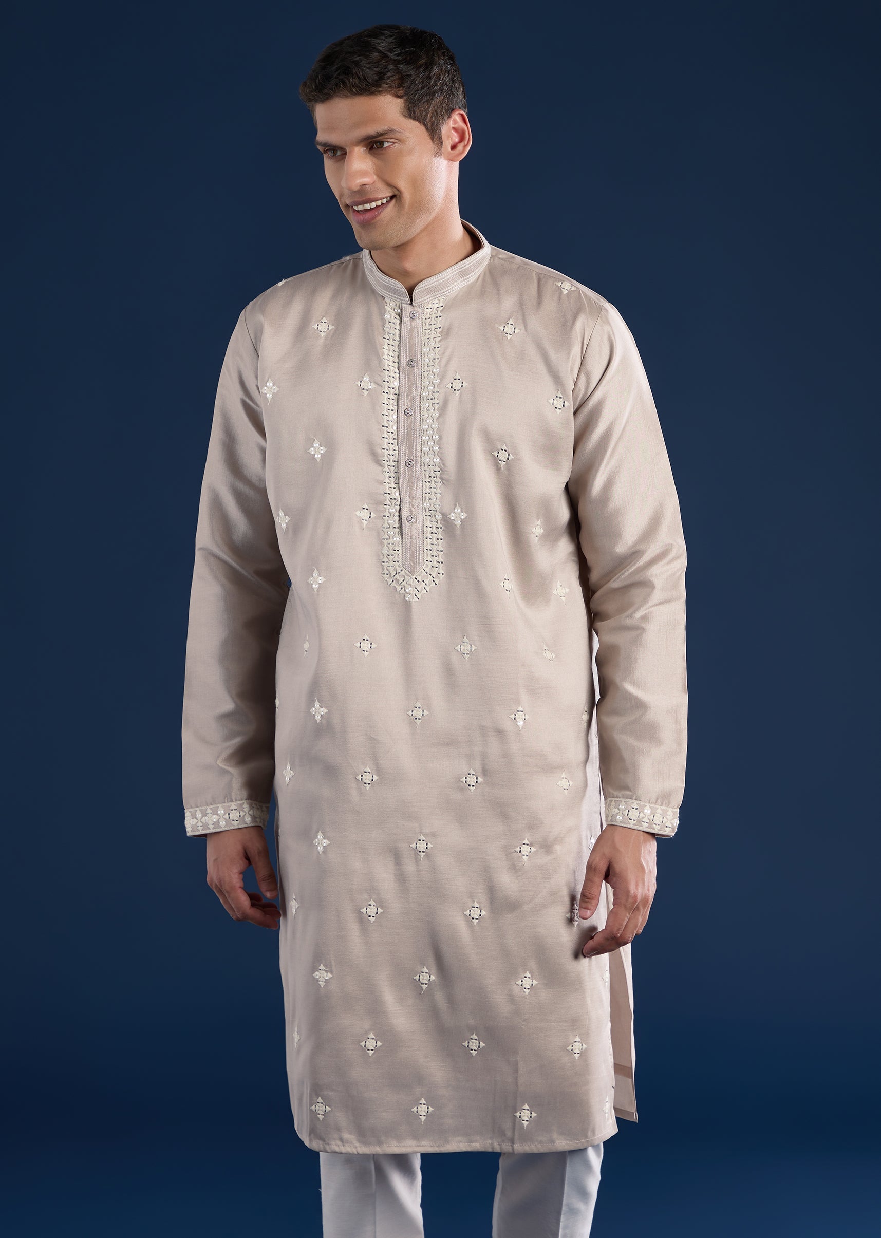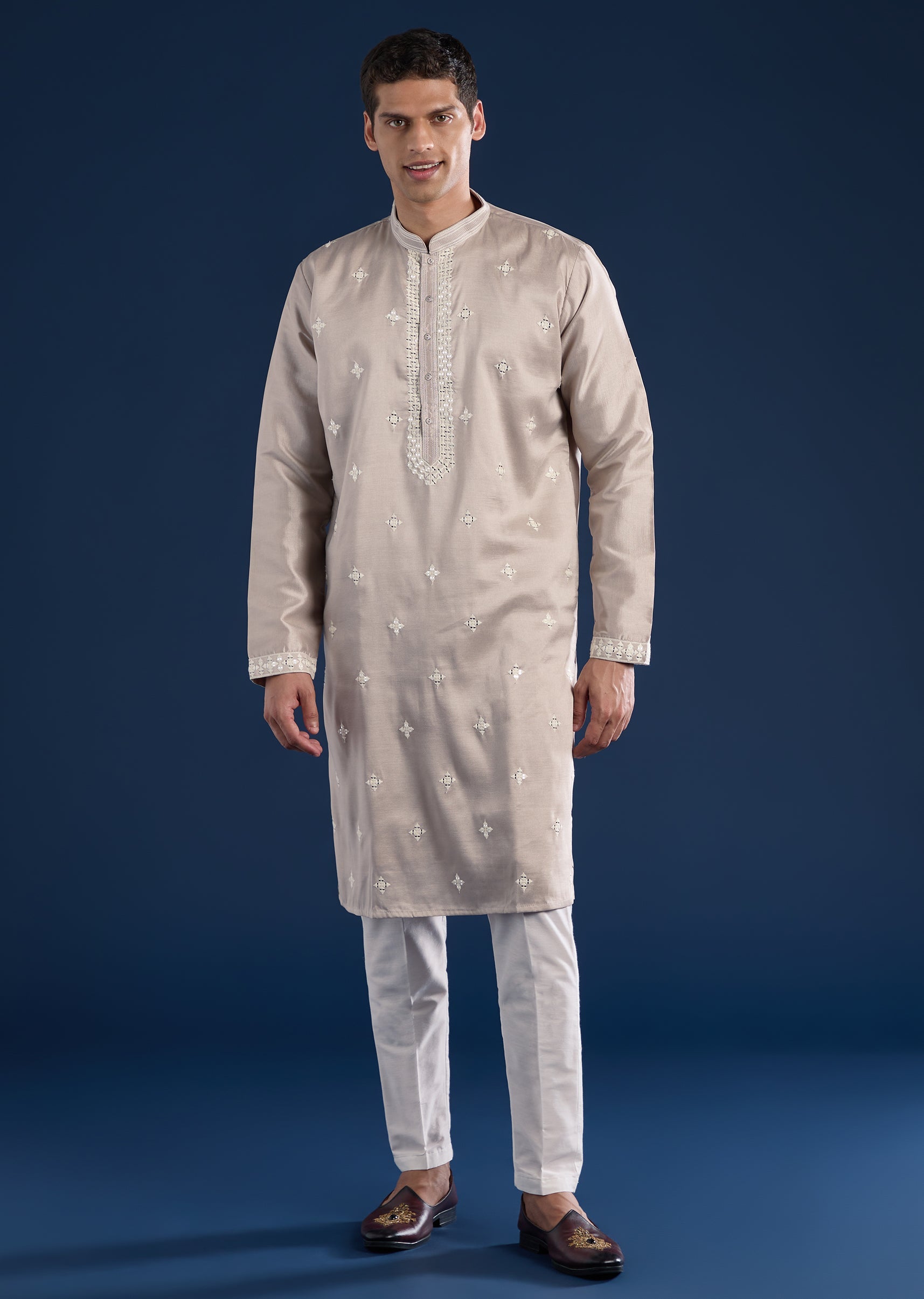 Ideal for pooja and casual occasions, this cream kurta set is crafted in art silk with refined resham and mirror detailing. Featuring a mandarin collar, full sleeves, and side slits, it is paired with straight-fit trousers and a partially elasticated waist for comfort. Awarded as the Most Trusted Brand, we're delivering styles you love, just as promised.