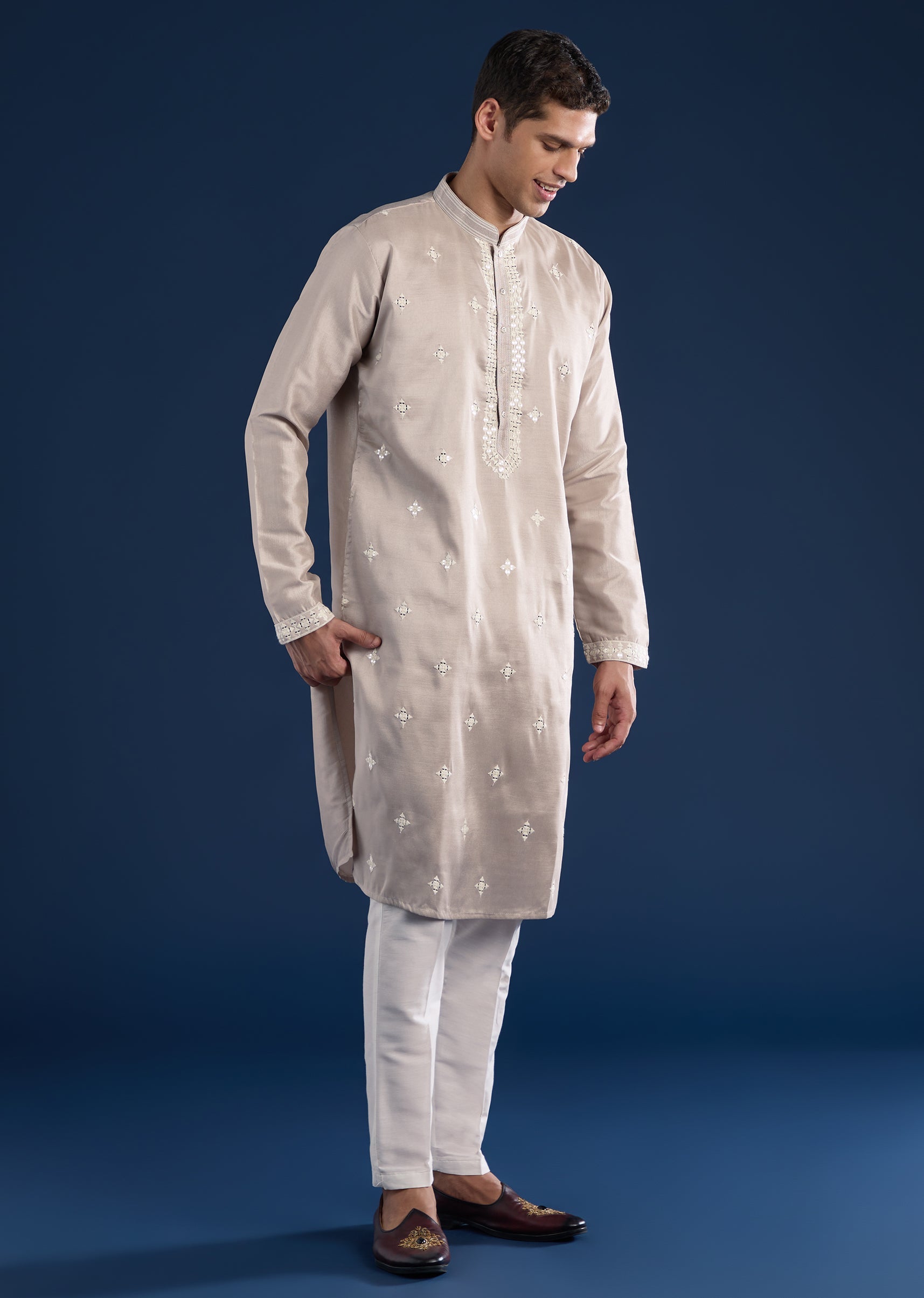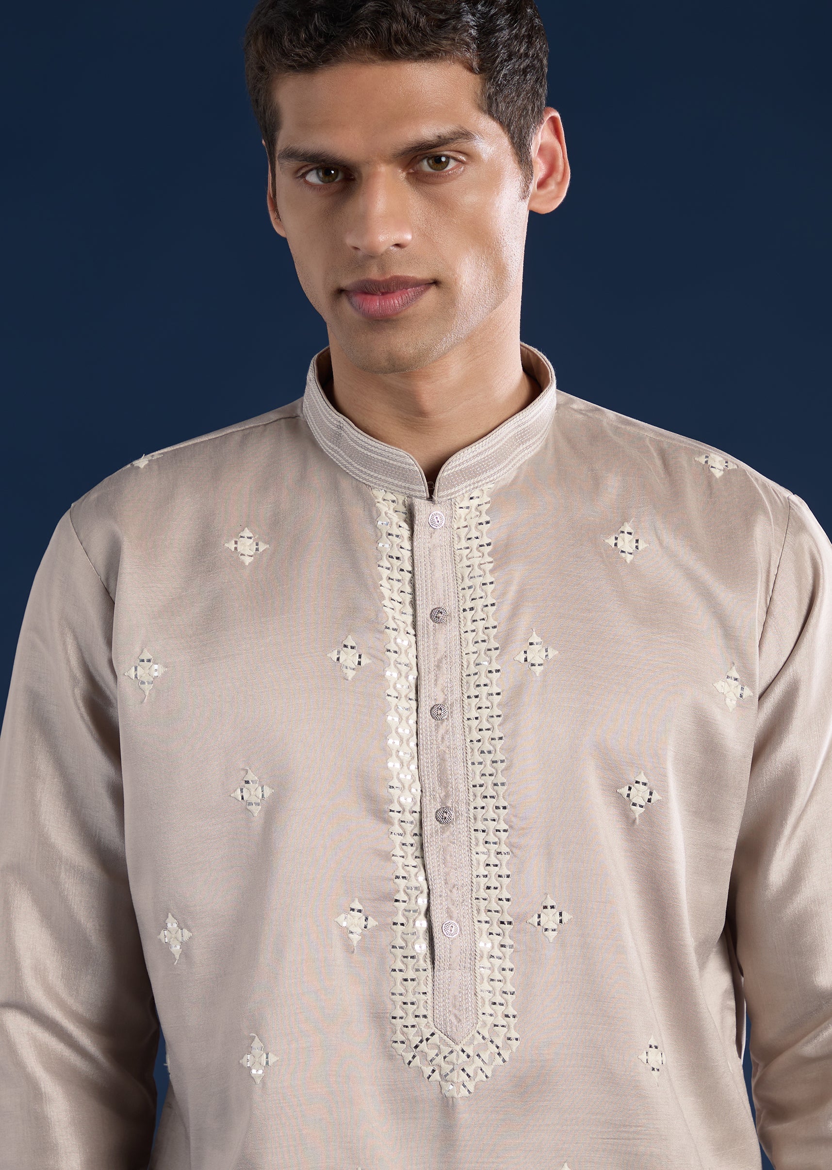 Ideal for pooja and casual occasions, this cream kurta set is crafted in art silk with refined resham and mirror detailing. Featuring a mandarin collar, full sleeves, and side slits,... More Product Details