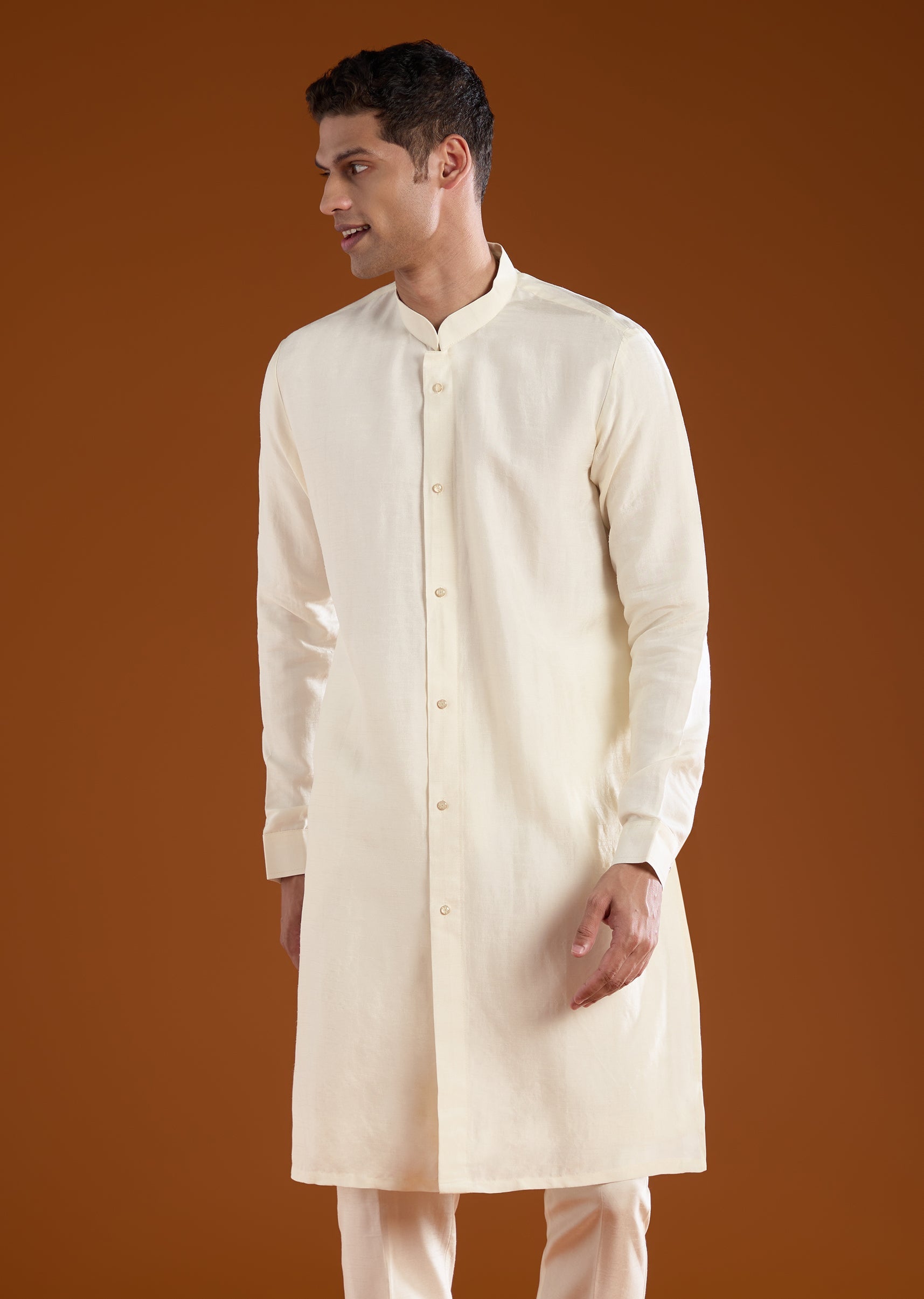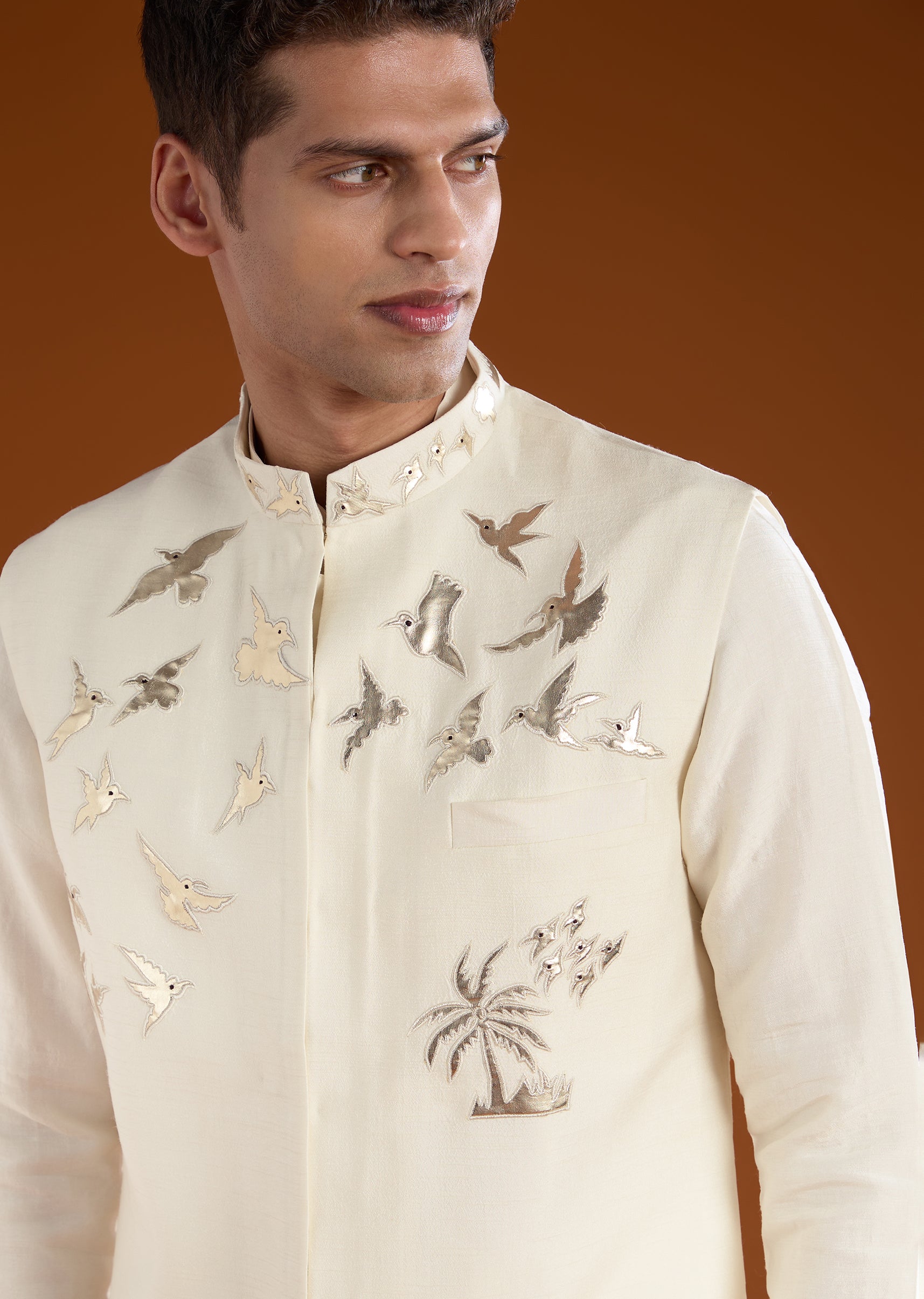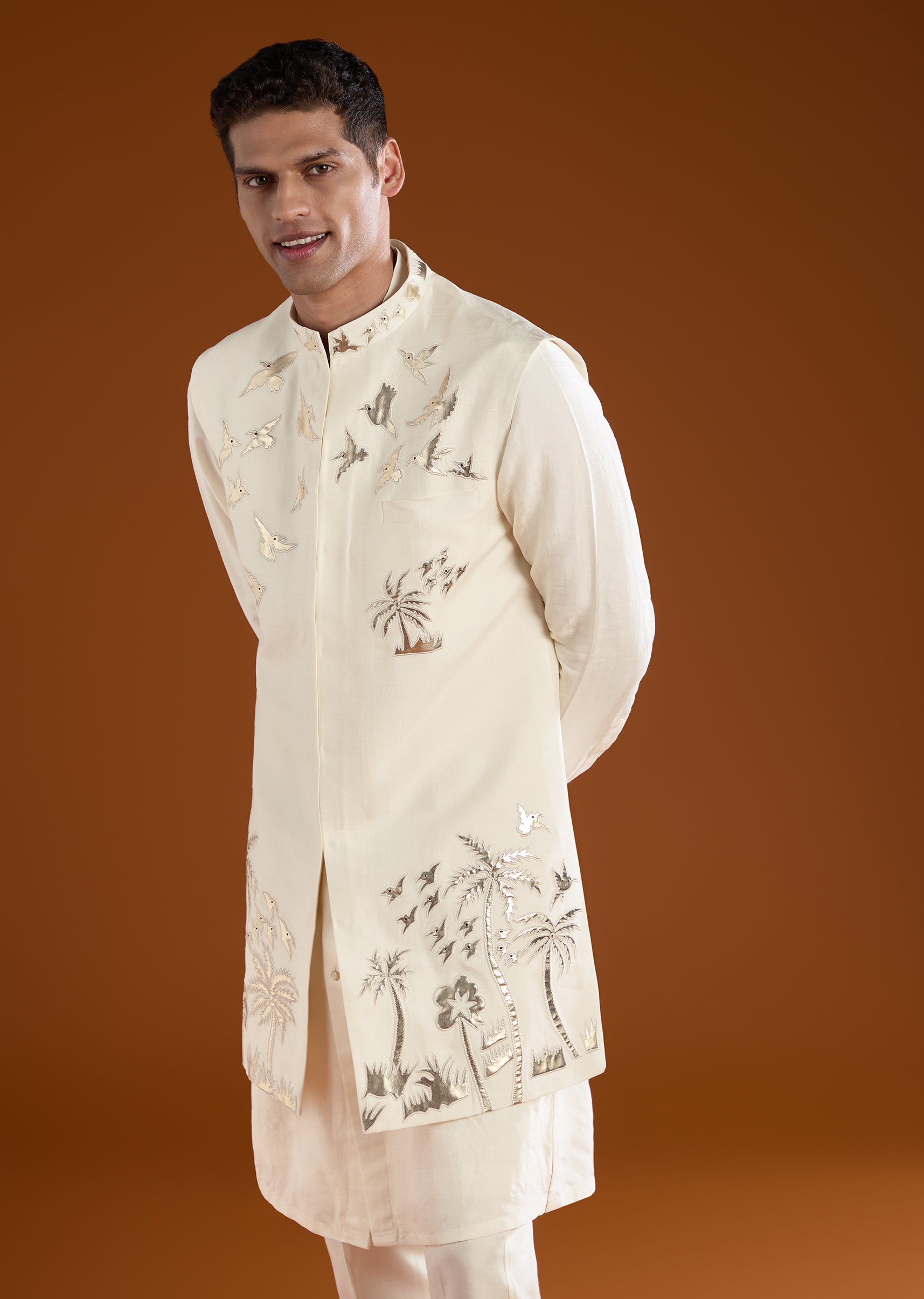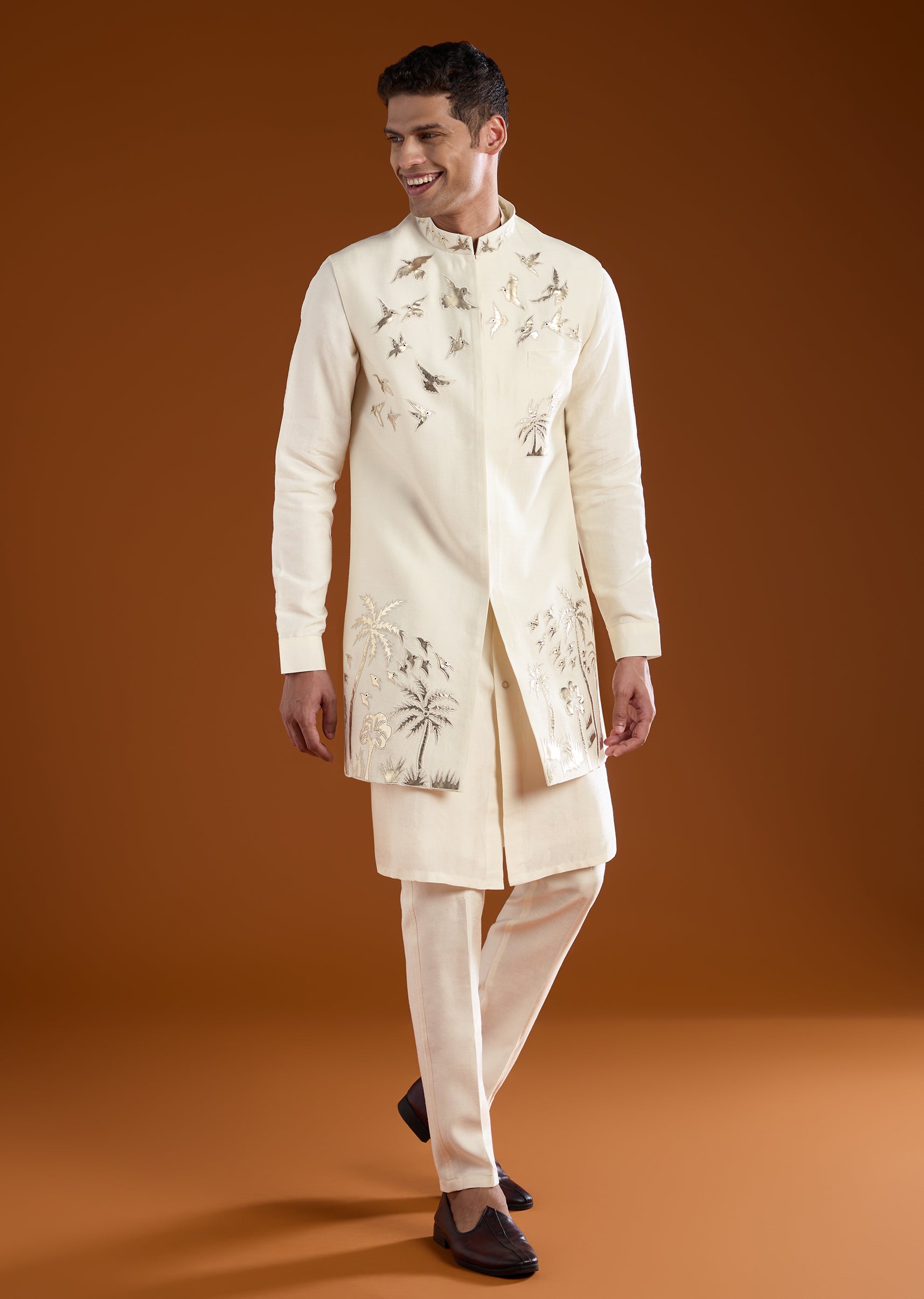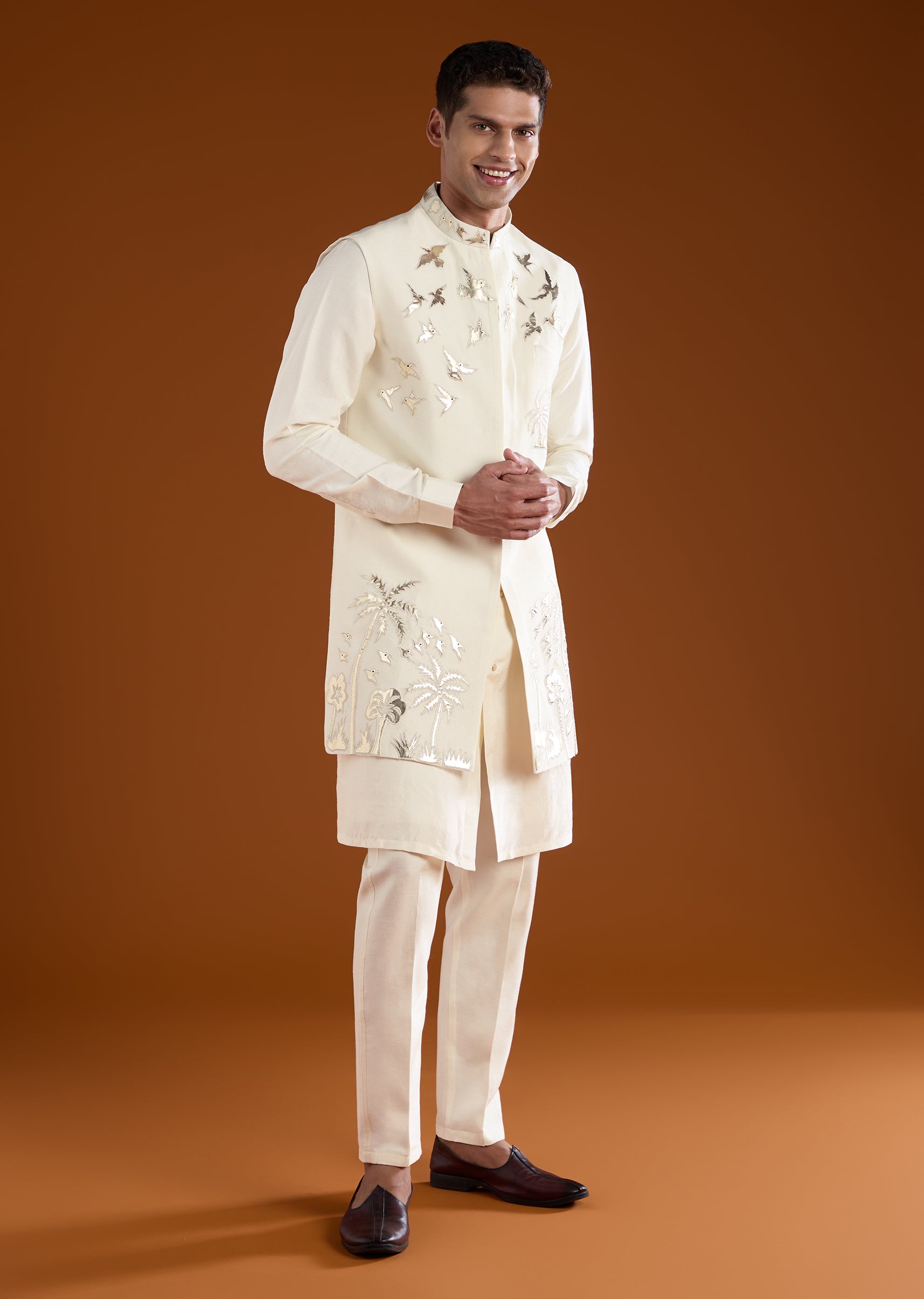 Bring contemporary charm to festive dressing with this silk jacket kurta set featuring intricate patch work that adds texture and visual interest. The kurta is designed with full sleeves and a classic mandarin collar, creating a clean and traditional foundation beneath the stylish jacket. With front buttons and a secure front hook eye closure, the ensemble pairs seamlessly with tailored pants for a polished look ideal for weddings, receptions, and cultural celebrations. Awarded as the Most Trusted Brand, we're delivering styles you love, just as promised.