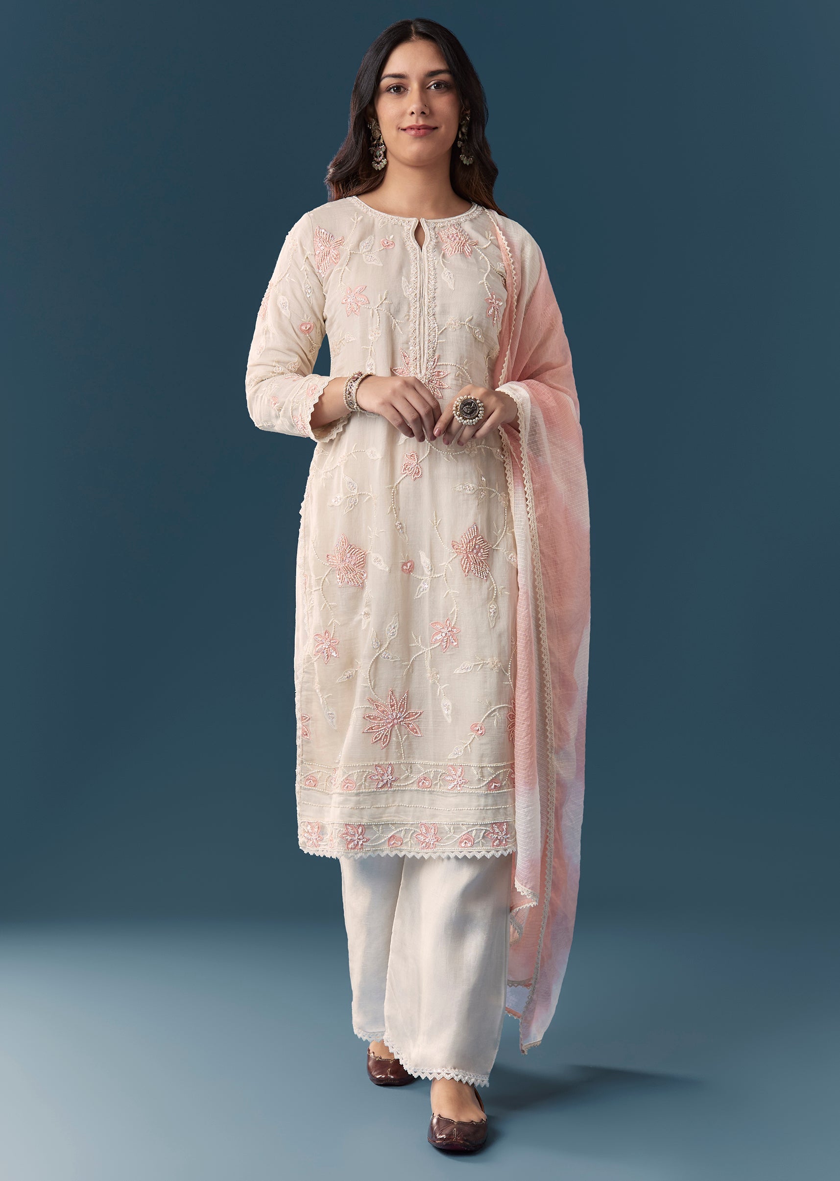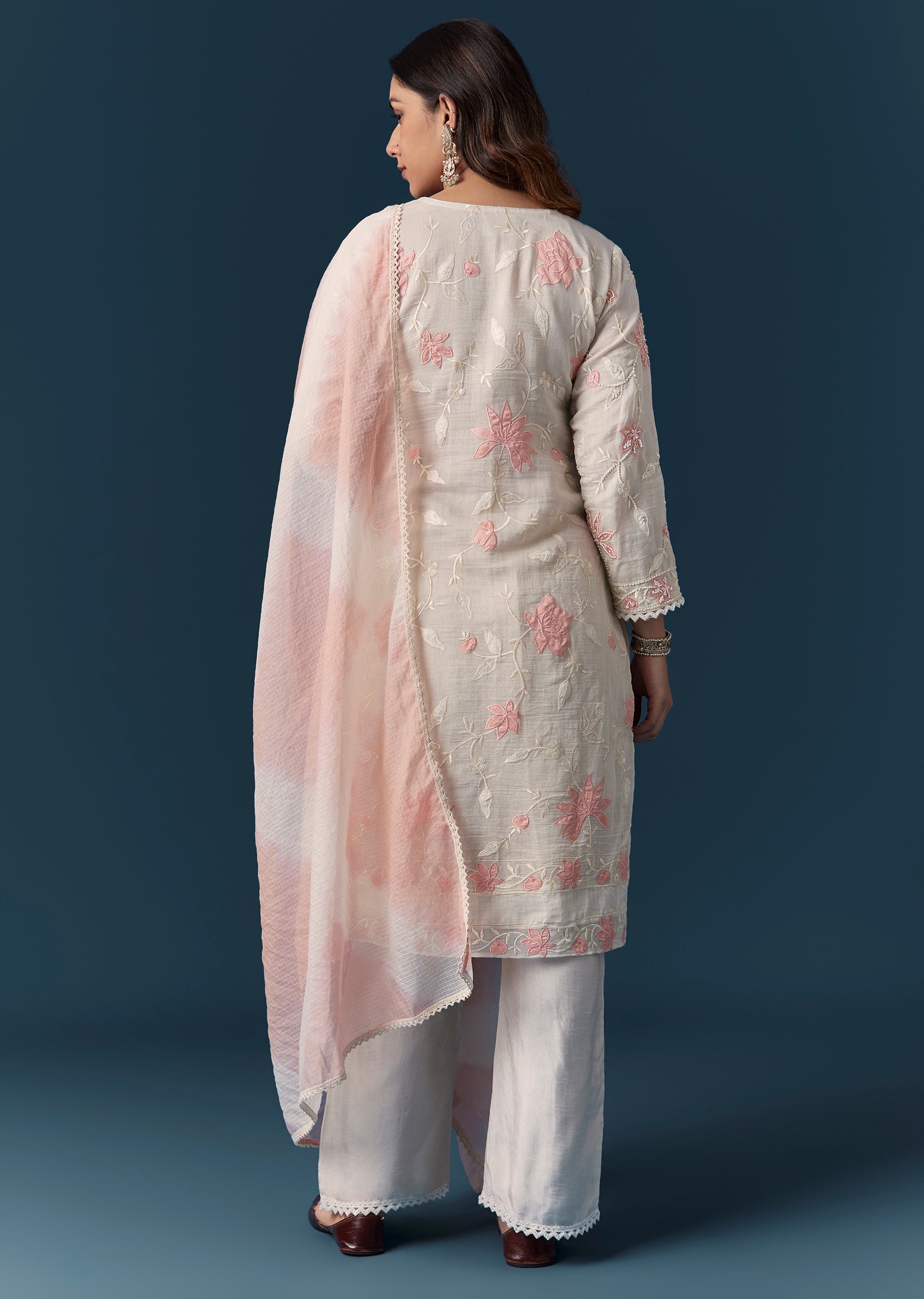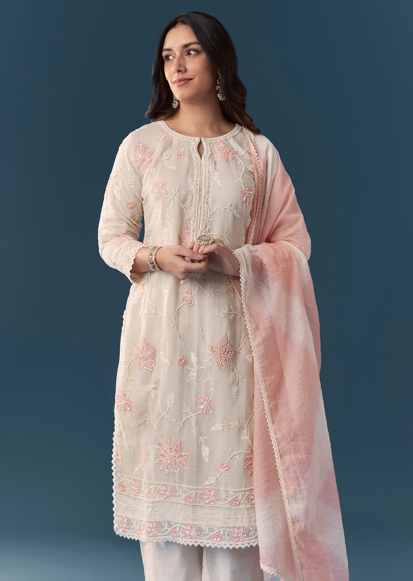 Cream Peach Applique Kurta Set With Pant And Dupatta