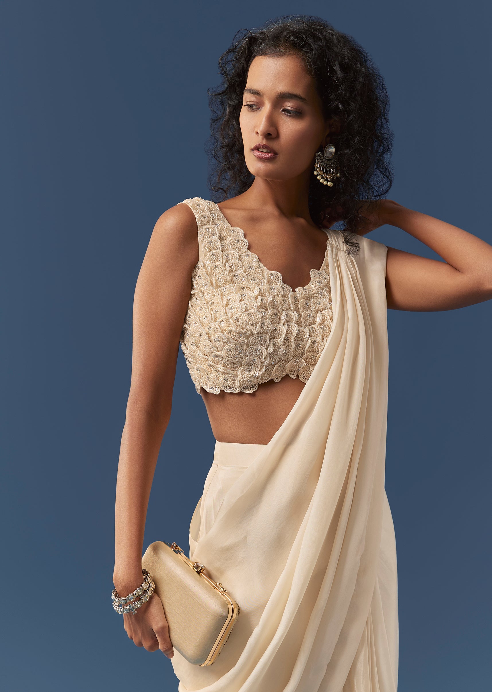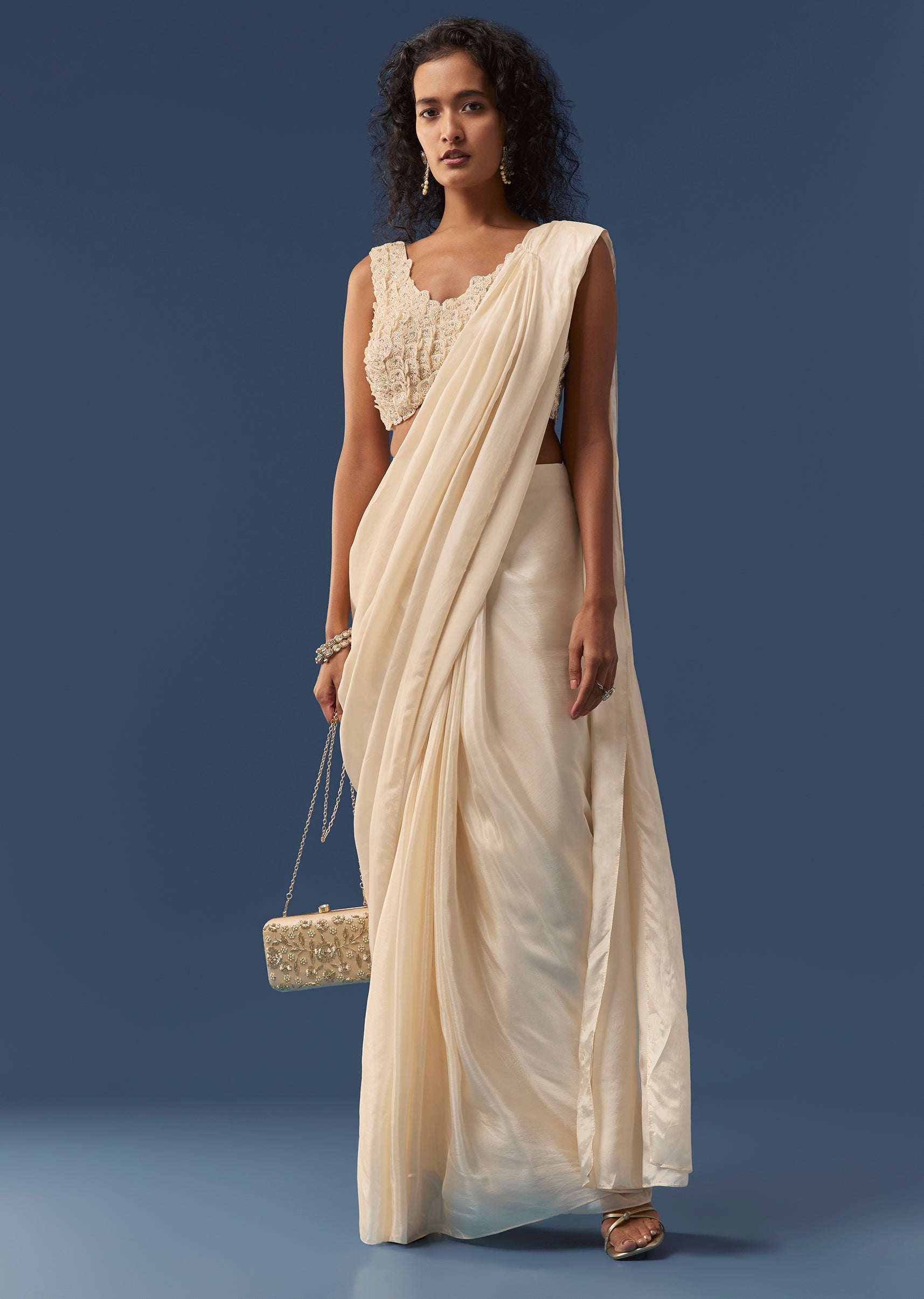 Cream Pre-Draped Beaded Saree with Blouse