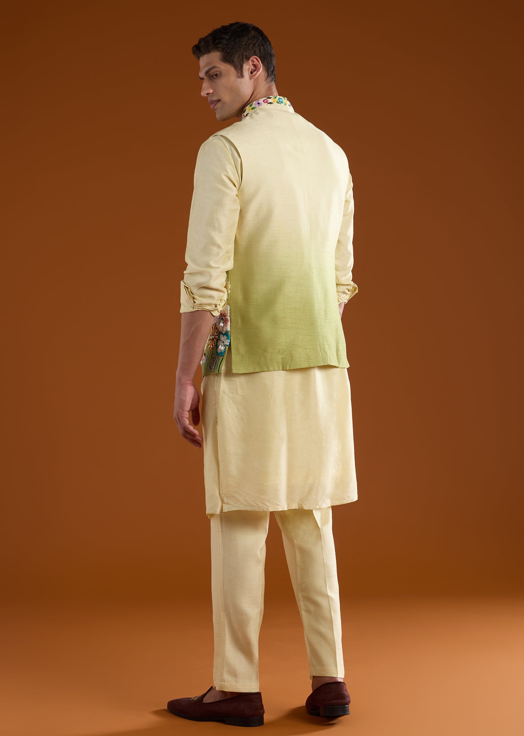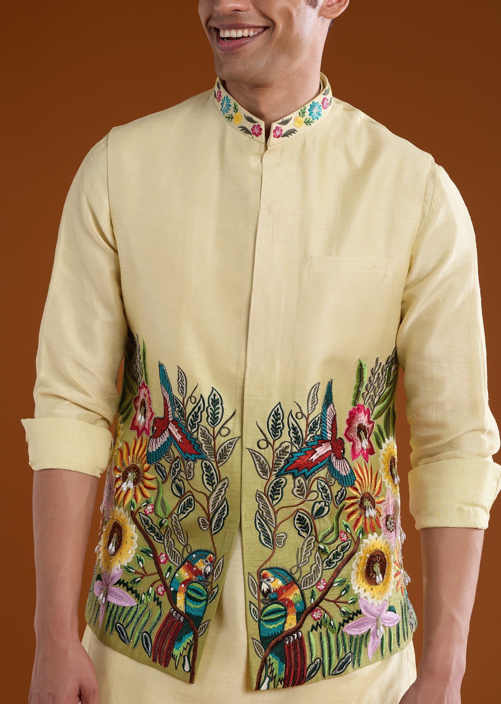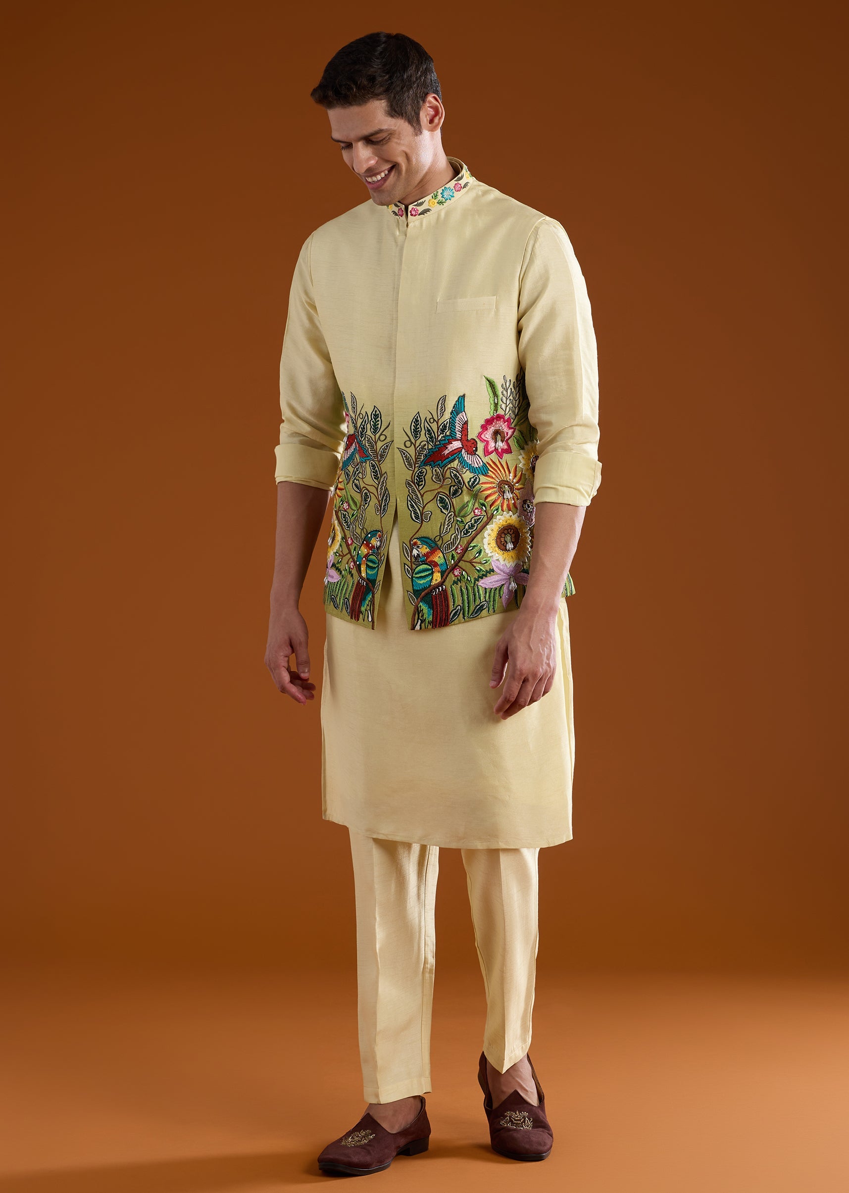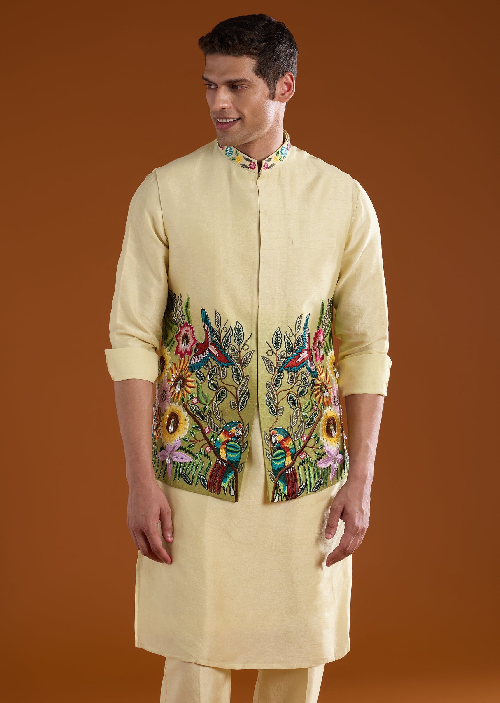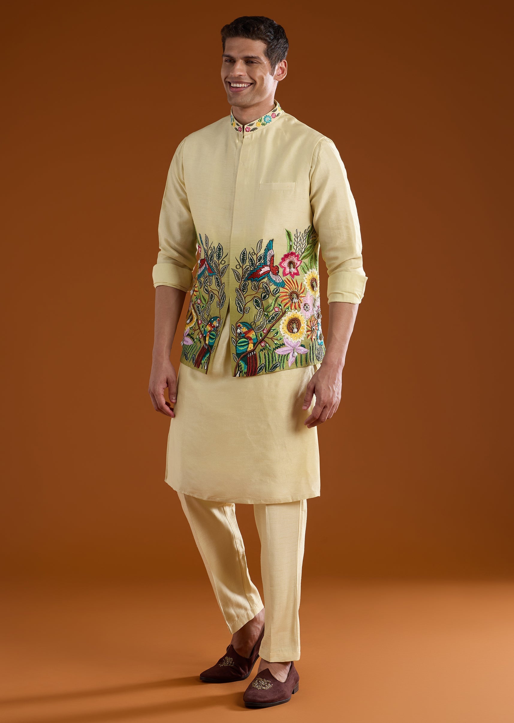 An elegant blend of heritage craft and modern layering, this silk jacket kurta set is detailed with refined thread, resham, and zardosi embroidery for a rich ceremonial finish. The full sleeves and mandarin collar lend a sharp, structured silhouette, while the layered jacket adds depth and presence. Crafted in lustrous silk, the ensemble balances opulence with comfort. Complete with a coordinated kurta and pants, it is ideal for weddings, festive celebrations, and formal cultural occasions.Awarded as the Most Trusted Brand, we're delivering styles you love, just as promised.