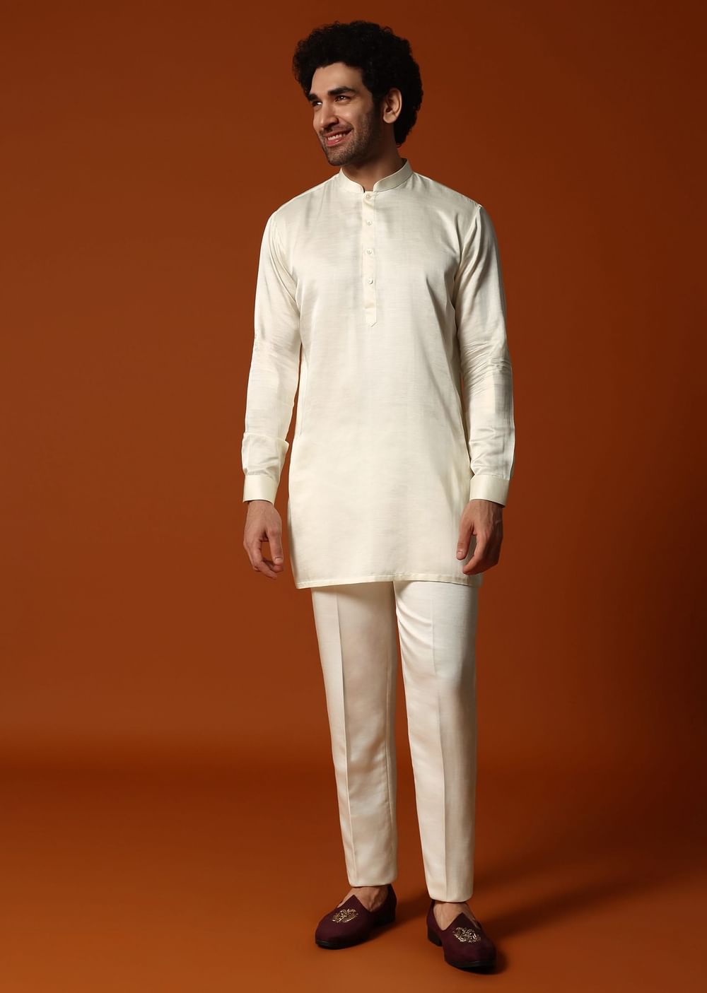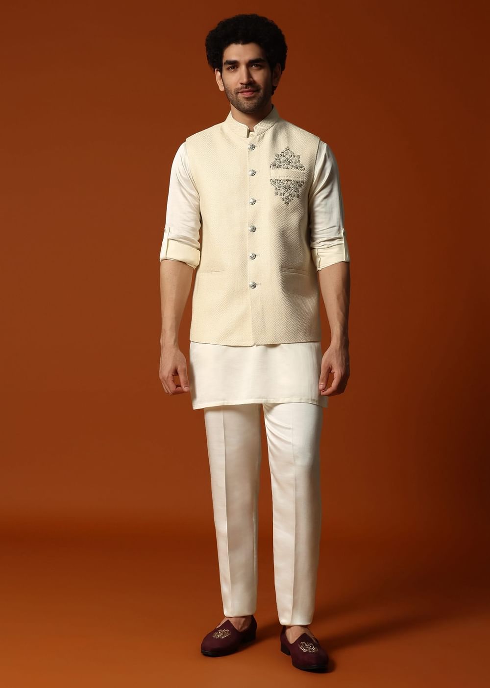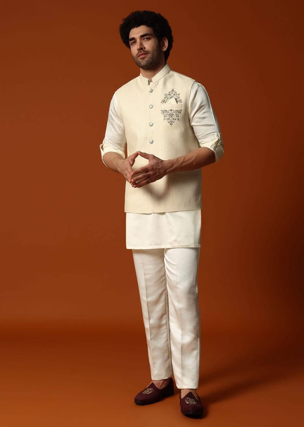 Immerse yourself in luxury with our cream kurta jacket set, thoughtfully created for sangeet and wedding gatherings. Fashioned from opulent silk fabric and adorned with intricate embroidery along the pocket side, this set consists of a kurta, a jacket, and complementary bottom. Awarded as the Most Trusted Brand, we're delivering styles you love, just as promised.