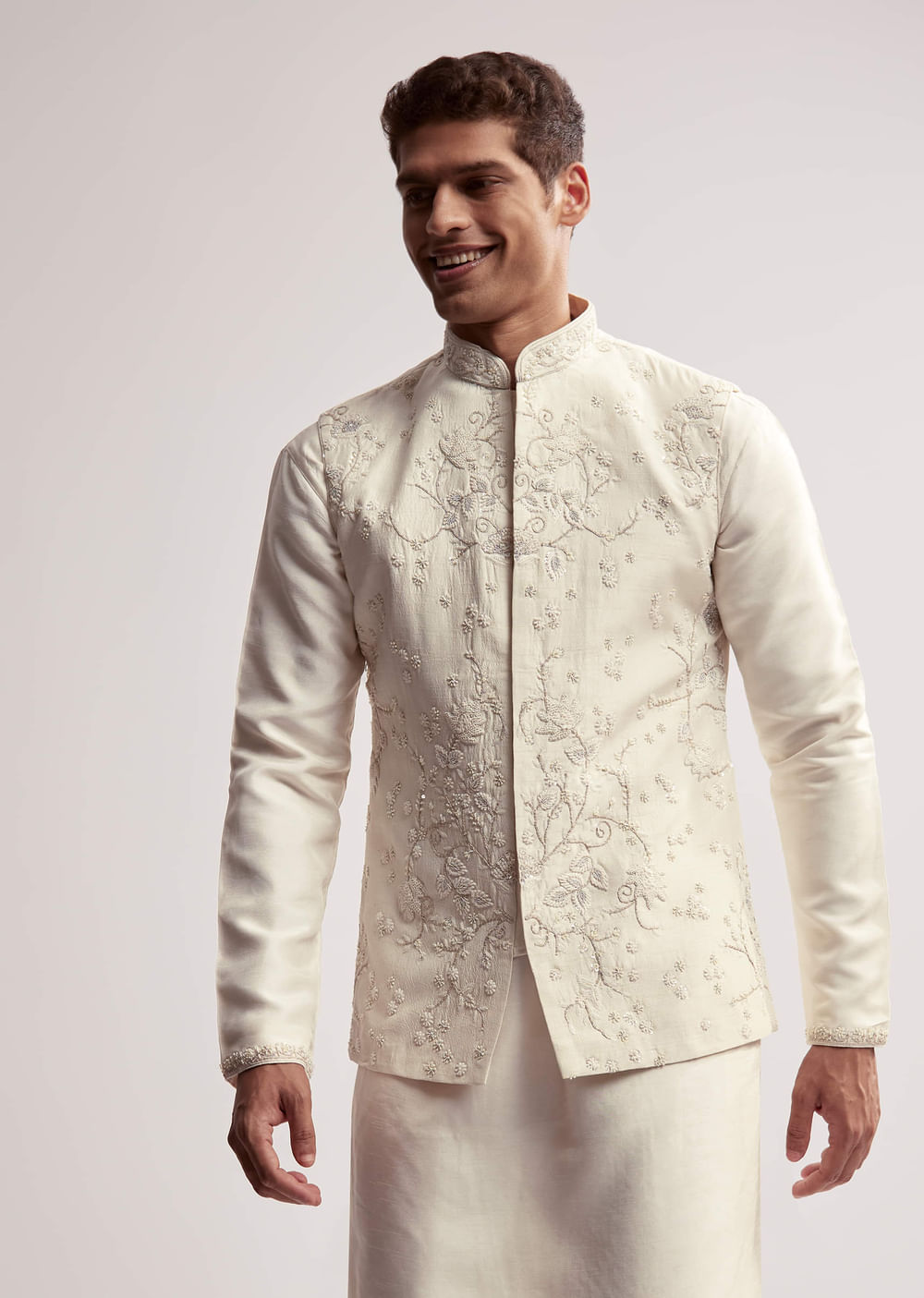 Cream Silk Kurta Jacket Set For Men With Floral Hand Embroidery