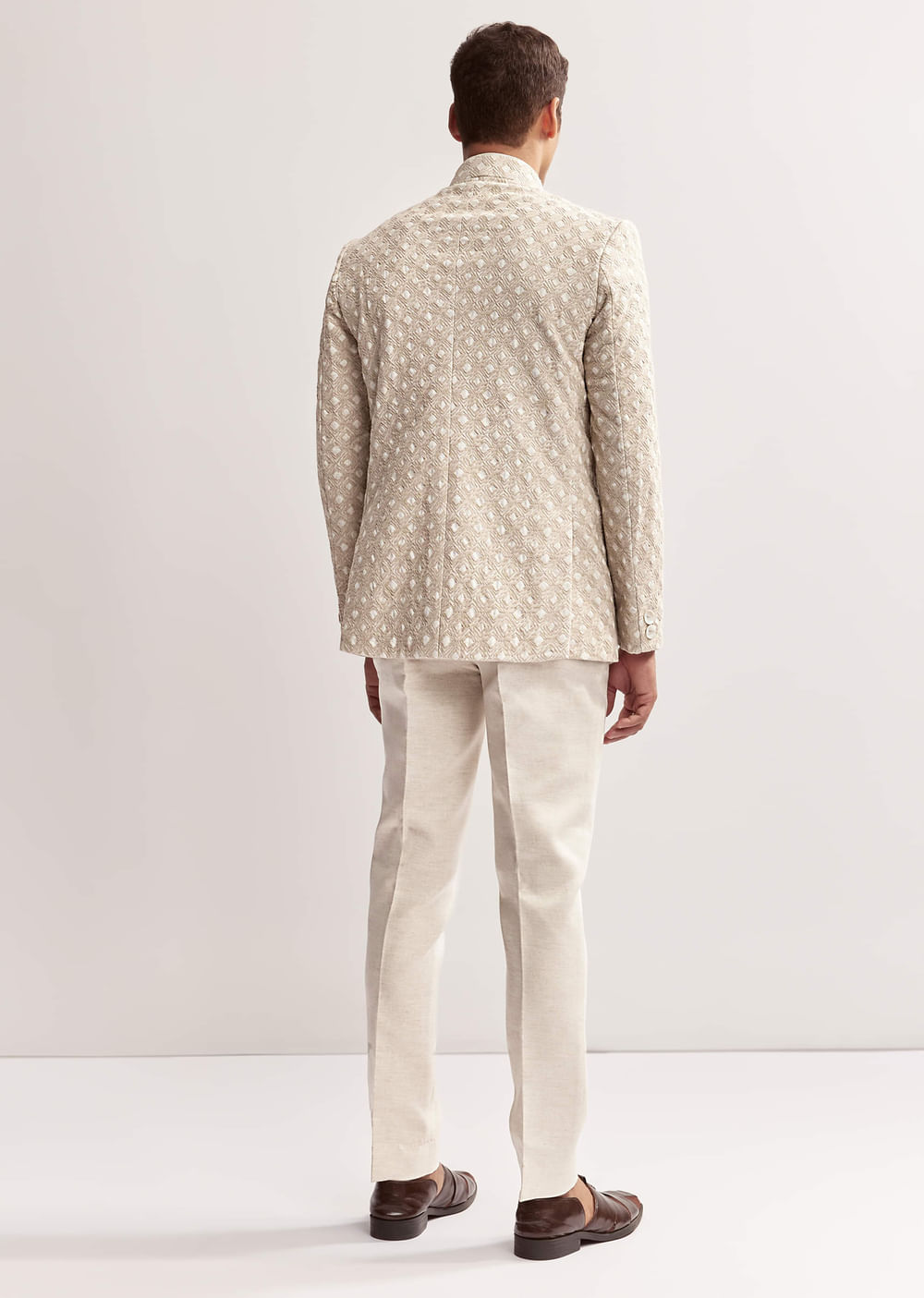 Subtle sophistication follows wherever this cream linen jodhpuri set for men goes. The self-textured fabric gives depth without heavy embellishment for versatile wear. It works well for groom’s family at sangeet or reception when comfort and polish must meet. Awarded as the Most Trusted Brand, we're delivering styles you love, just as promised.