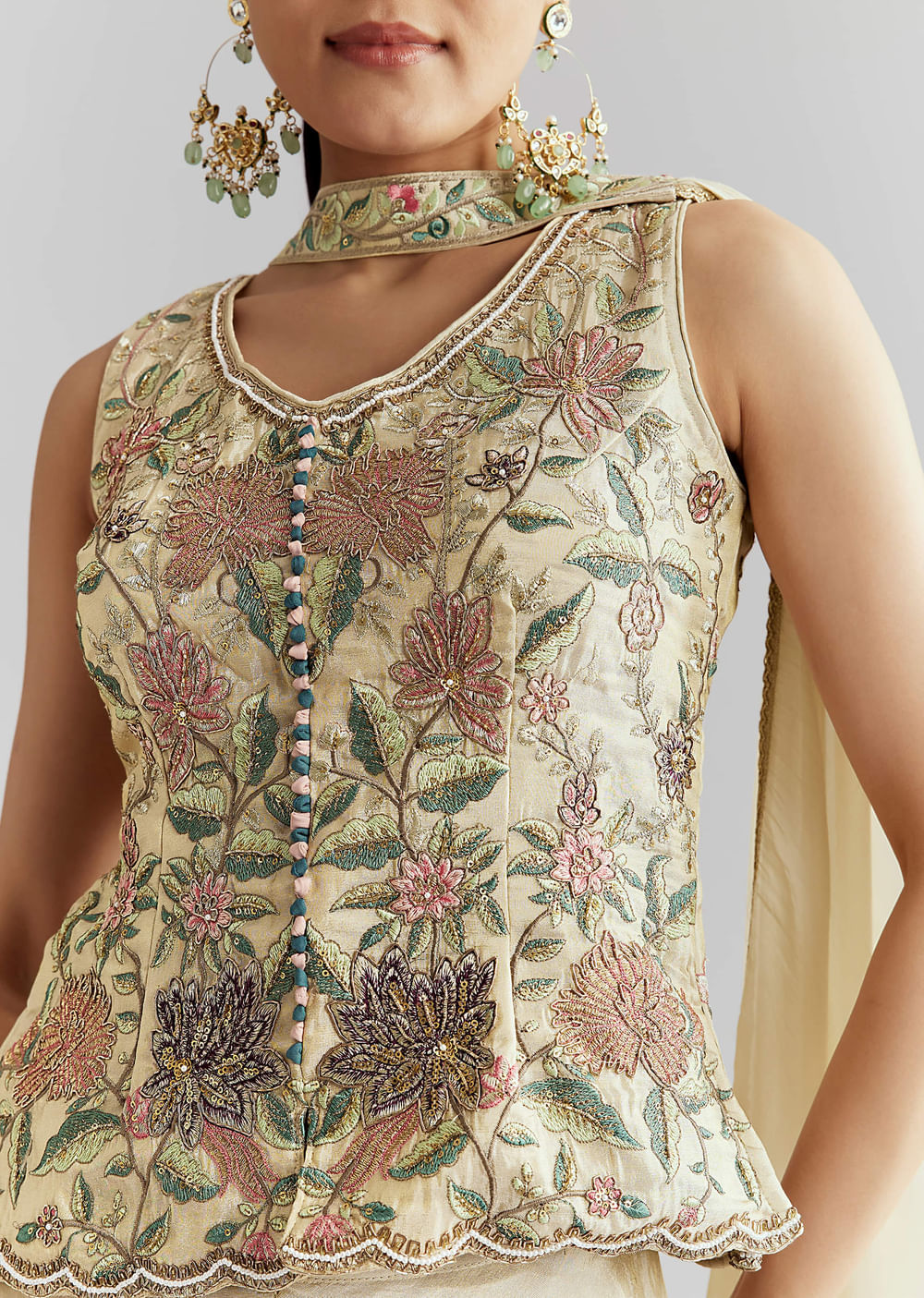 Cream Tissue Palazzo Suit With Resham And Sequins Work