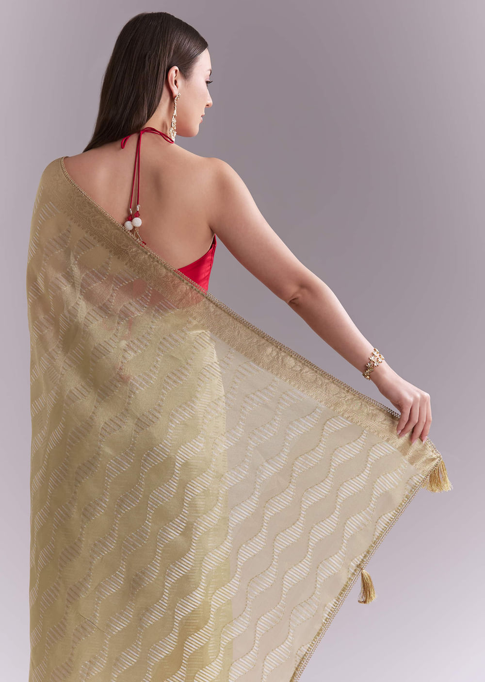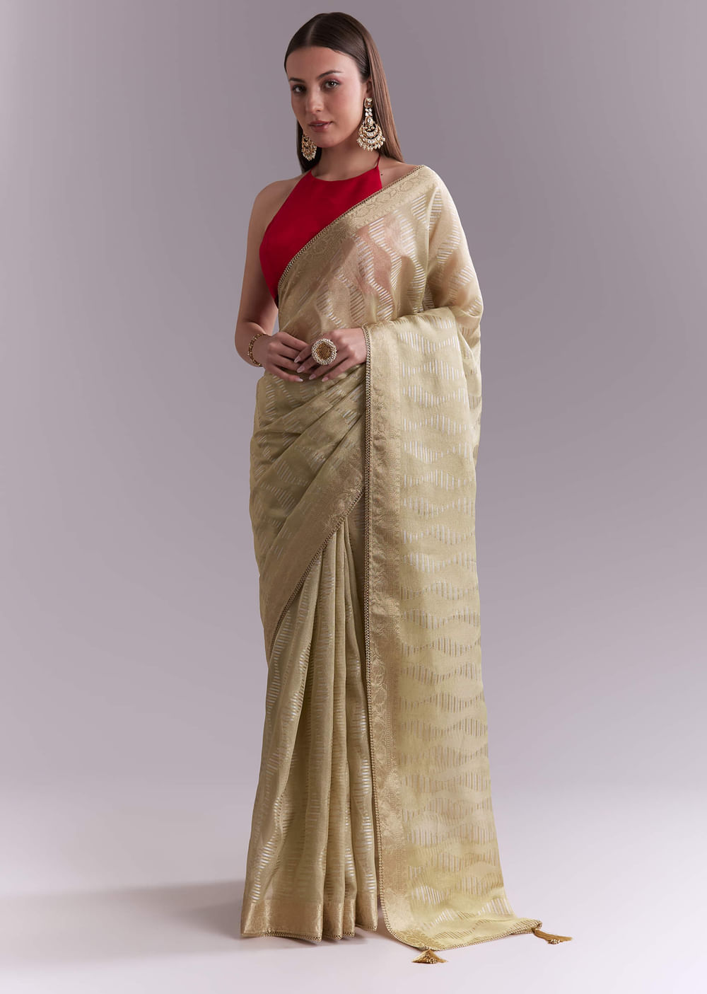 Cream Tissue Saree With Subtle Weave And Zari Border