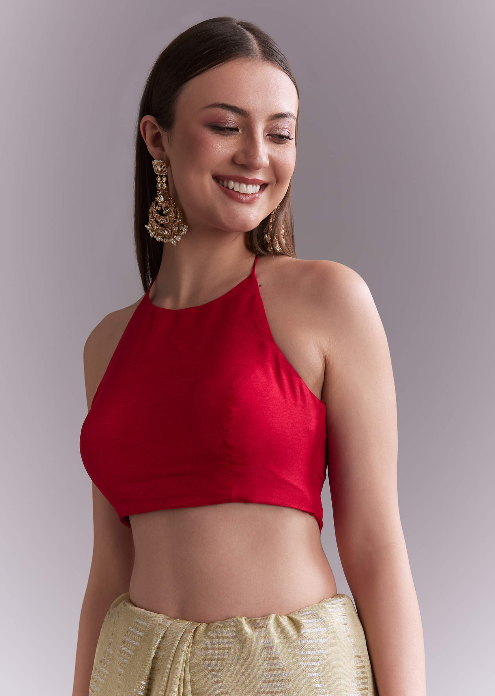 Choose pearl studs, a sleek bun and tan kolhapuris, then add a deep red lip to echo the blouse fabric.