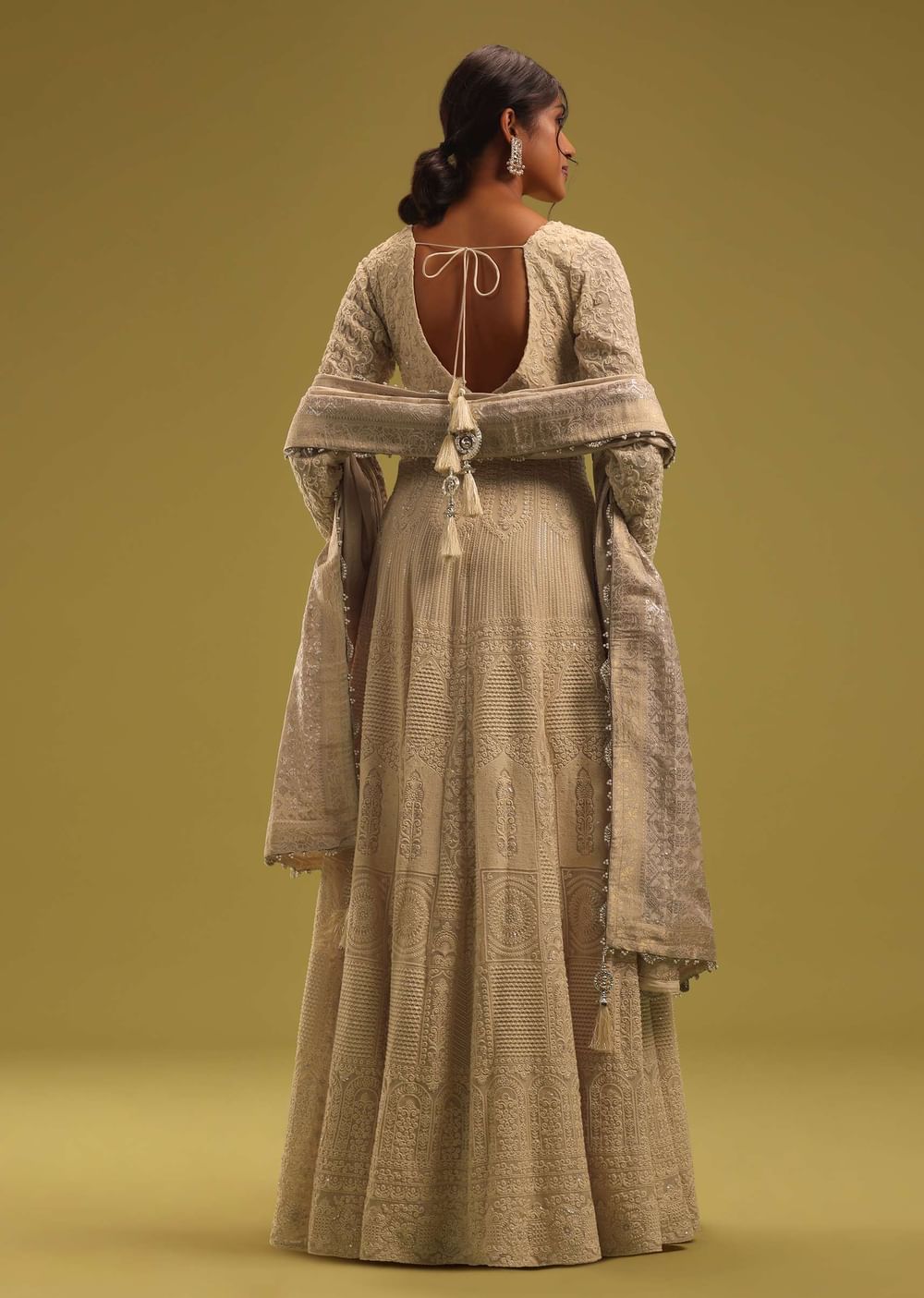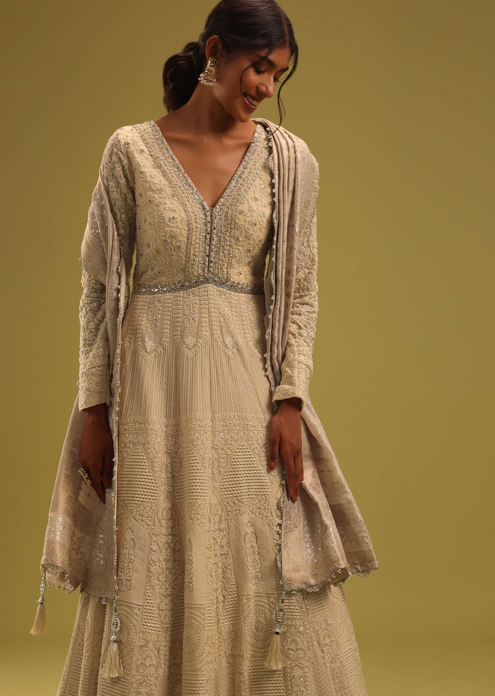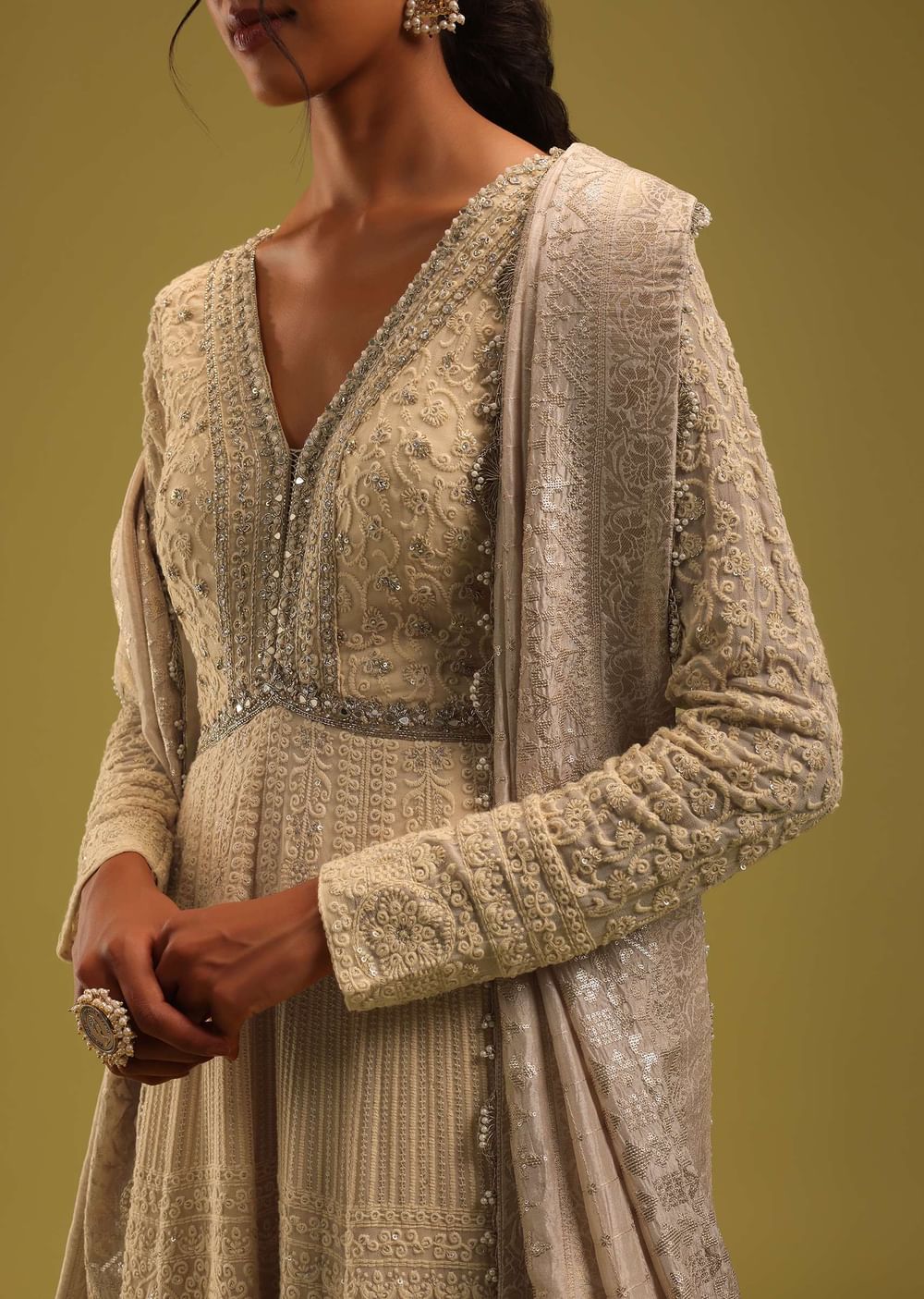 Cream White Anarkali Set In Georgette With Lucknowi Work