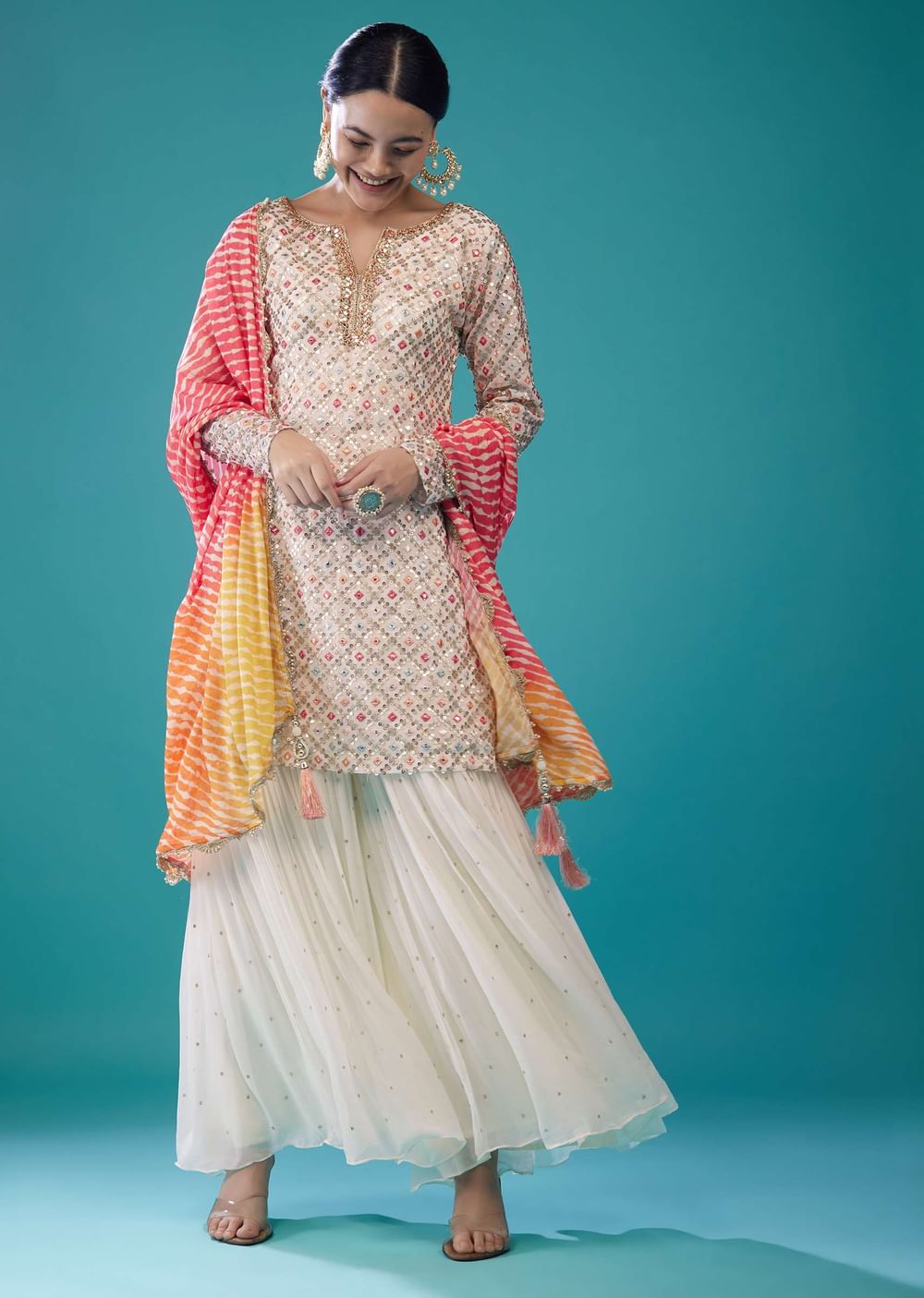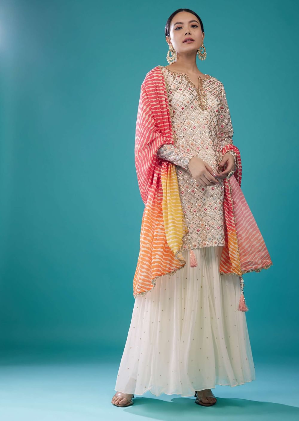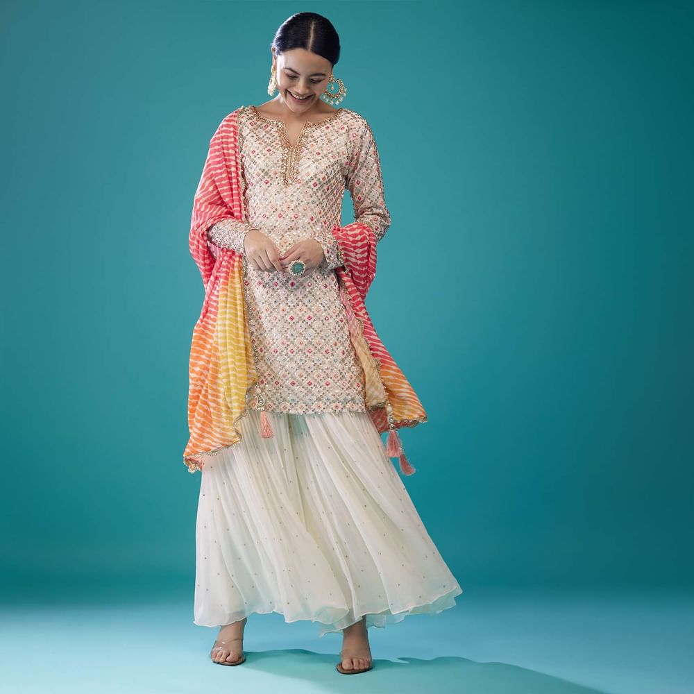 Cream White Georgette Embroidered Sharara Set With Leheriya Dupatta
