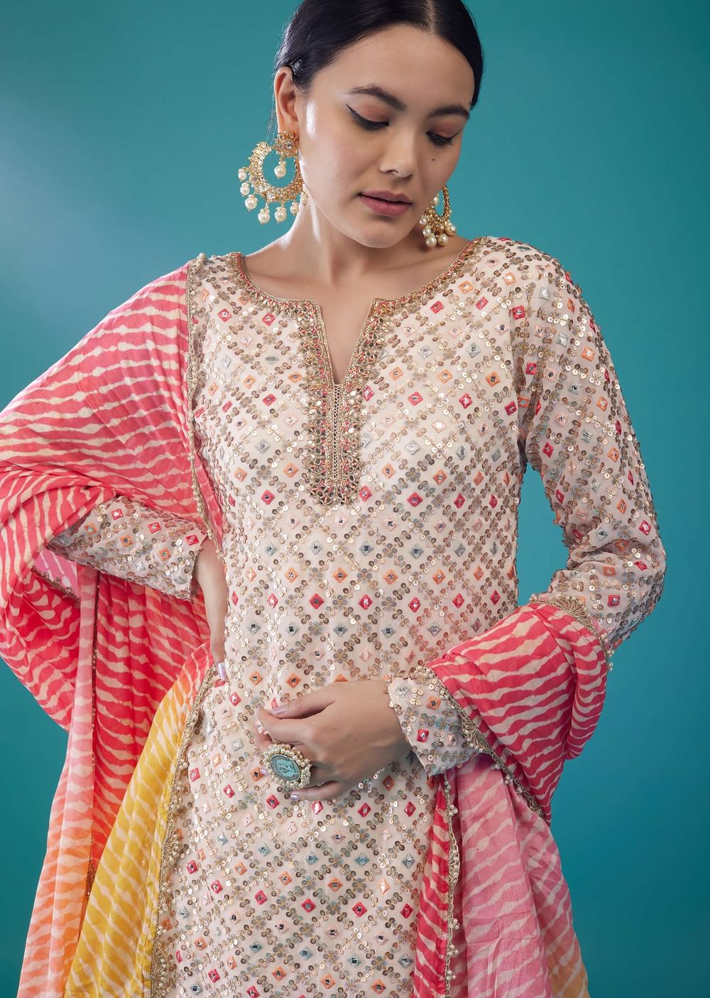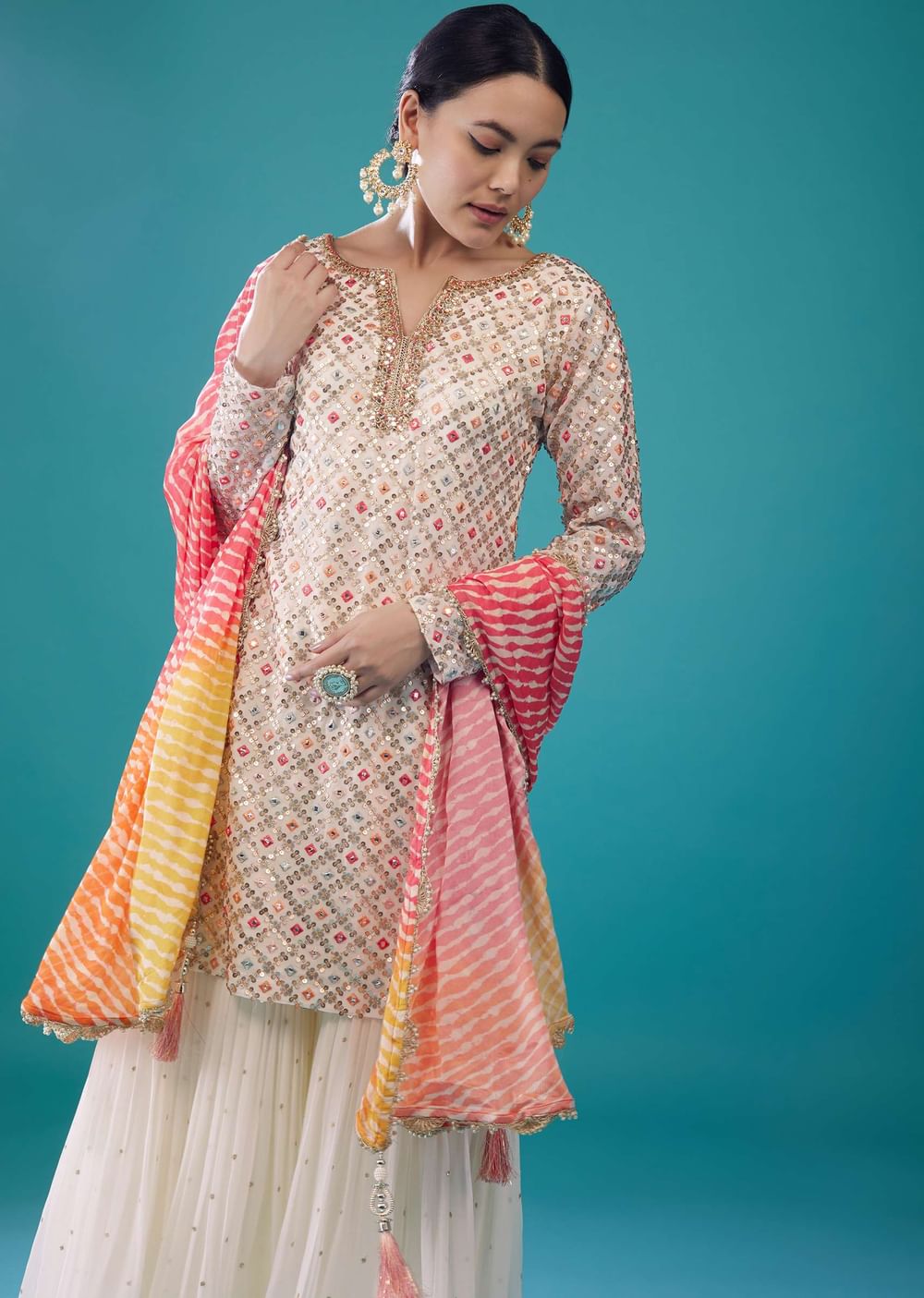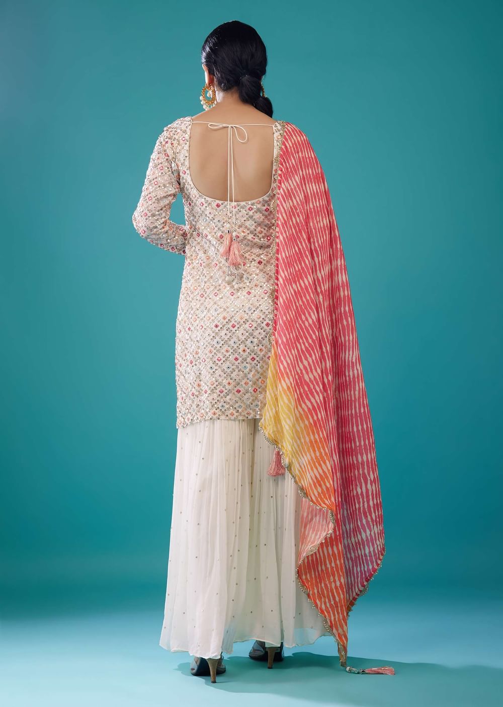 Cream White Georgette Embroidered Sharara Set With Leheriya Dupatta