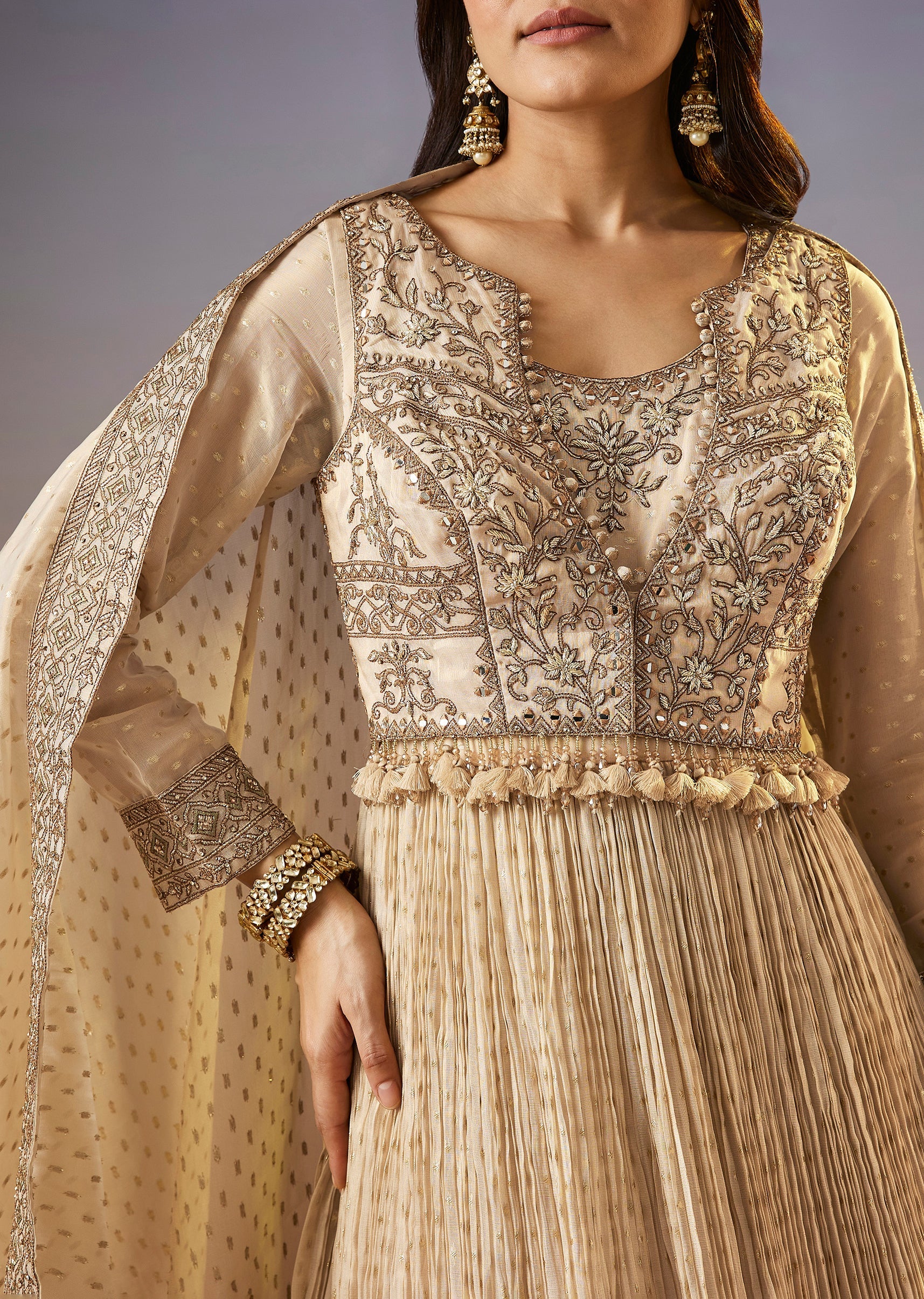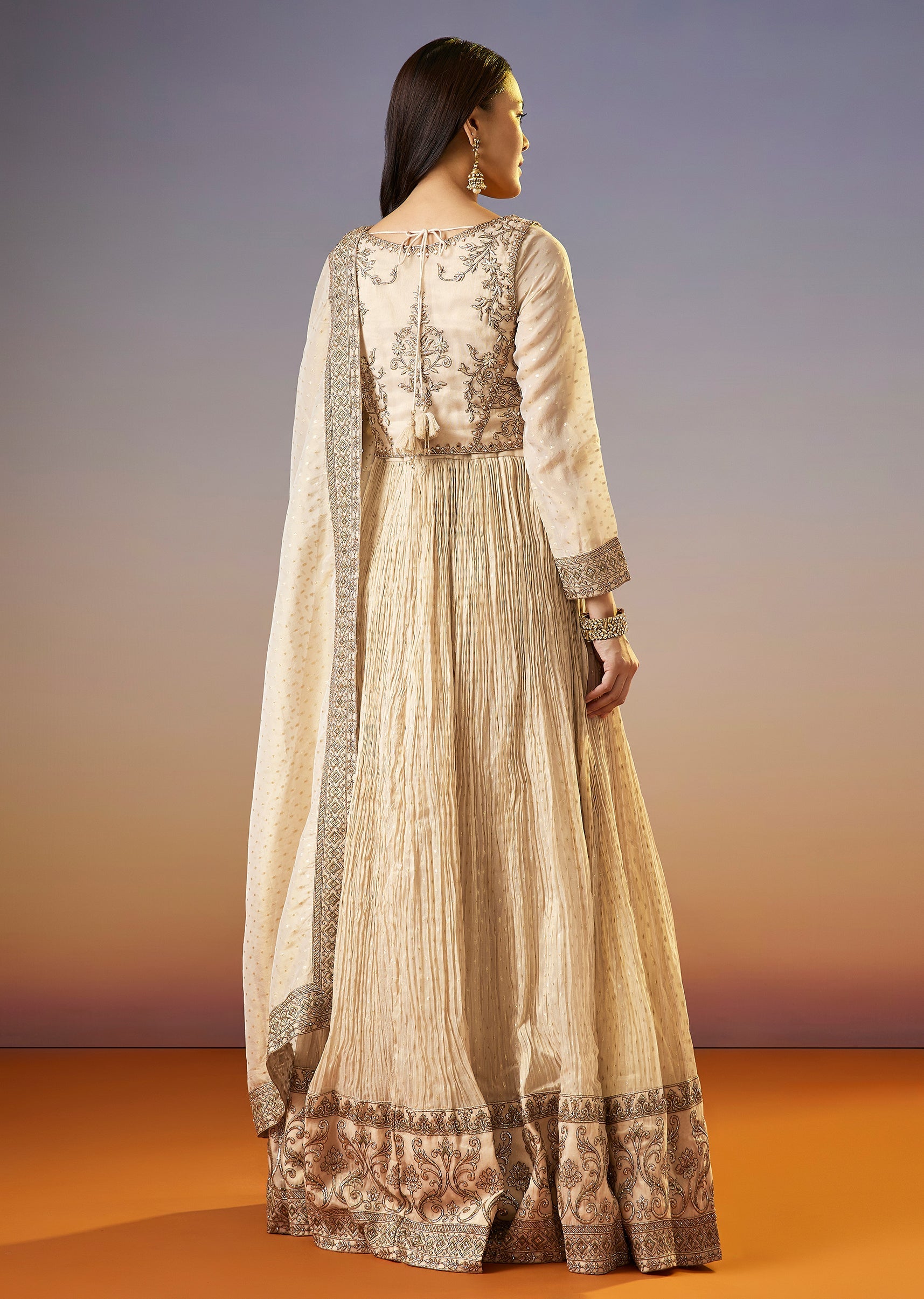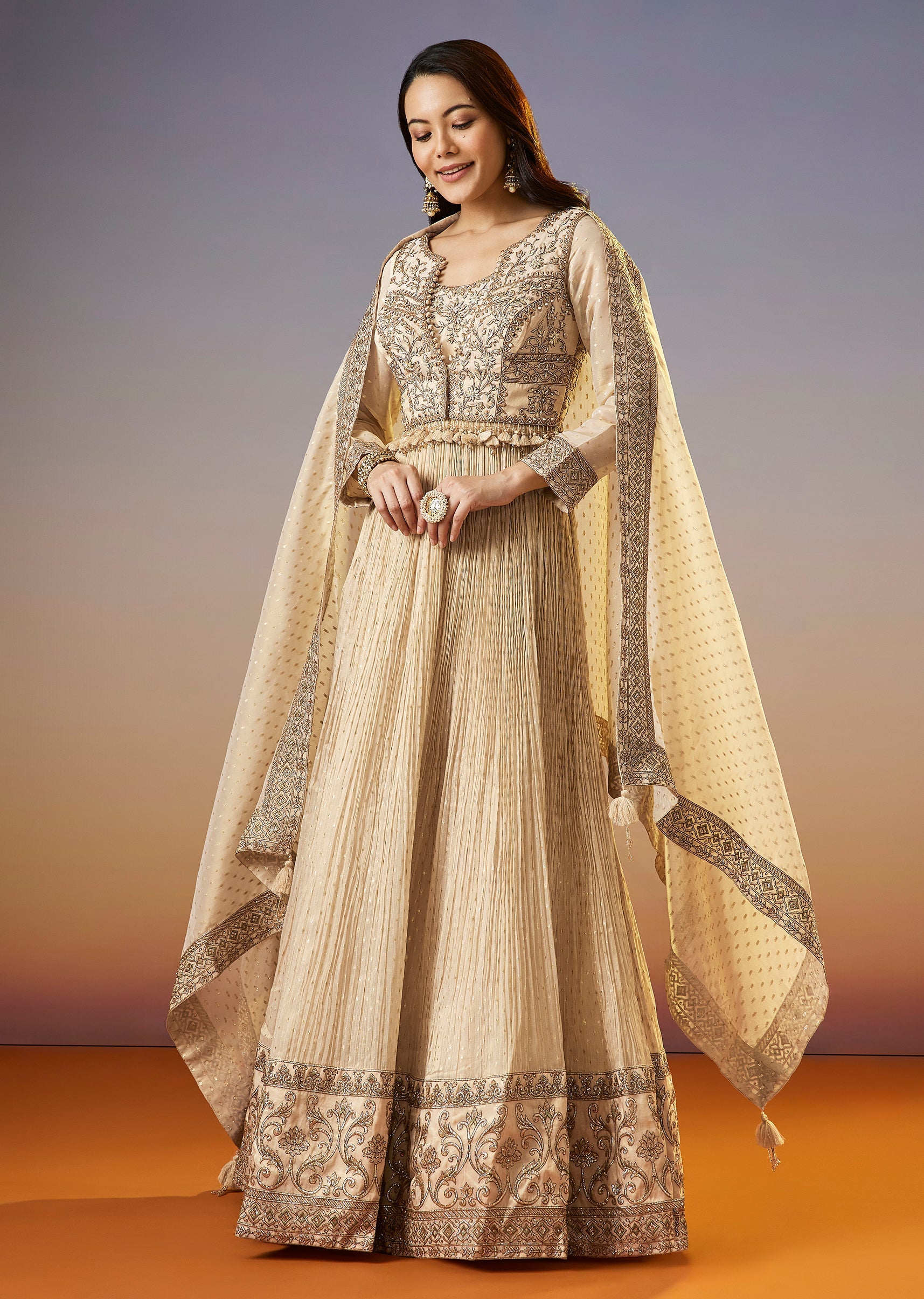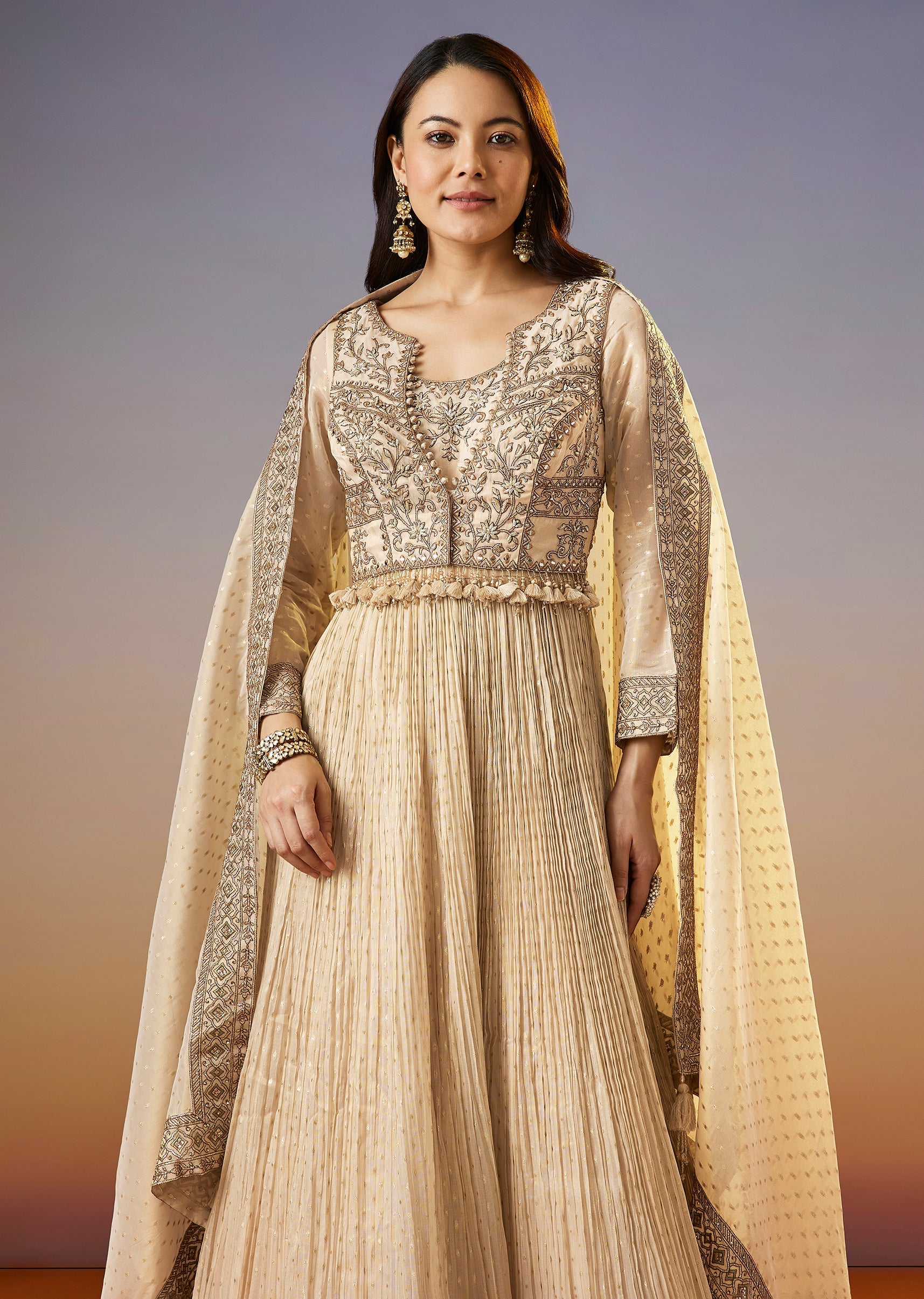 A regal cream anarkali set featuring a tissue butti anarkali with zardosi work, layered with an embroidered jacket and dupatta. Designed for special occasions, this ensemble brings rich texture and... More Product Details