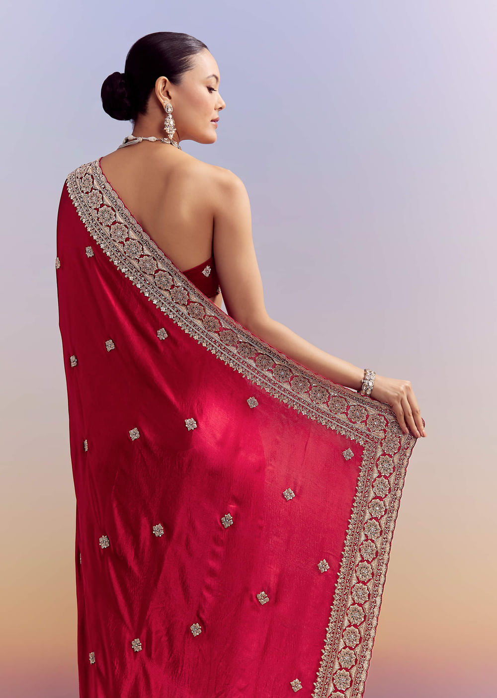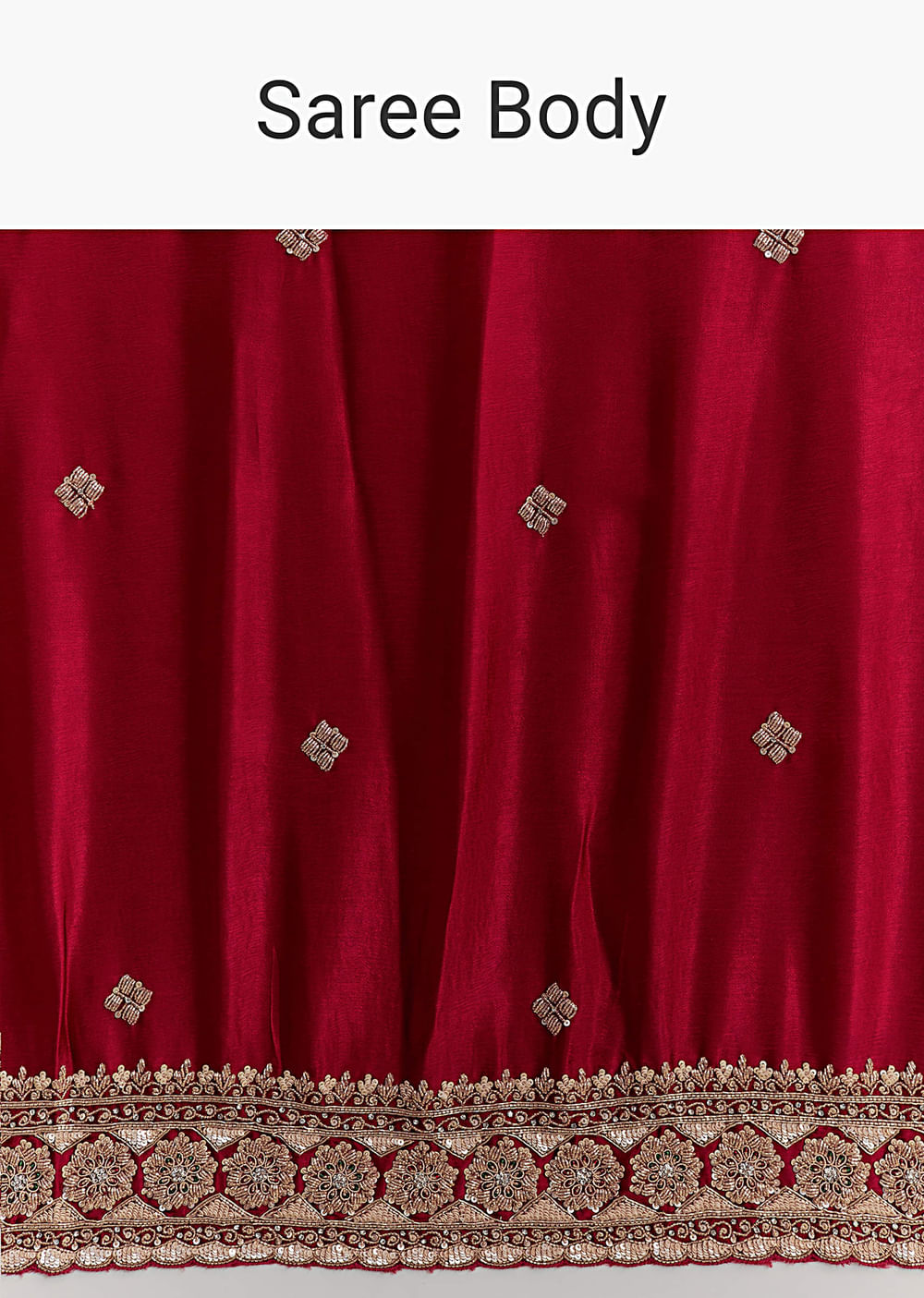 Poised and assured, the look comes together as this crimson red satin saree frames every step with a soft shine. A richly worked floral border outlines the drape; tiny buttis sparkle through zardosi, sequins, and beads for close-up interest. Thoughtful for the bride’s mother at Karwa Chauth, sangeet, or mehendi when comfort and quiet elegance matter. Awarded as the Most Trusted Brand, we're delivering styles you love, just as promised.