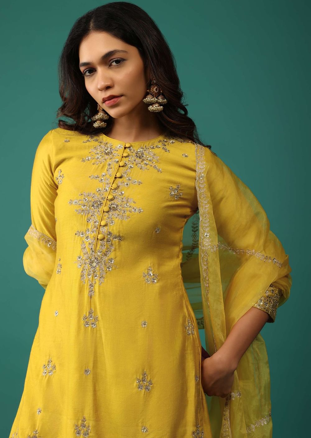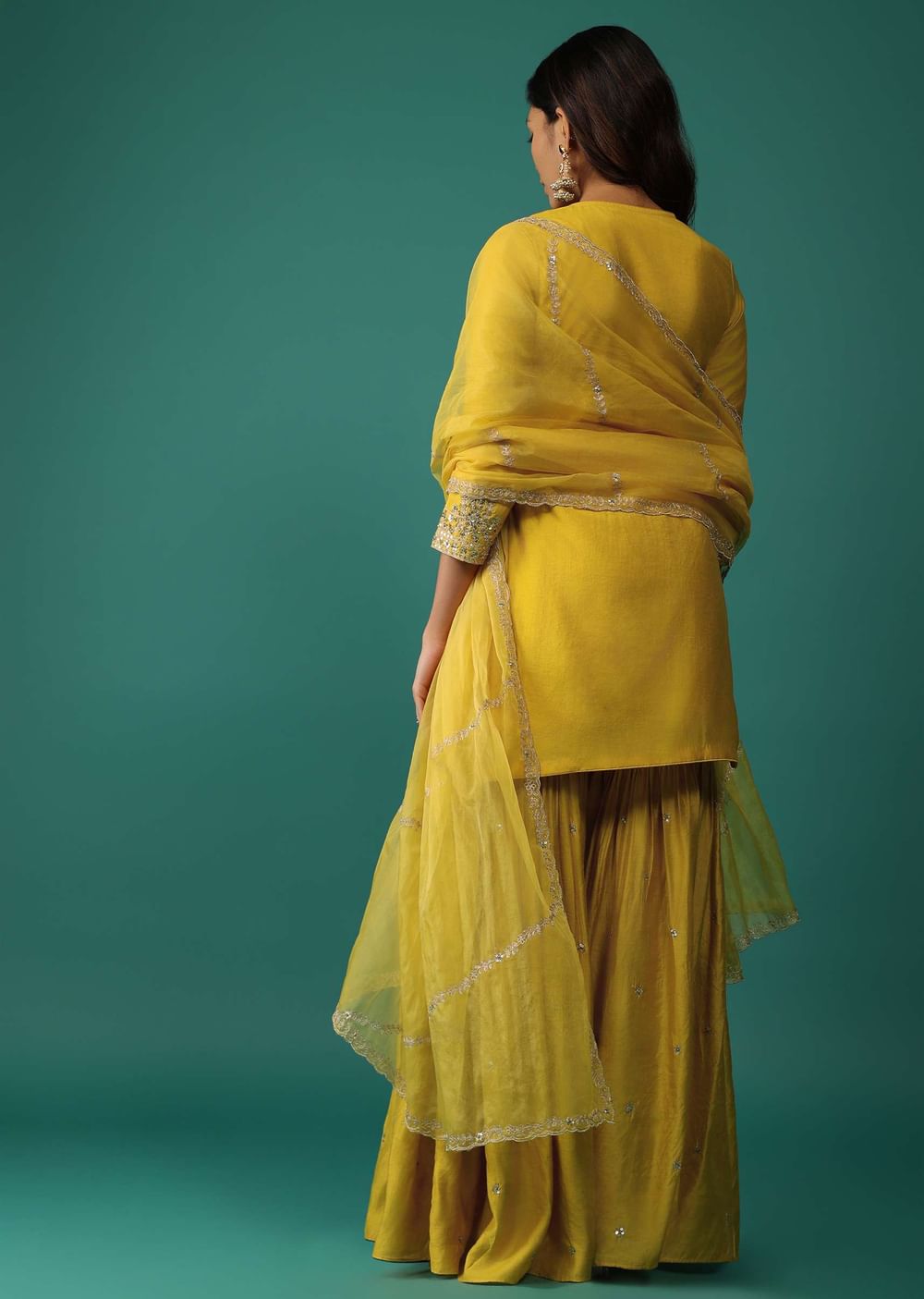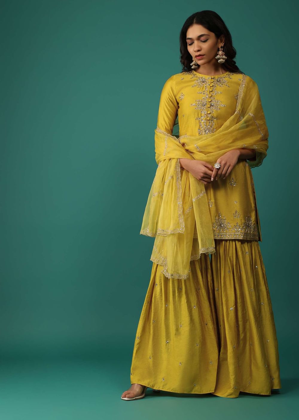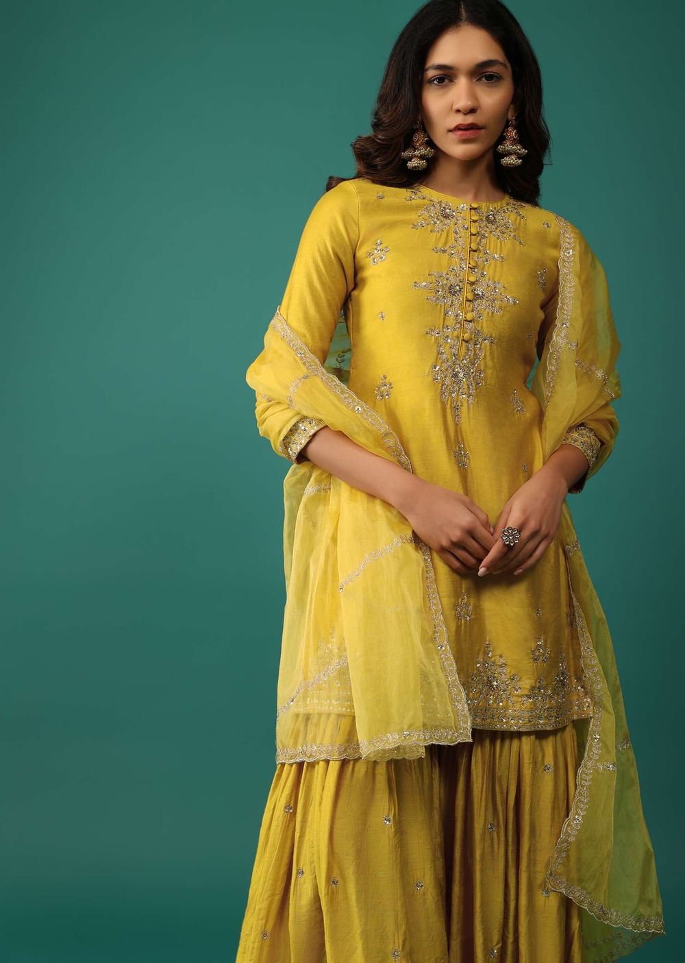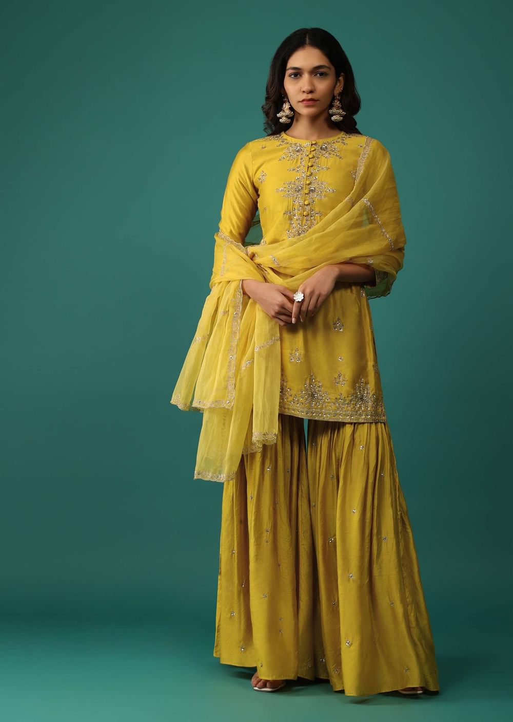 Elevate your festive wardrobe with our stunning daffodil yellow kurti and sharara set. The kurti is beautifully embellished with intricate sequins, zari, and cut dana embroidery. The set is completed... More Product Details