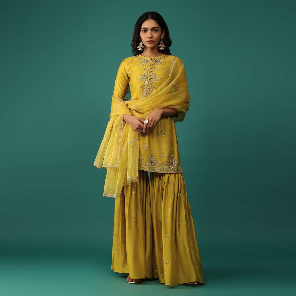 Daffodil Yellow Embroidered Kurti And Sharara Set In Chanderi Silk