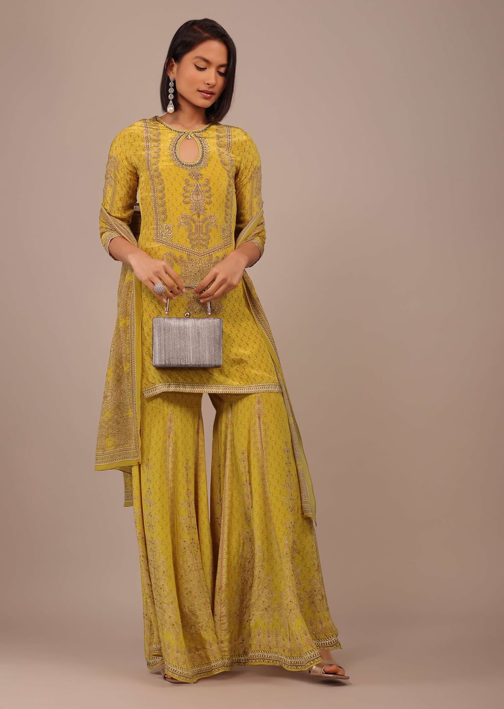 A stunning mimosa yellow printed sharara suit in crepe. The top is printed with stonework in a keyhole neckline and has three-forth sleeves. Paired with a gorgeous printed dupatta with... More Product Details