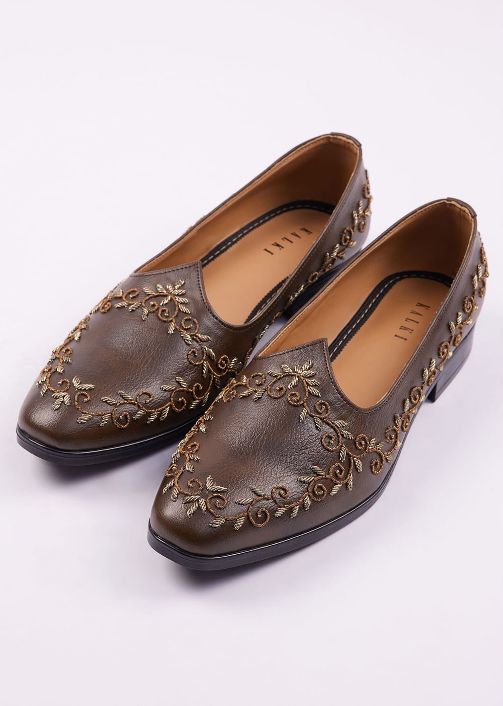 - These dark brown juttis showcase exquisite zardosi embroidery blending tradition with sophistication.