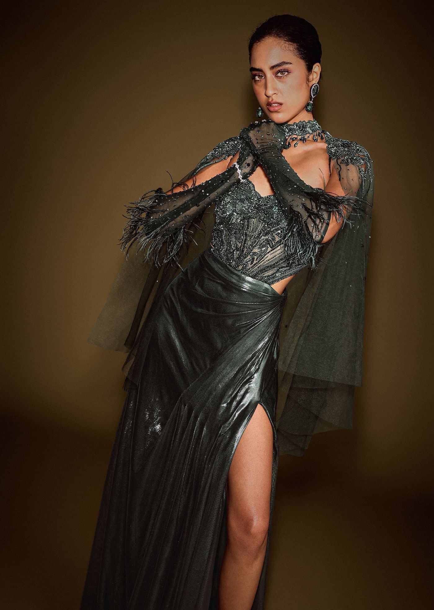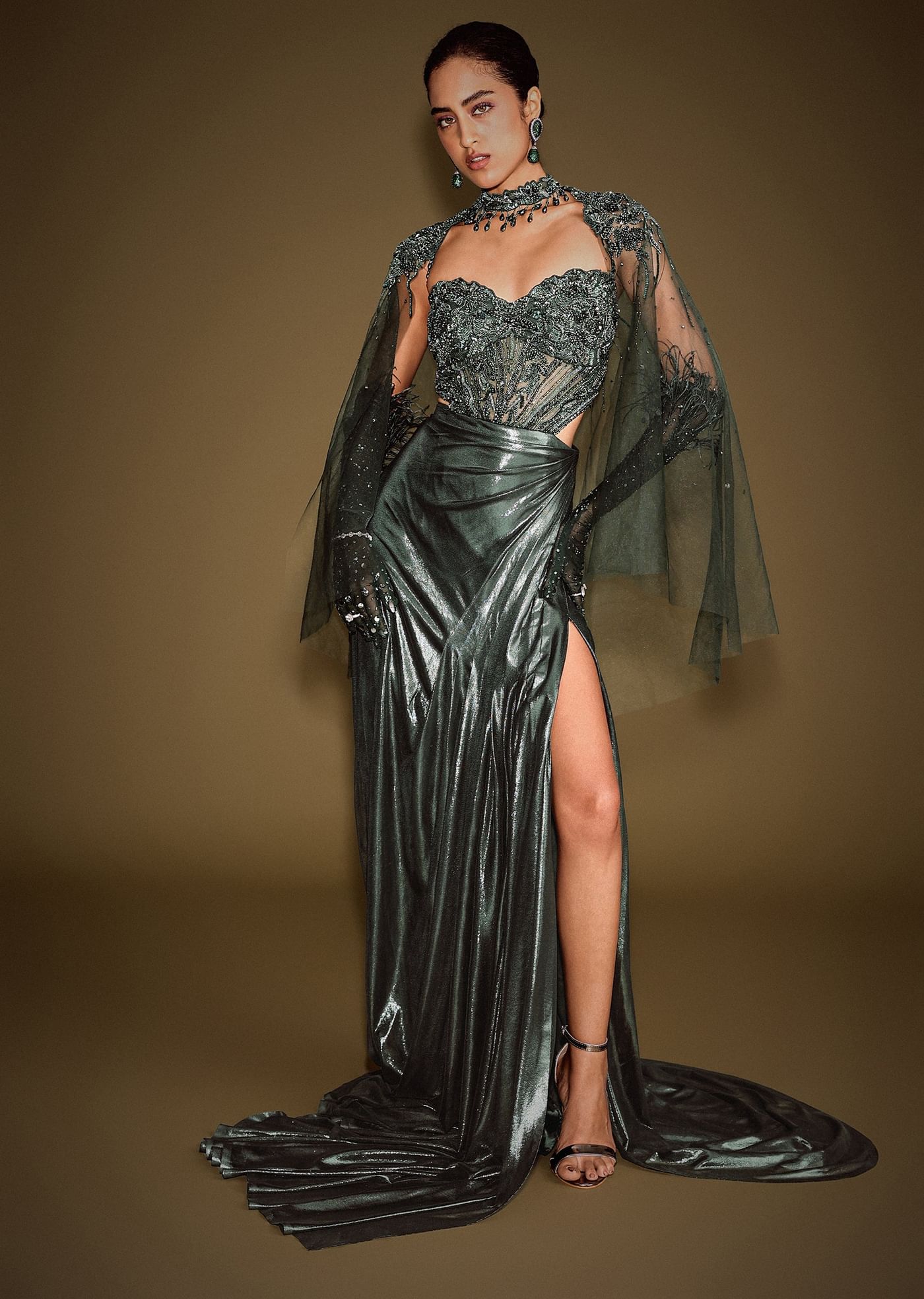 This striking dark green ensemble features a corset-style draped gown, exquisitely embroidered for a sculpted yet fluid silhouette. Paired with a structured short cape, the look blends contemporary elegance with... More Product Details