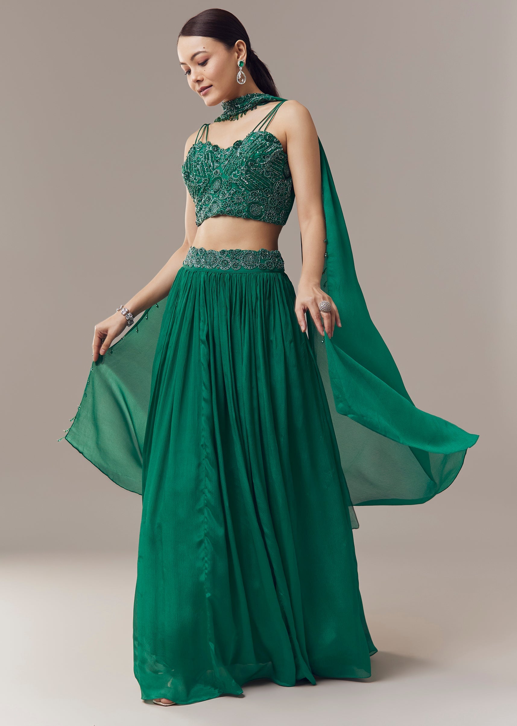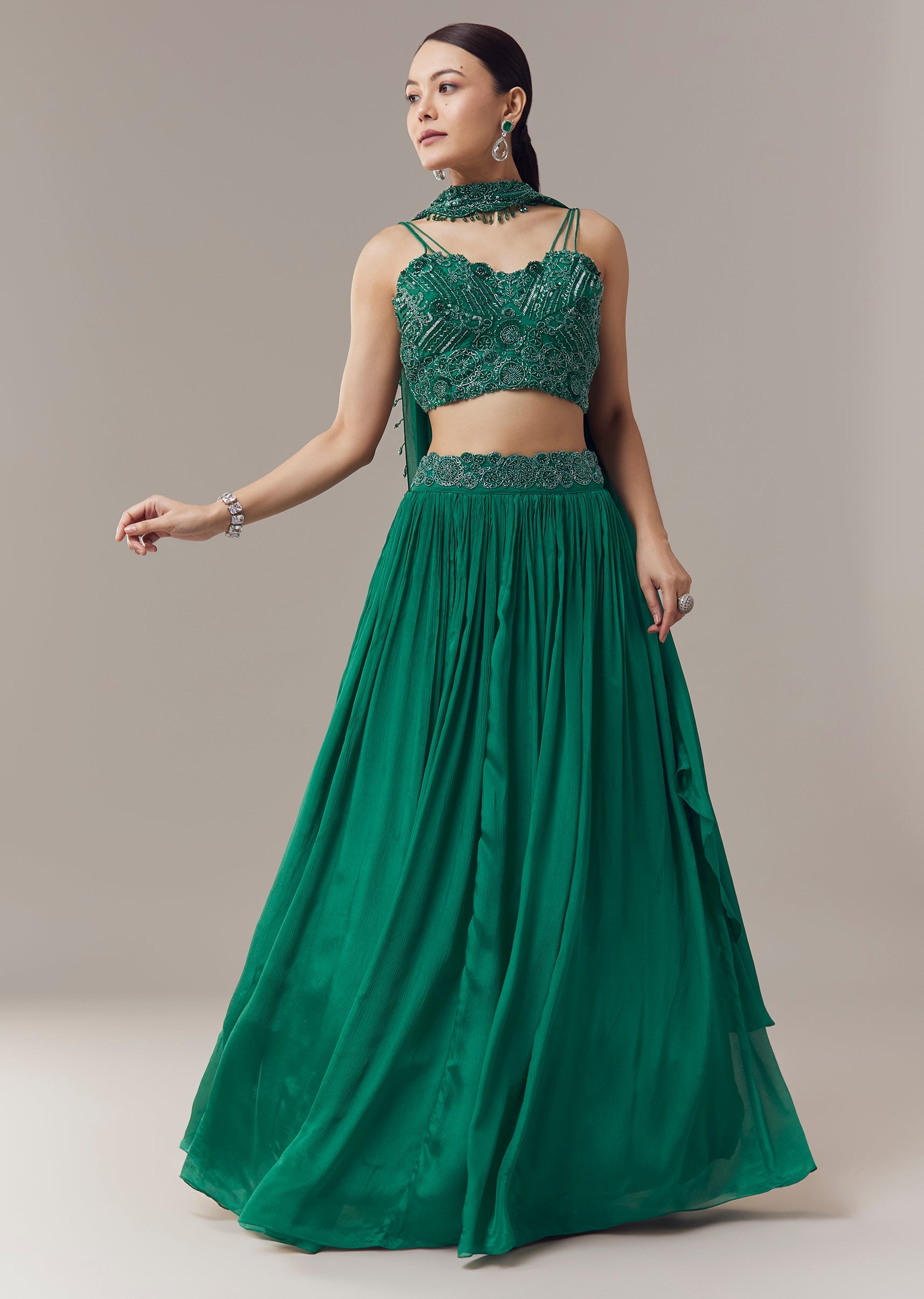 Elegant and festive, this dark green lehenga is crafted in soft chinon fabric for a comfortable and graceful fit. The choli features intricate beads, sequins, and cut dana embroidery, adding shimmer and refined texture to the ensemble. Designed for bridesmaids or wedding guest occasions, it pairs seamlessly with coordinating bottoms for a striking and contemporary festive look. Awarded as the Most Trusted Brand, we're delivering styles you love, just as promised.