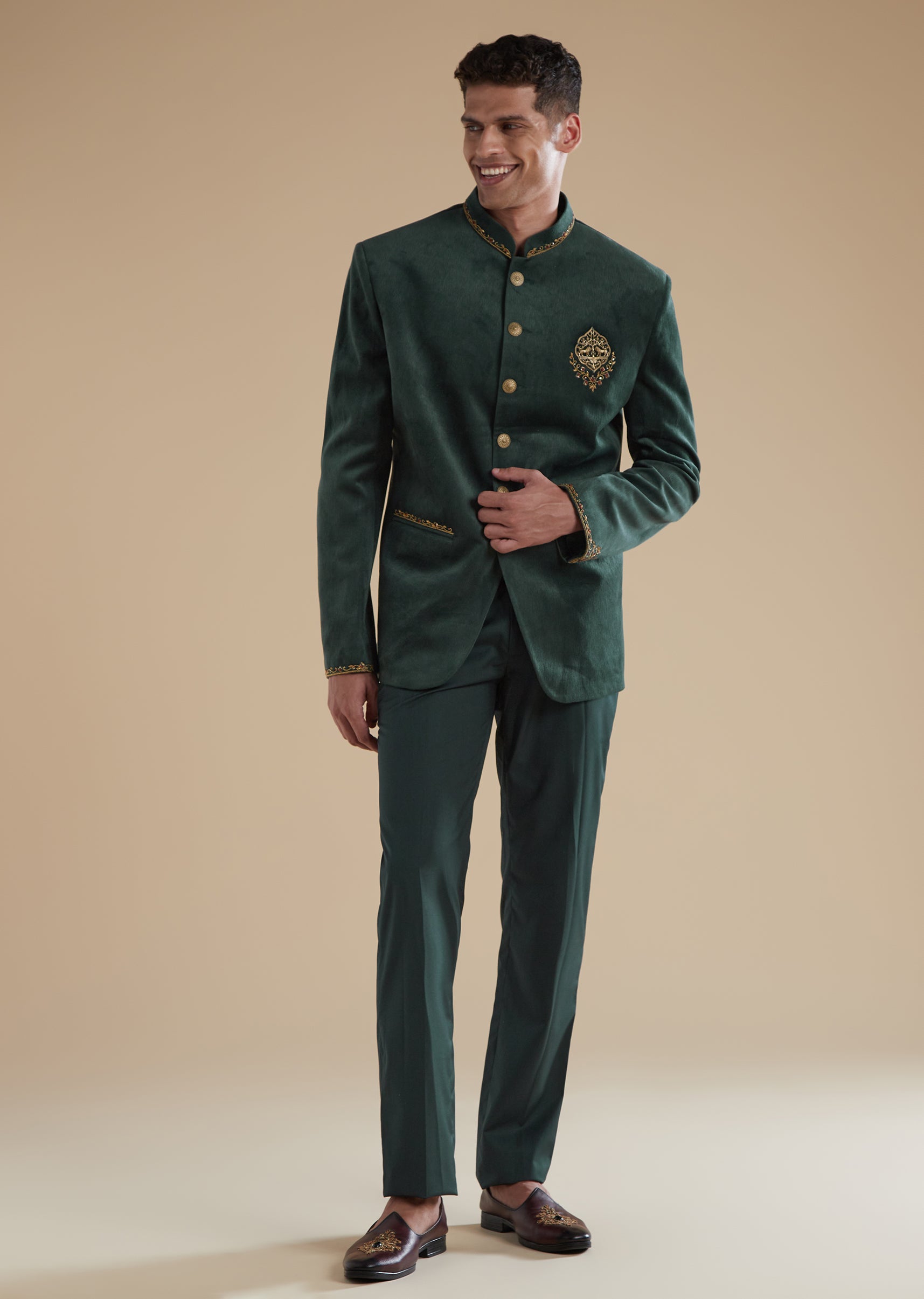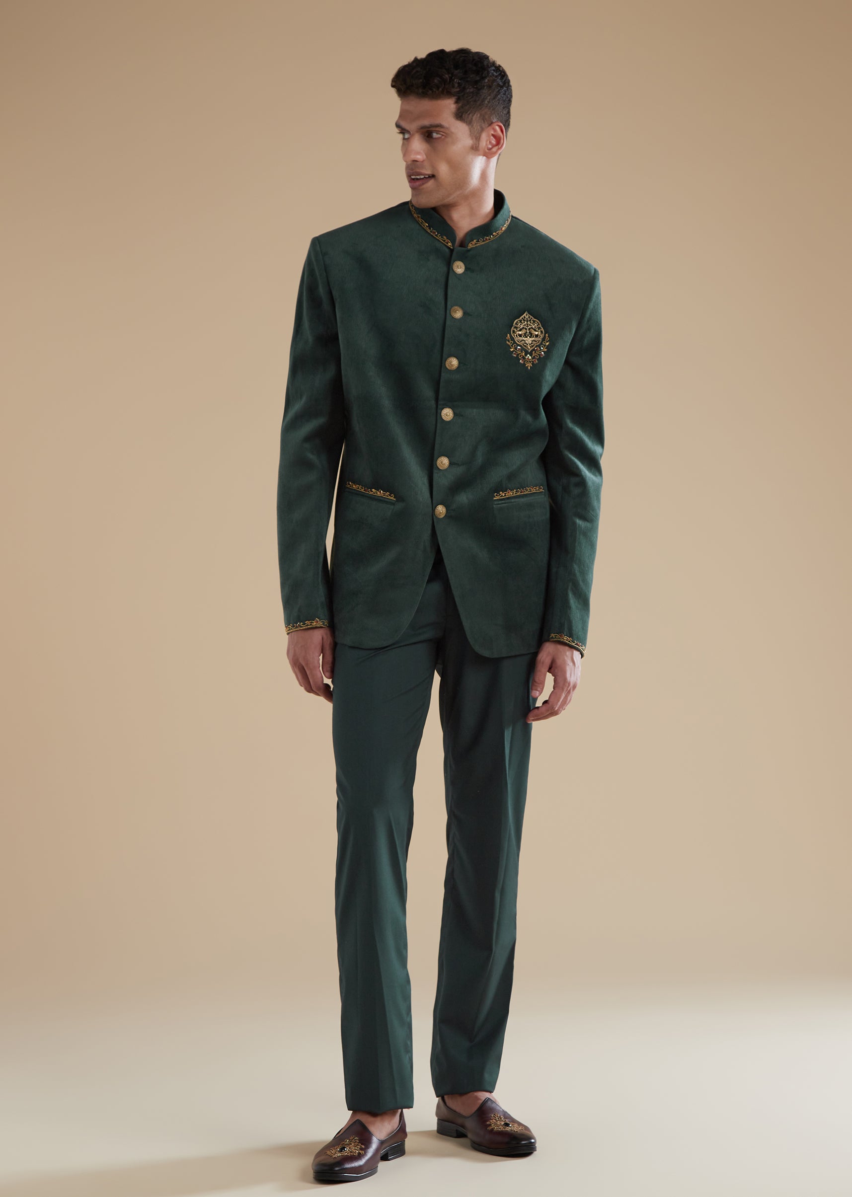 This dark green jodhpuris set offers a regal and sophisticated look ideal for sangeet and engagement functions. The design features intricate metal and thread resham detailing complemented by a striking lion brooch on the chest along with refined embroidery on the pocket and collar. The mandarin collar and full sleeves maintain a traditional polished silhouette. Both the top and bottom closure are finished with front buttons and the ensemble is completed with coordinated pants making it suitable for a groomsman or the grooms father.