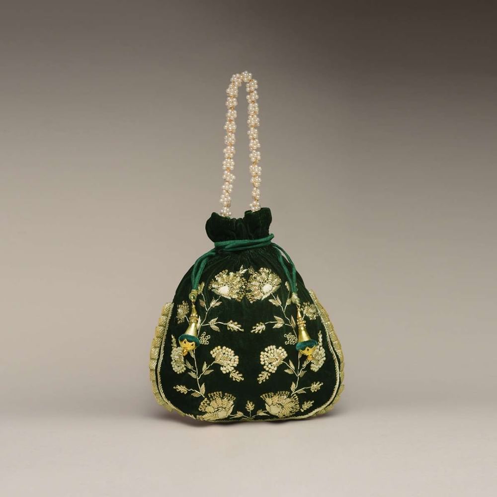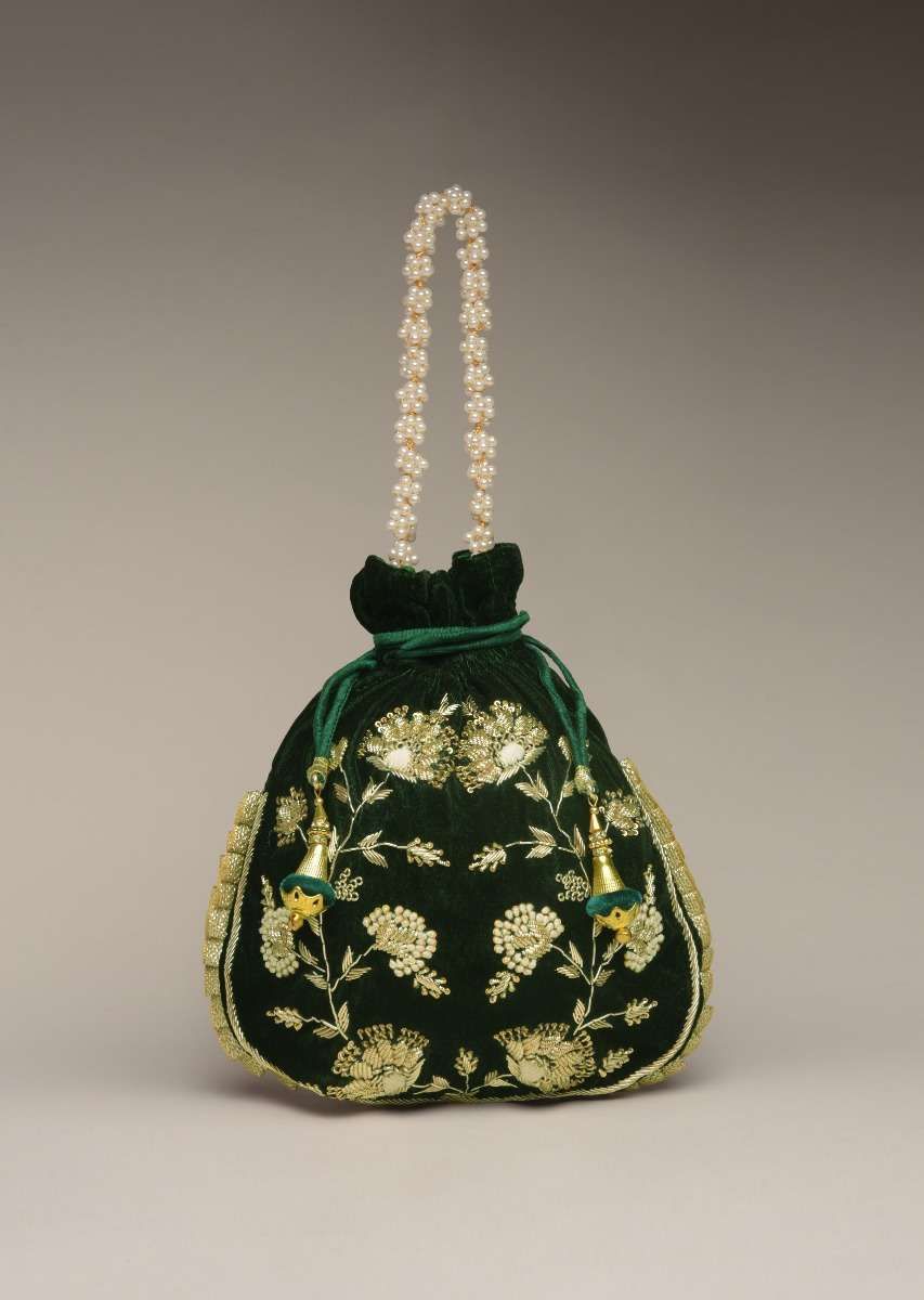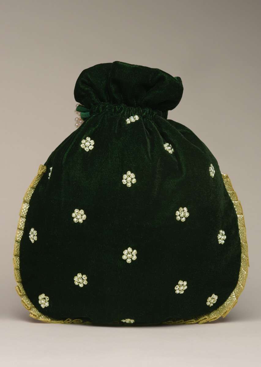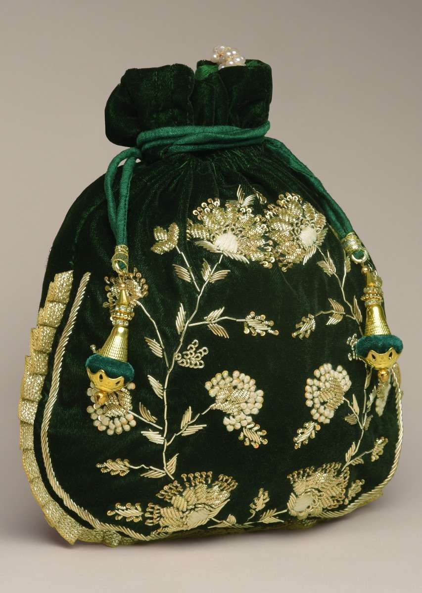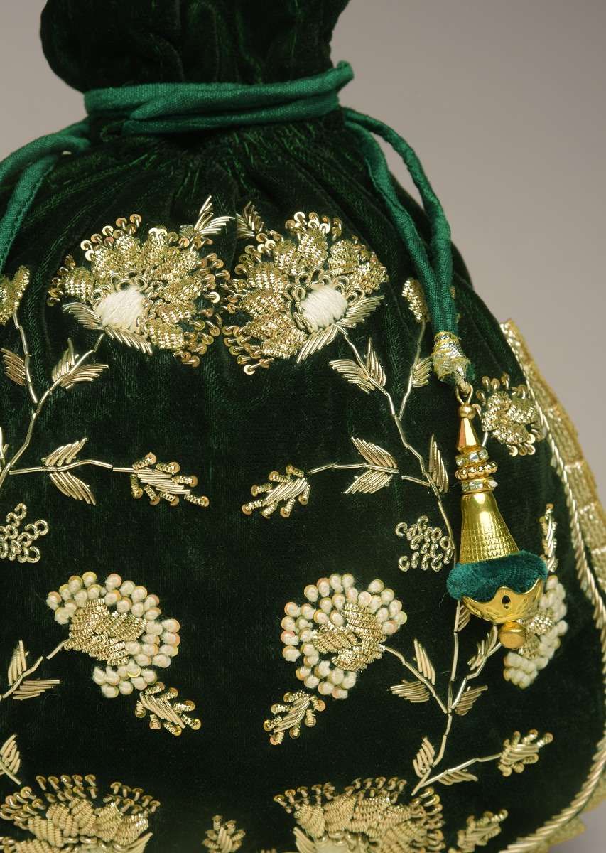 Dark Green Potli Bag In Satin With Hand Embroidered Floral Design Using Sequins And Zardosi