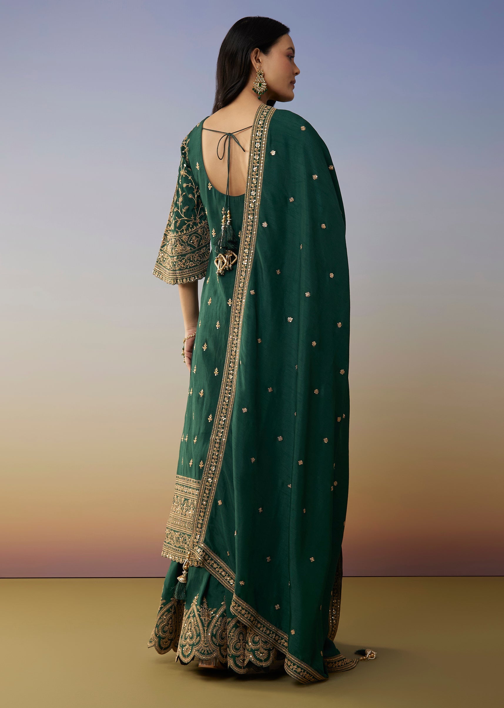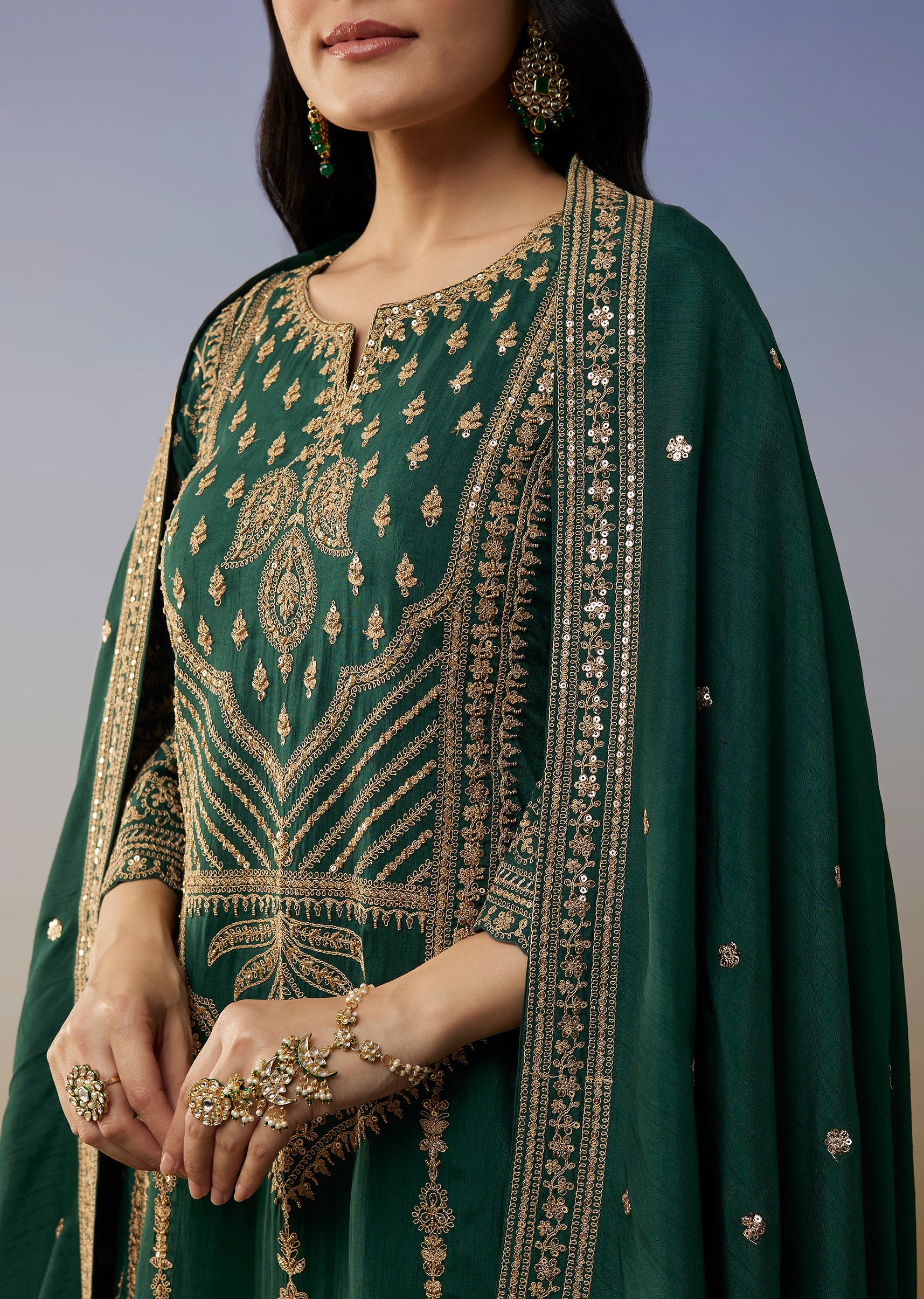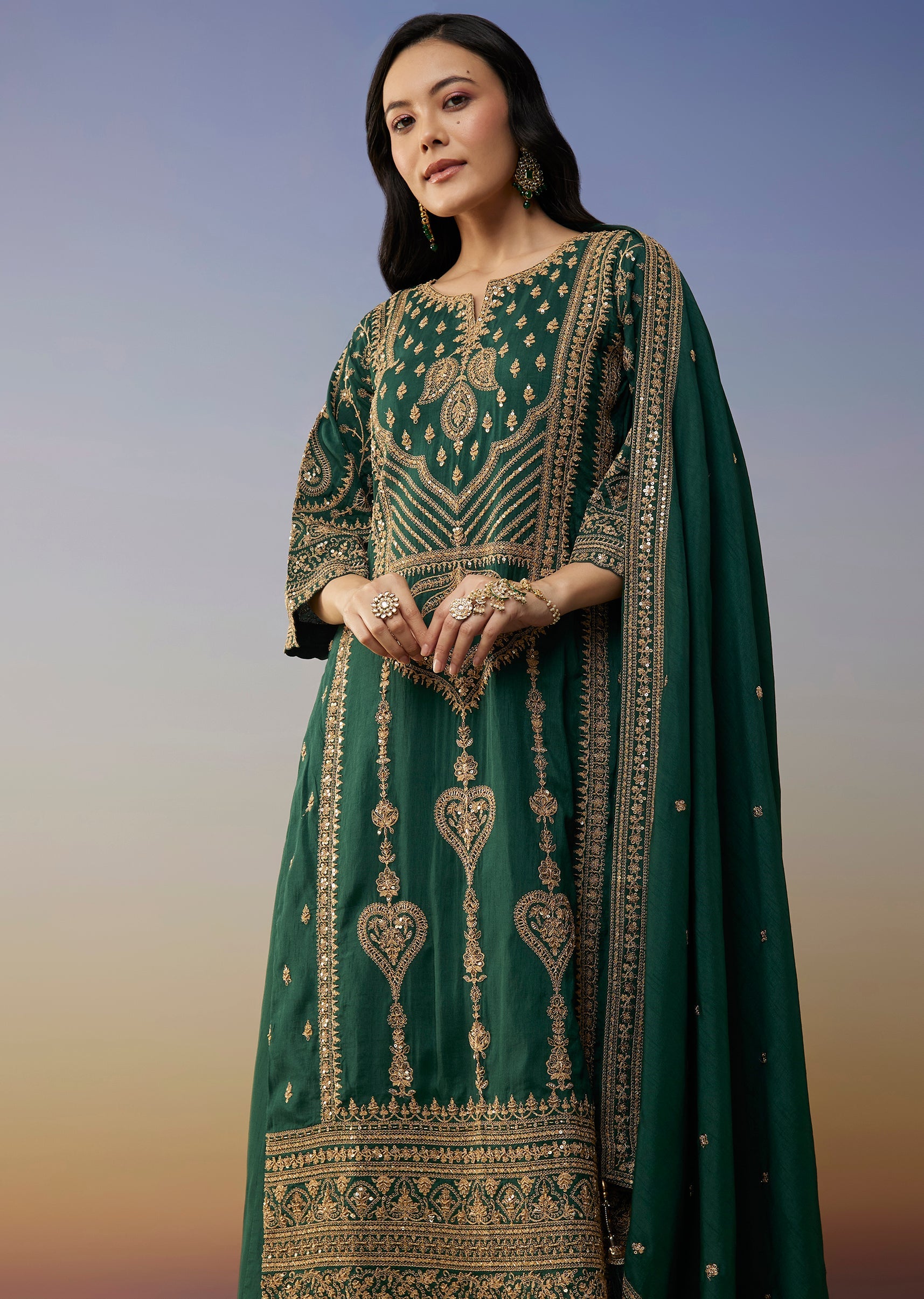 Dark Green Silk Palazzo Suits with Zari Thread Sequins Work