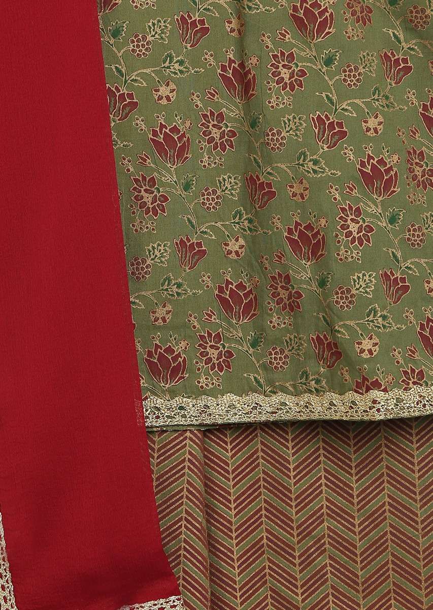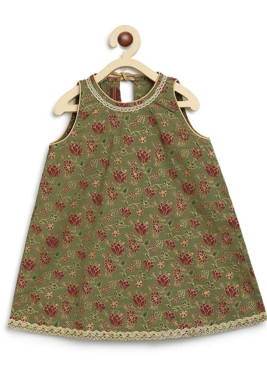 Kalki Girls Dark Green Suit Set In Cotton With Printed Floral Jaal And Lace Work By Tiber Taber