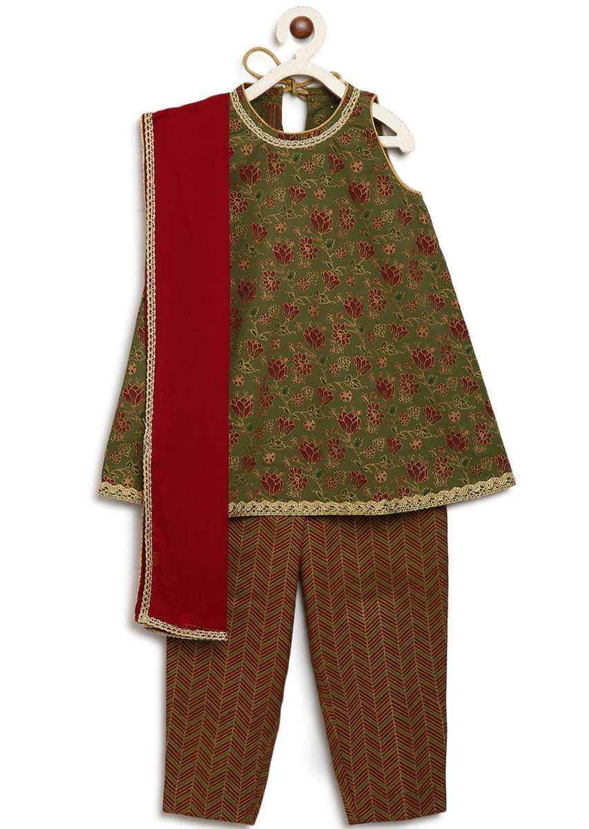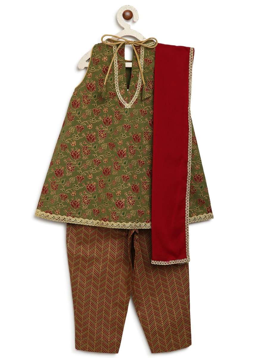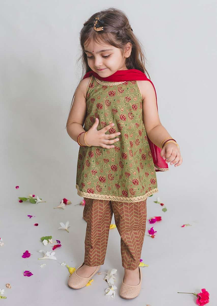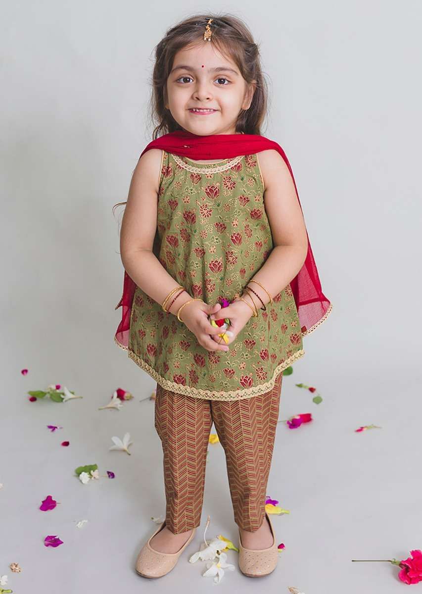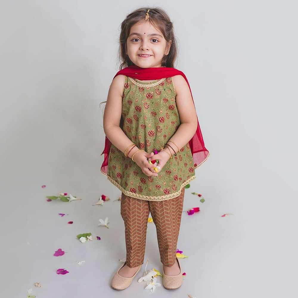 The uber chic sleeveless top paired with sleek pair of trousers and a dupatta to match is a must have in the little diva's wardrobe. Top and pants are made in gold printed pure cotton and maroon dupatta in the softest viscose chiffon (natural fabric) specially for your baby's tender skin. Adorned with delicate laces around the neck and hem to give the perfect festive look for all special occasions and days when you just want to doll her up. The relaxed silhouette ensures utmost comfort for the little one so the best smile is always on. Awarded As The Most Trusted Brand We'Re Delivering Styles You Love Just As Promised.