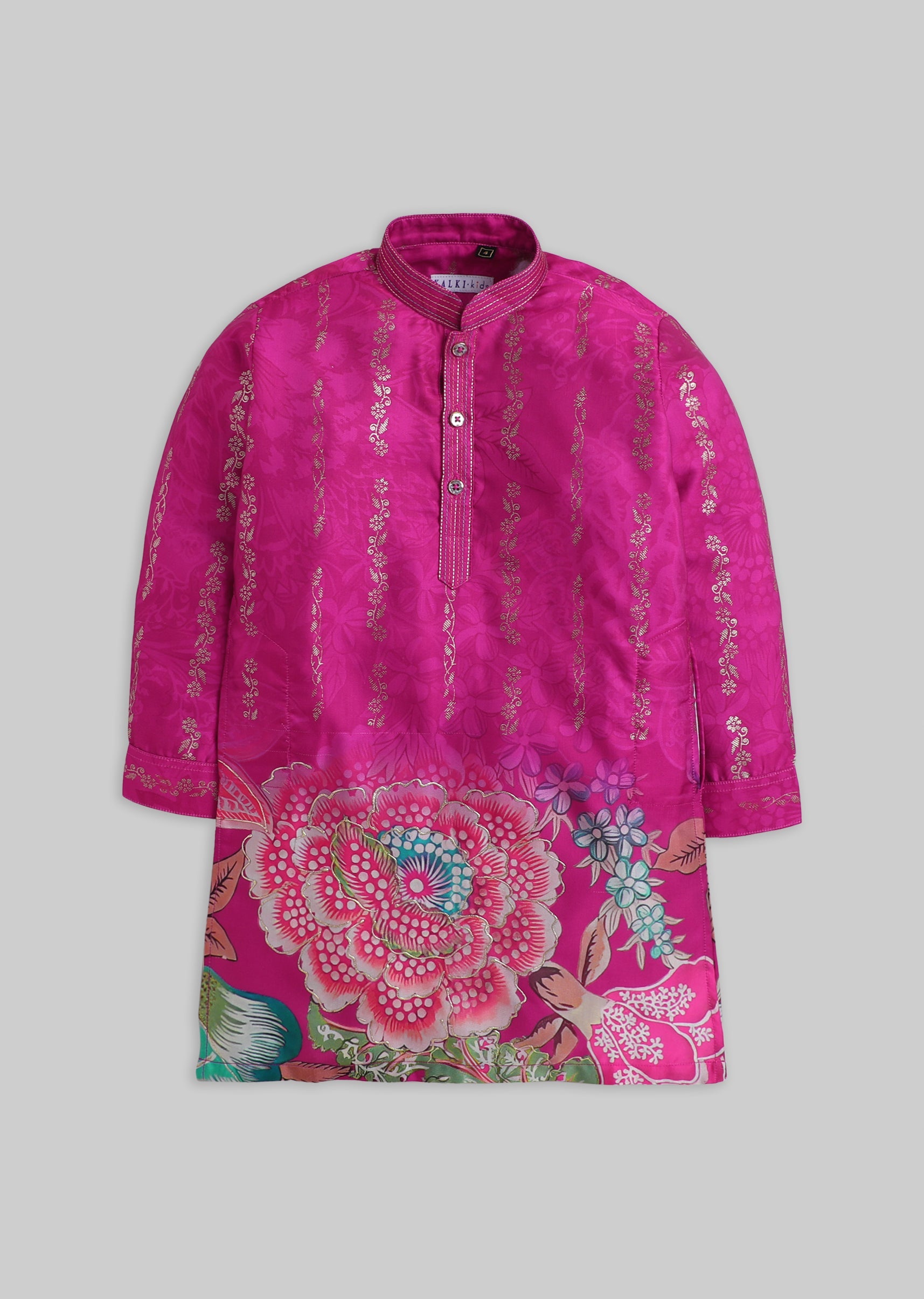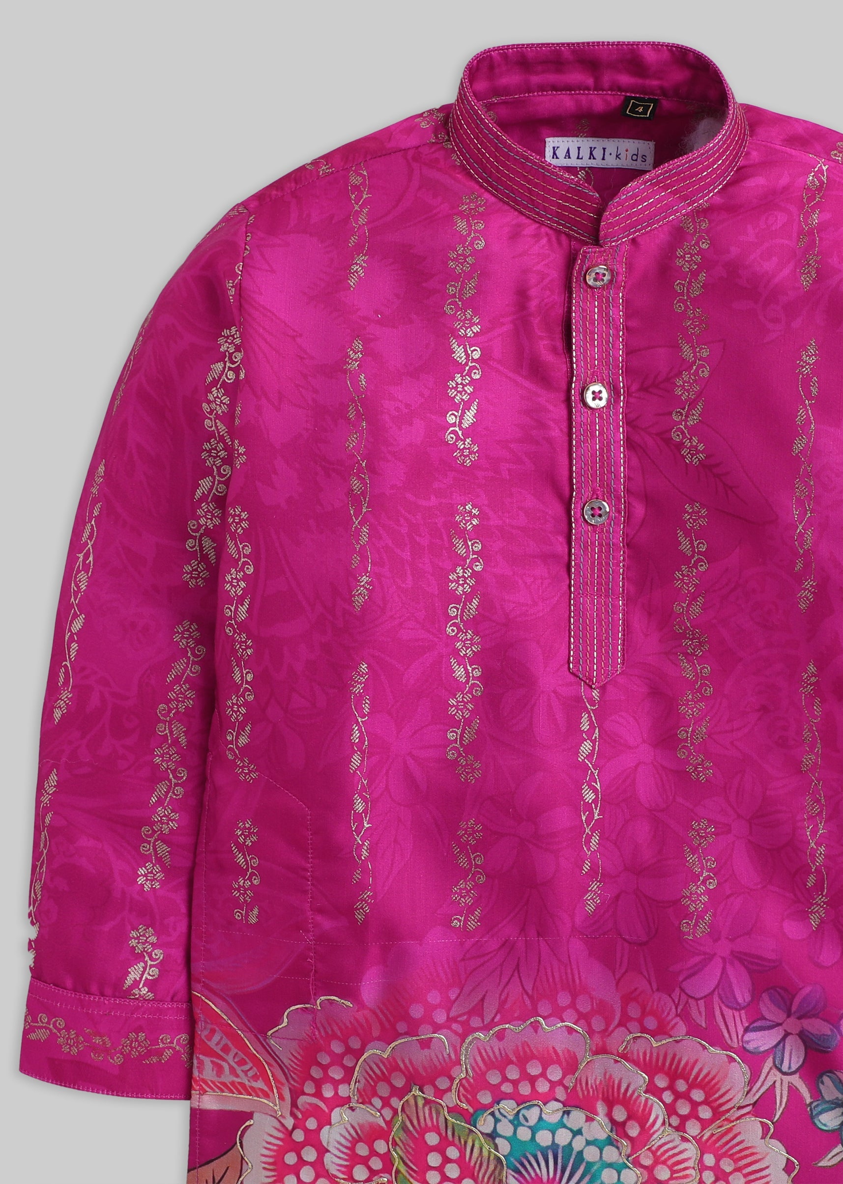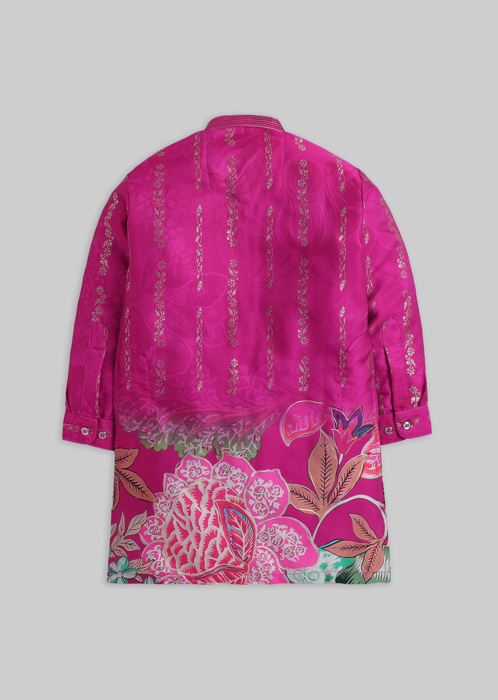 A festive boys’ kurta set featuring floral foil detailing on a pink silk base, finished with a mandarin collar and button front. Comes with matching pants for an easy complete... More Product Details