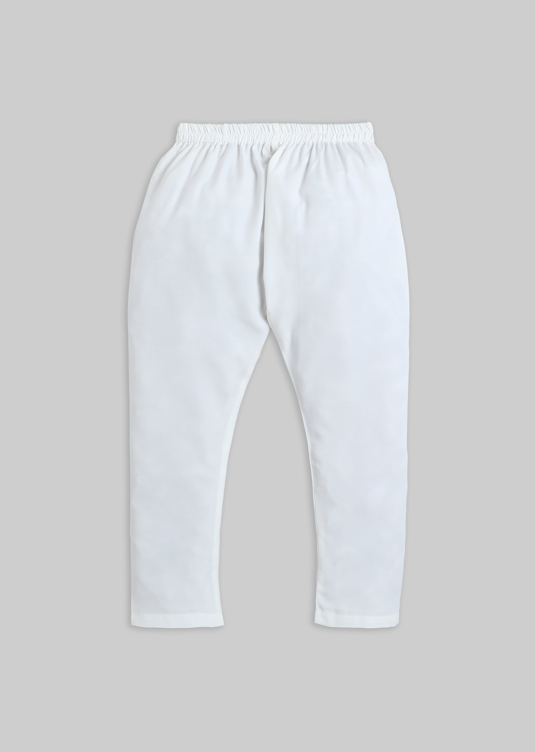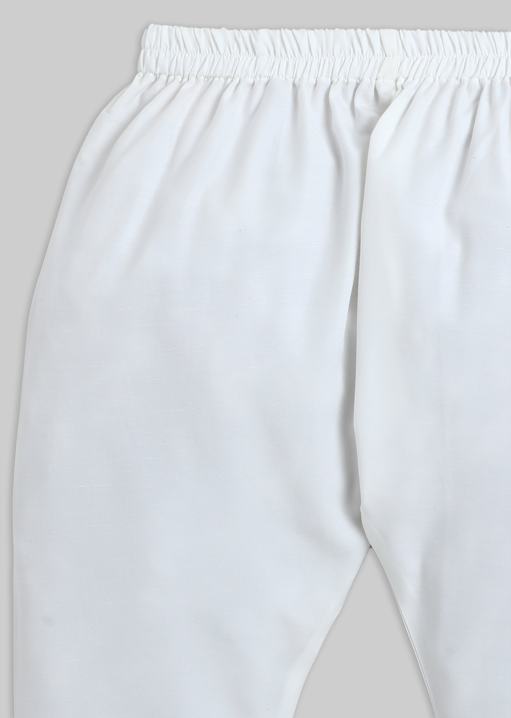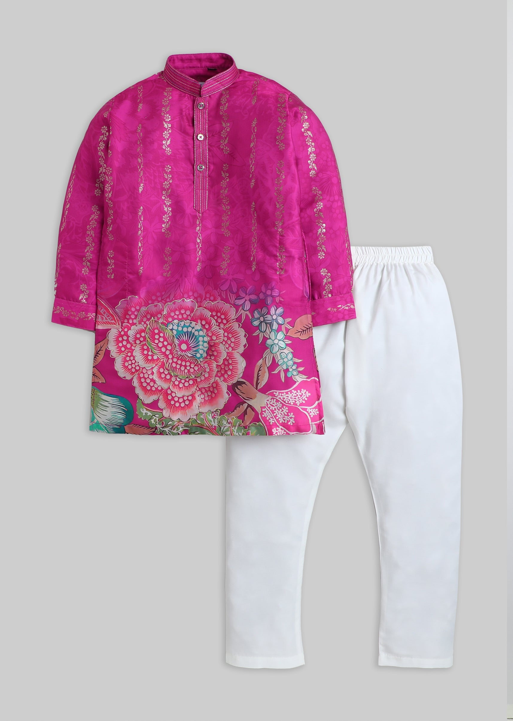 A festive boys’ kurta set featuring floral foil detailing on a pink silk base, finished with a mandarin collar and button front. Comes with matching pants for an easy complete... More Product Details