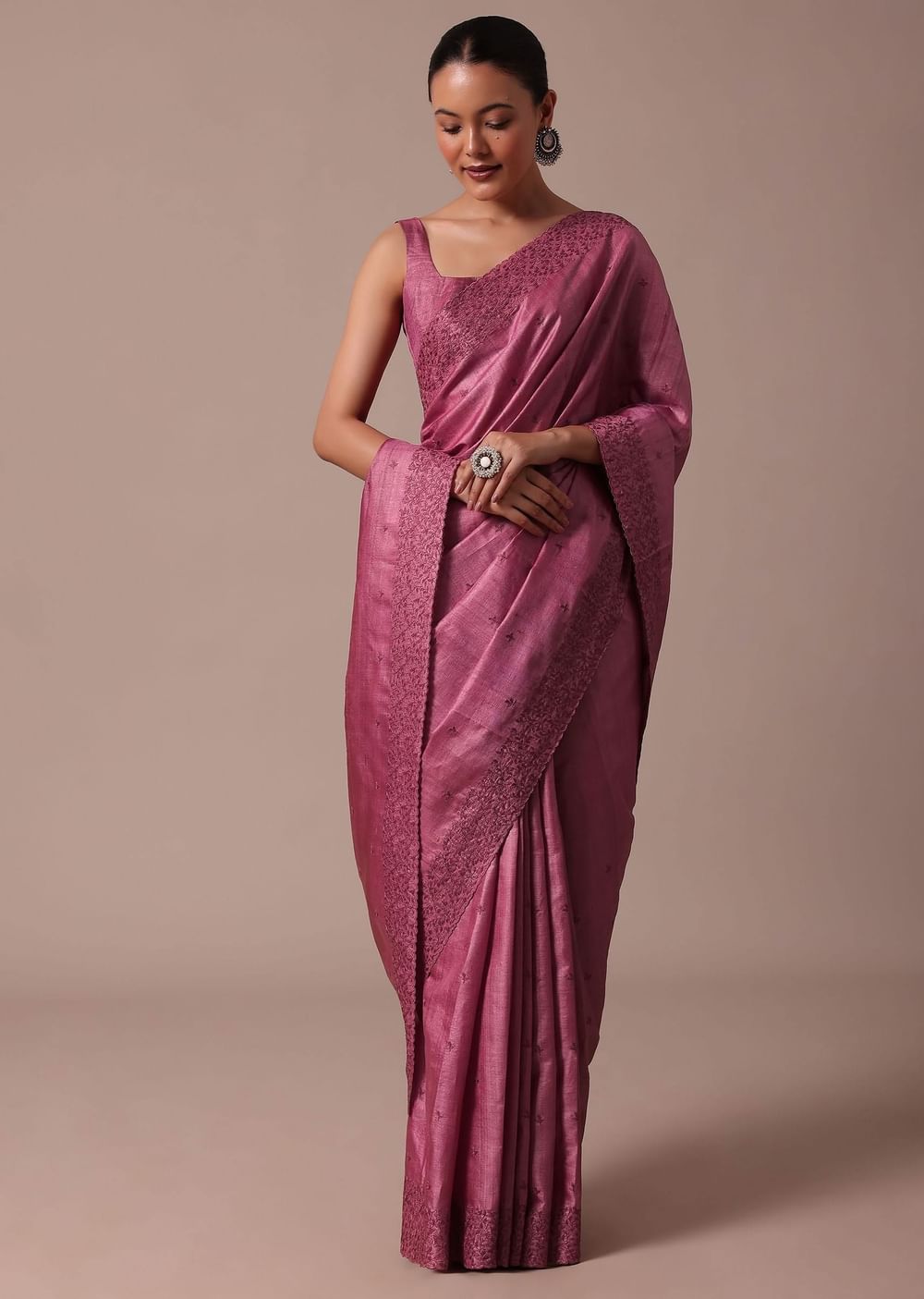 Indulge in grandeur with this dark pink saree embellished with resham embroidery. This saree is made from a tussar silk base. The saree is paired with an unstitched blouse. Style up in this outfit for the reception and wedding ceremony. Awarded as the Most Trusted Brand, we're delivering styles you love, just as promised.