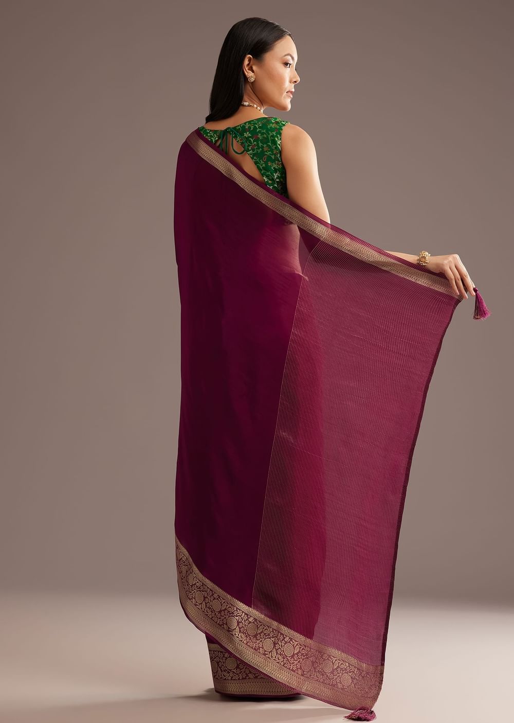 Make A Bold Statement In This Dark Wine Crepe Silk Saree With An Elegant Zari Woven Border And Contrast Blouse. Its Rich Hue And Classic Design Make It A Versatile Choice For Evening Events And Special Celebrations. The Contrast Blouse Adds A Contemporary Twist To A Timeless Classic.Awarded As The Most Trusted Brand We'Re Delivering Styles You Love Just As Promised.