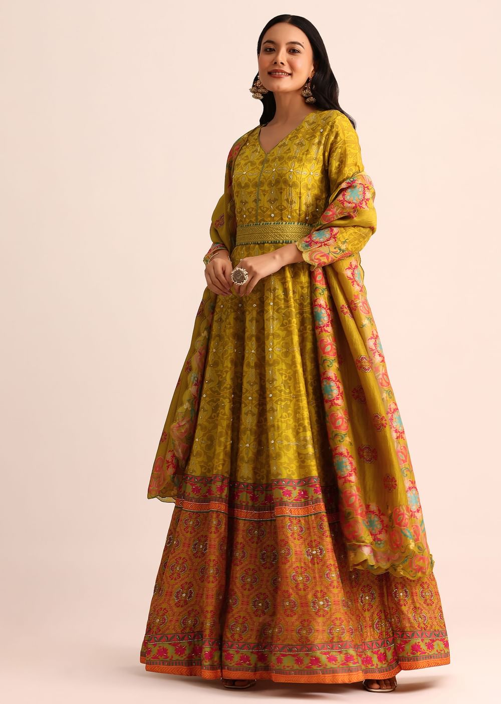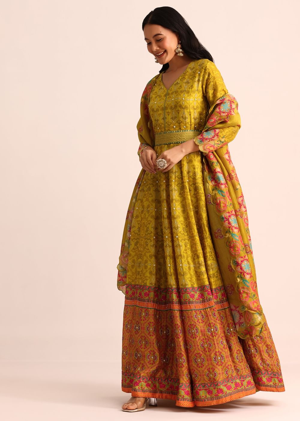 Dark Yellow Embroidered Chanderi Anarkali Suit With Dupatta And Belt