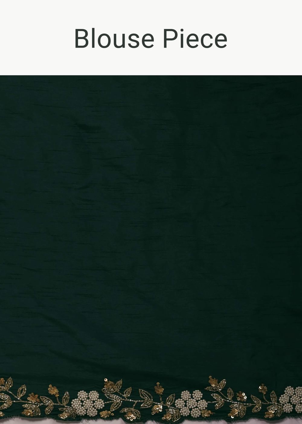 Presenting our deep green organza saree, showcasing a captivating assortment of vibrant shades and mesmerizing floral designs. Decorated with exquisite moti and cutdana embroidery on the border, complemented by scattered cutdana butti throughout, this saree effortlessly combines traditional allure with a modern twist. EVENT - The saree is perfect for all festive events. The saree comes with a matching unstitched blouse. NOTE - The blouse worn by the model is a part of our home production. Awarded as the Most Trusted Brand, we're delivering styles you love, just as promised.