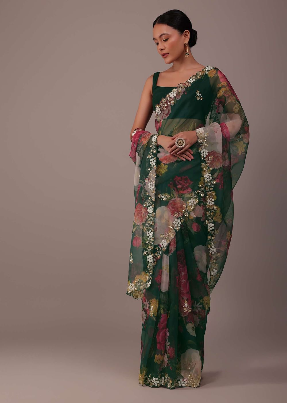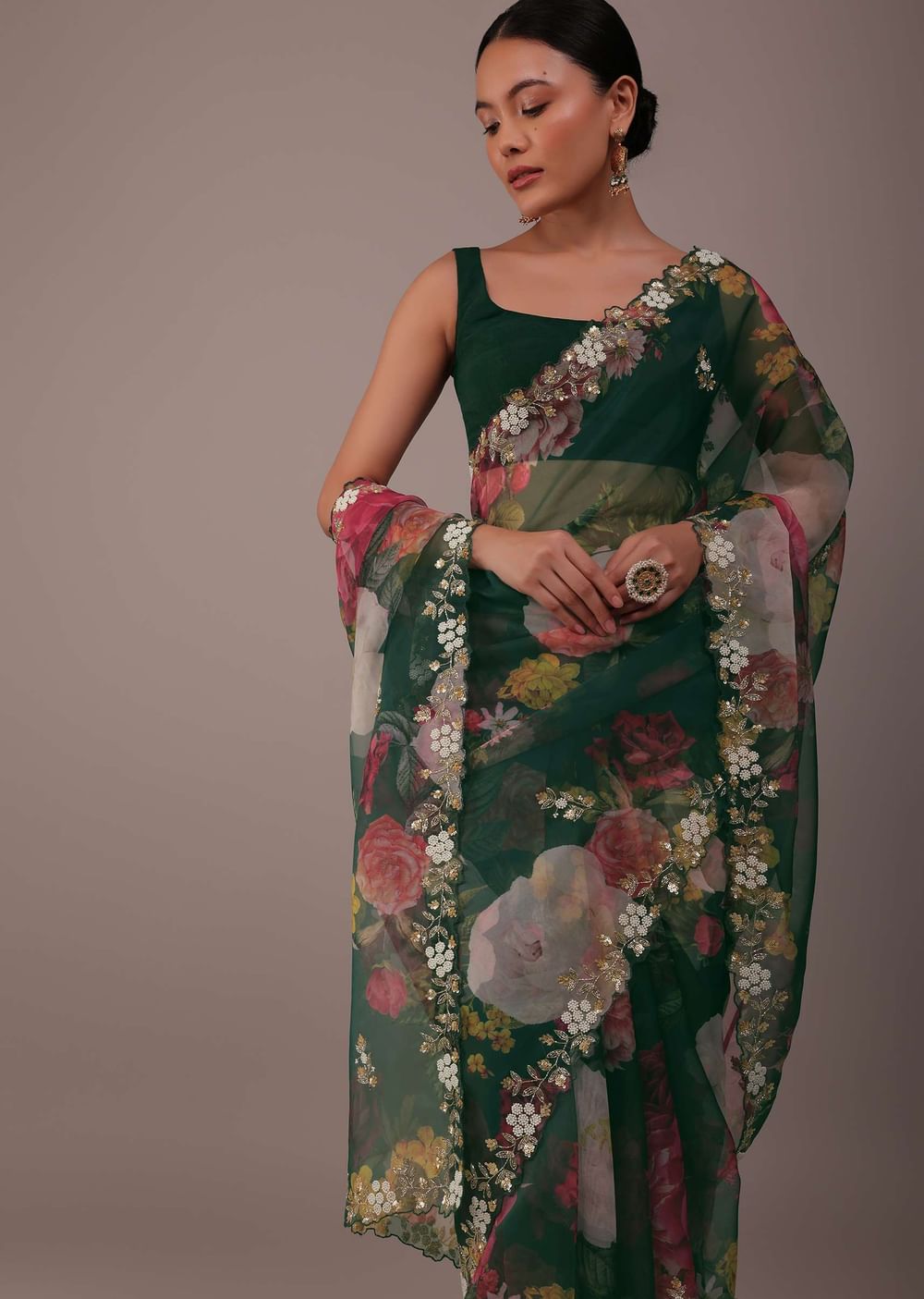 Deep Green Floral Printed Saree In Organza With Cut Dana Butti All Over